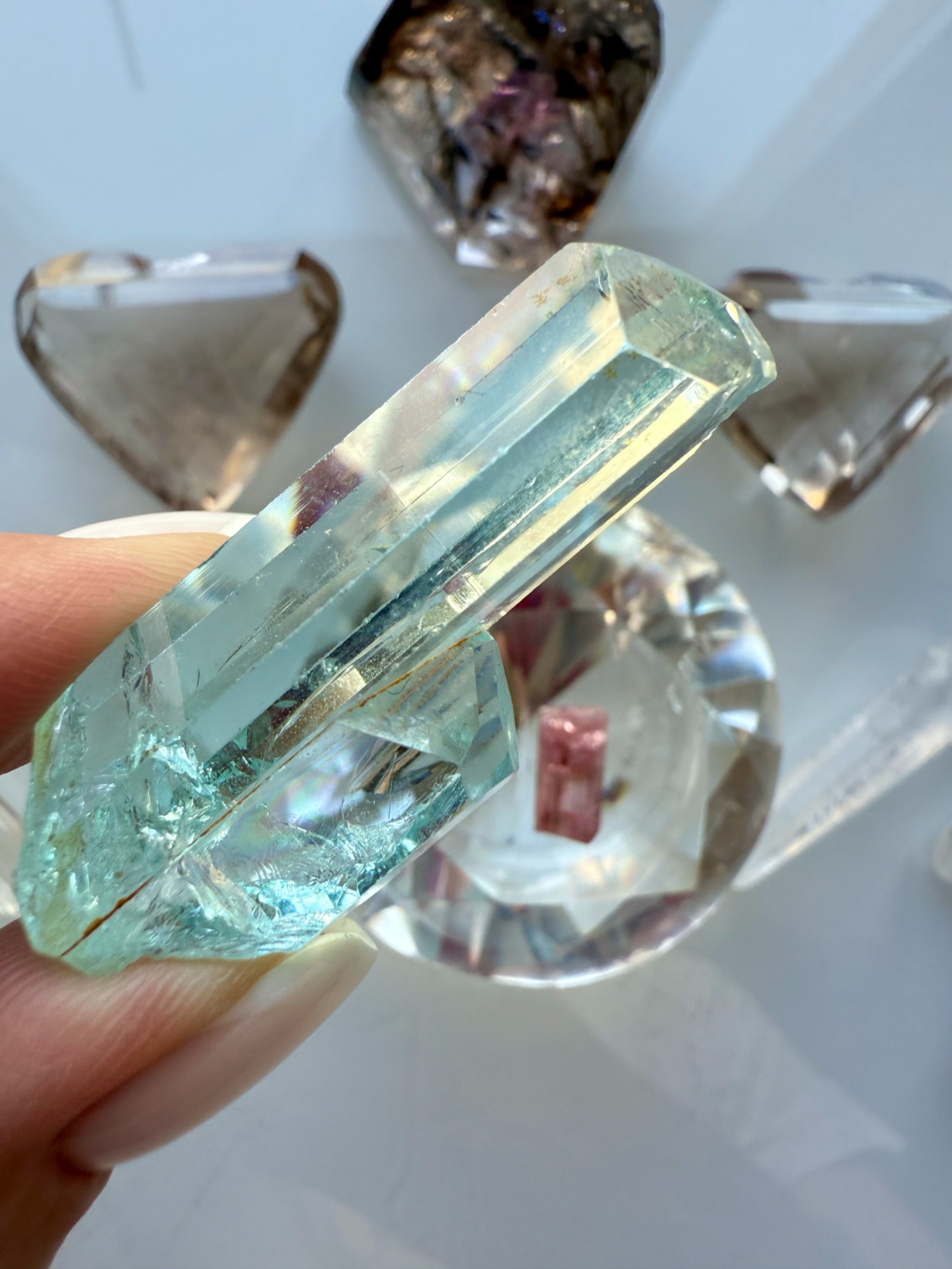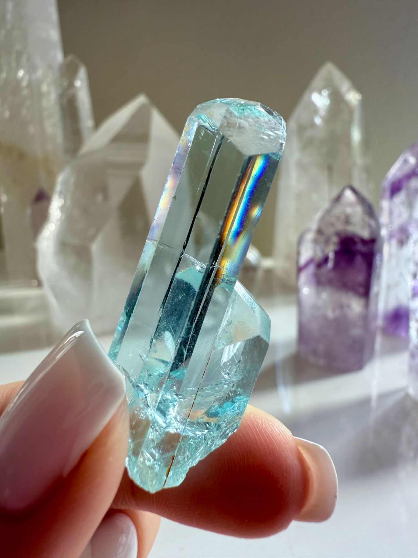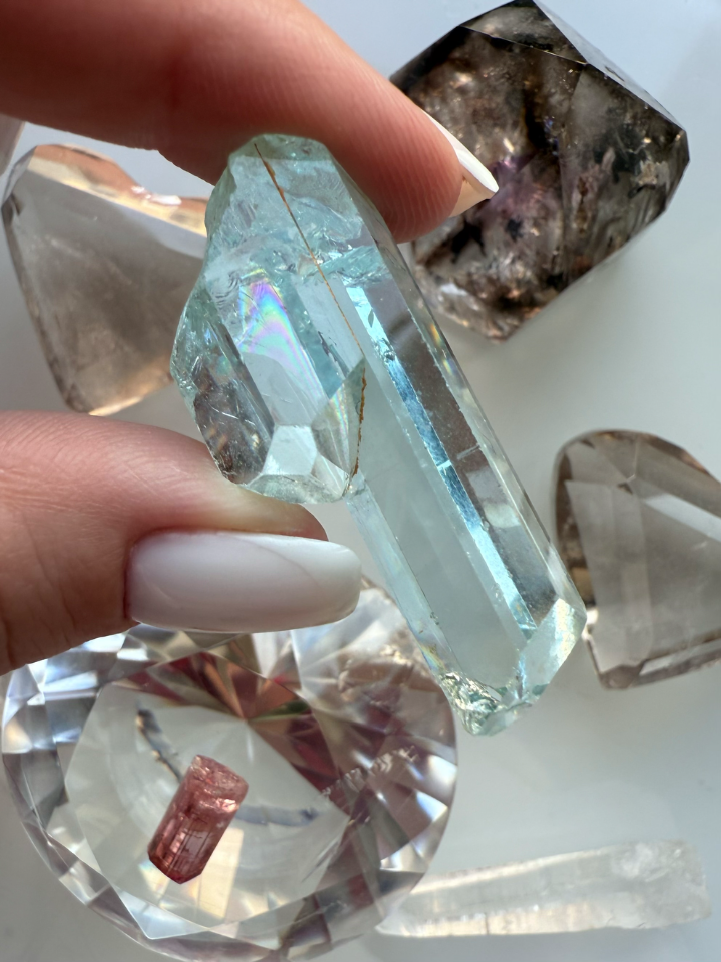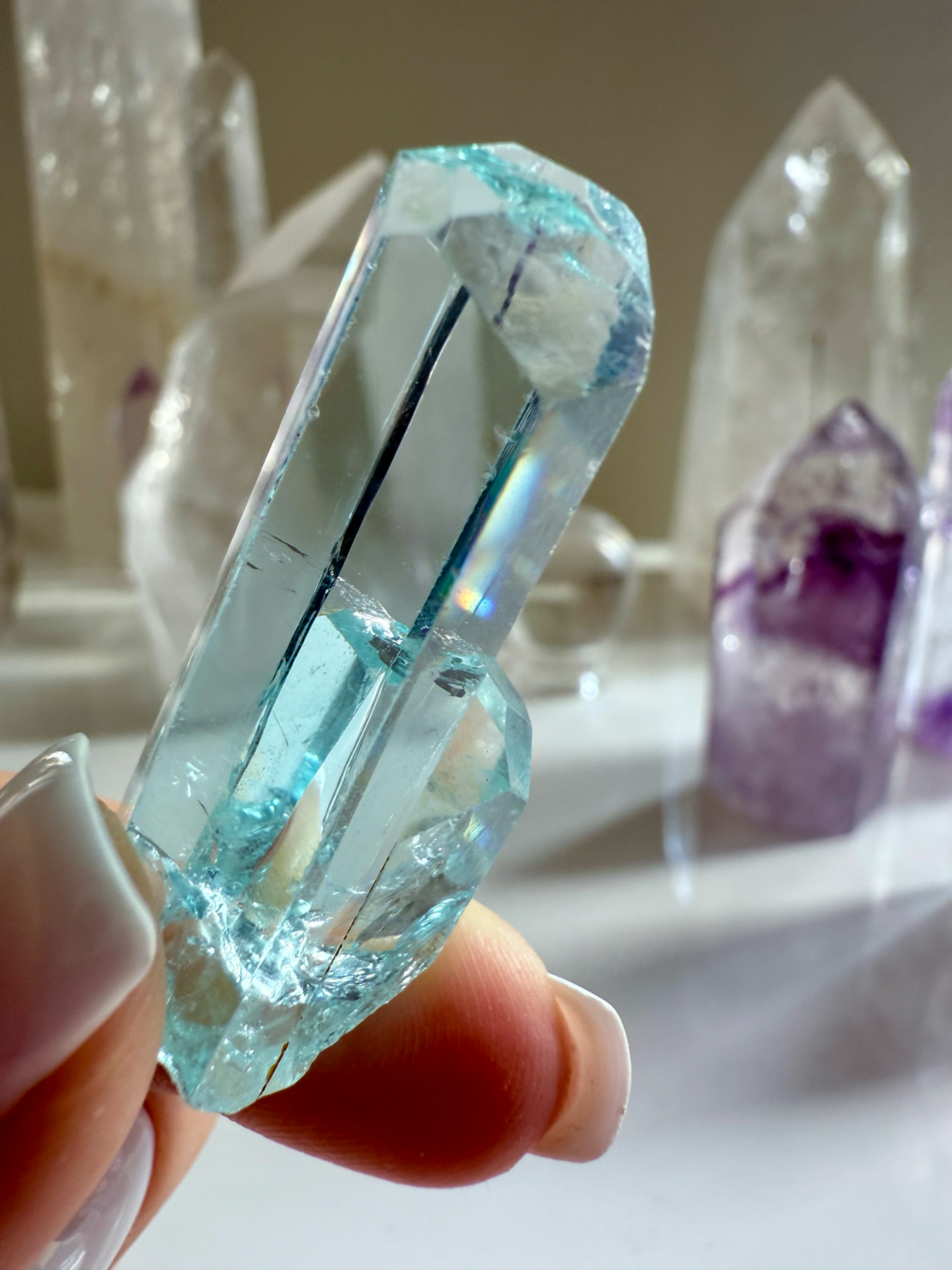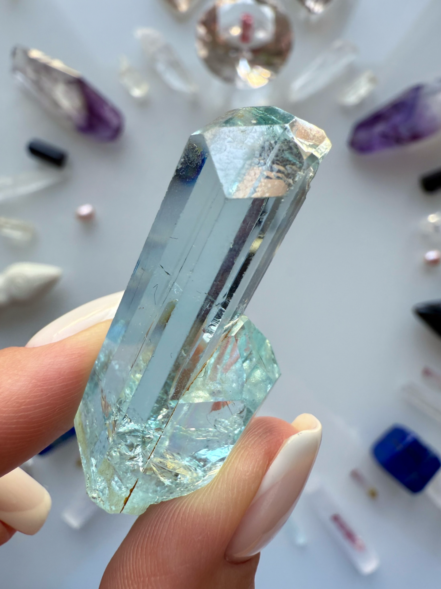 Absolutně výjimečný krystal akvamarínu, světelné naprosto průhledné a zářící kvality jako klenot, který je v malé velikosti, ale brutální laserové energie. Dá se i vhodně zadadit do nějakého rituální šperku...