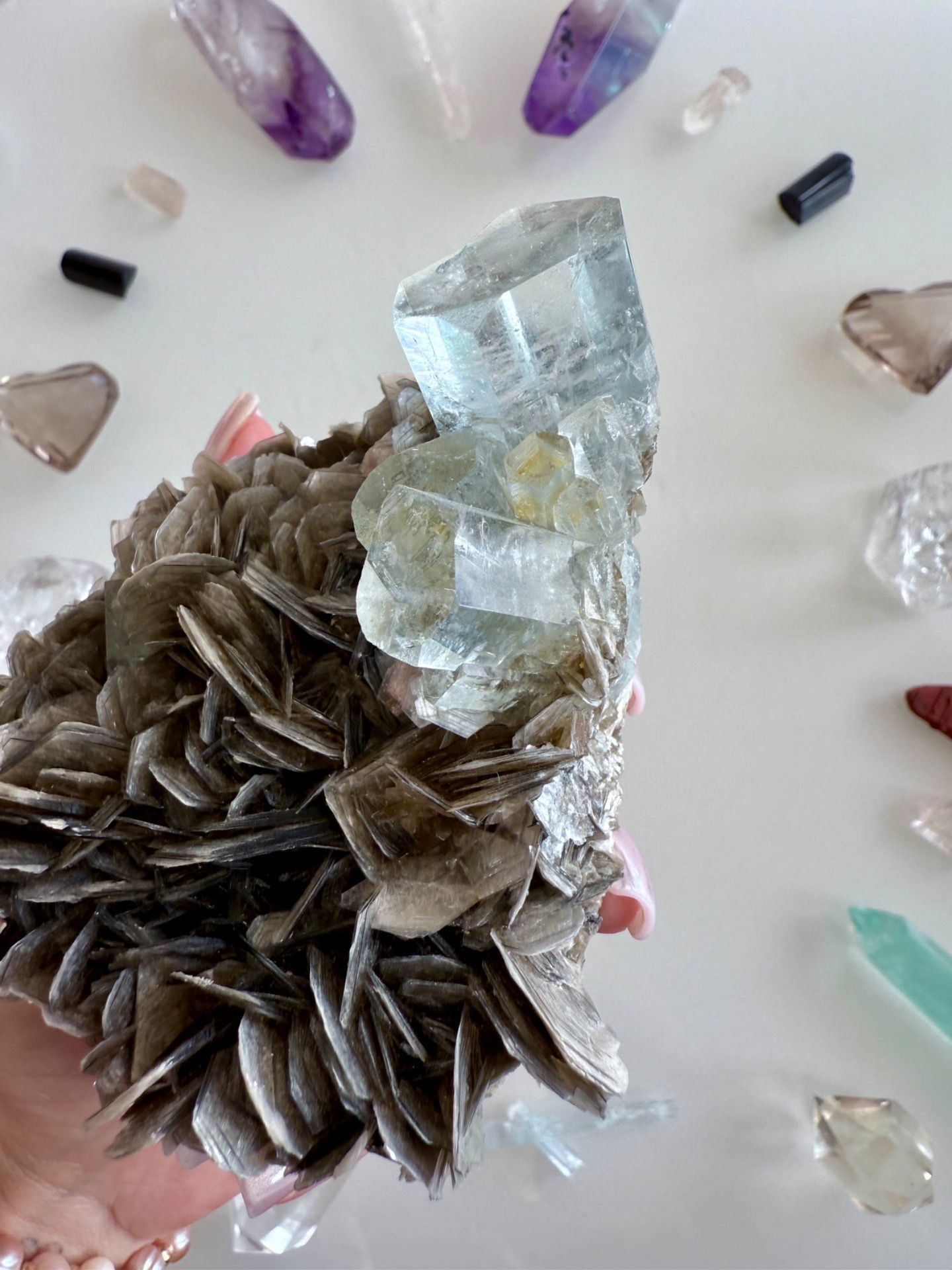 Akvamarínová drůza se stříbrným muskovitem. Je to zároveň drůza, kde v jednom z krystalů je aktivovaná voda, jedná se o enhydro krystal.