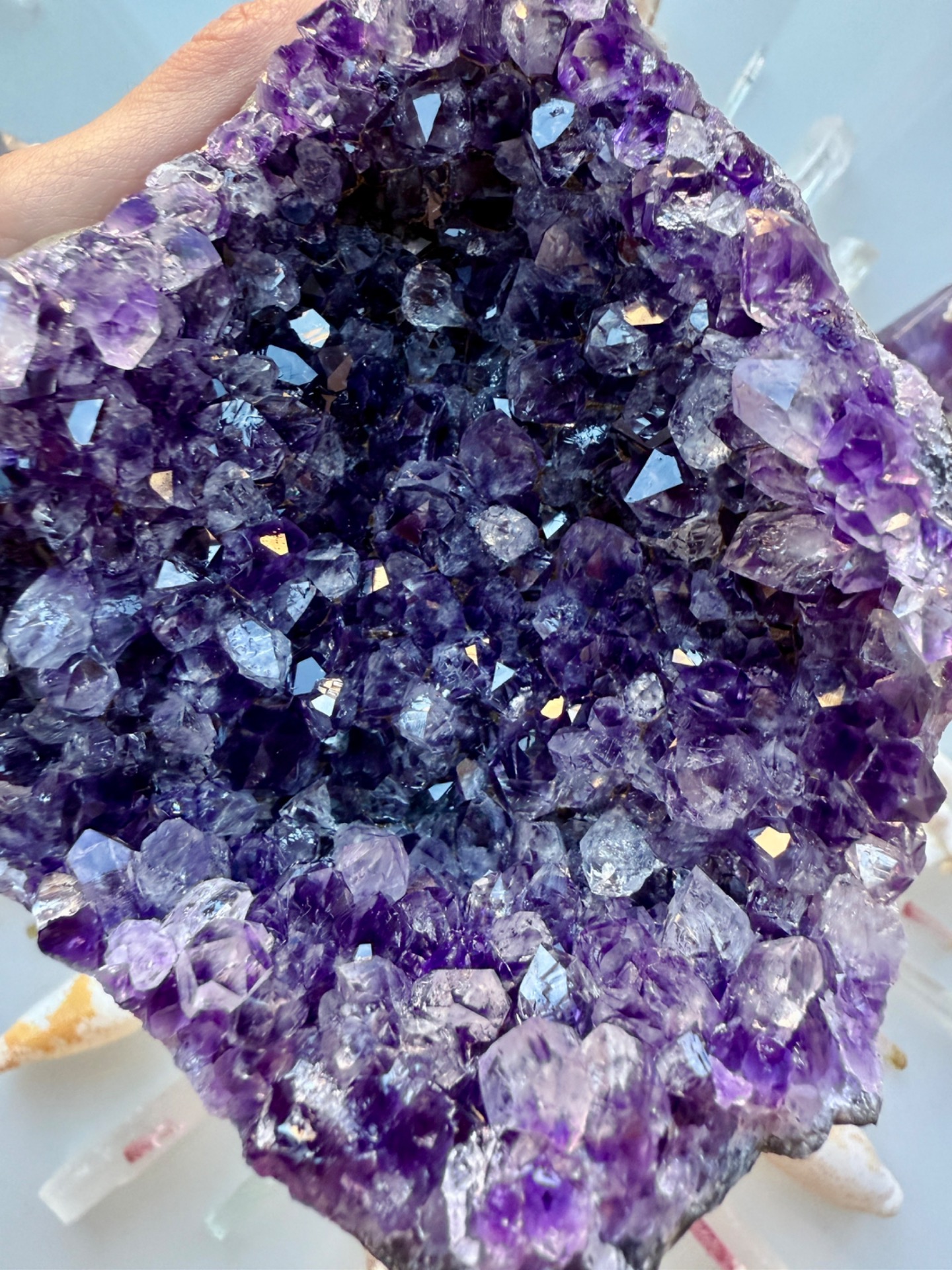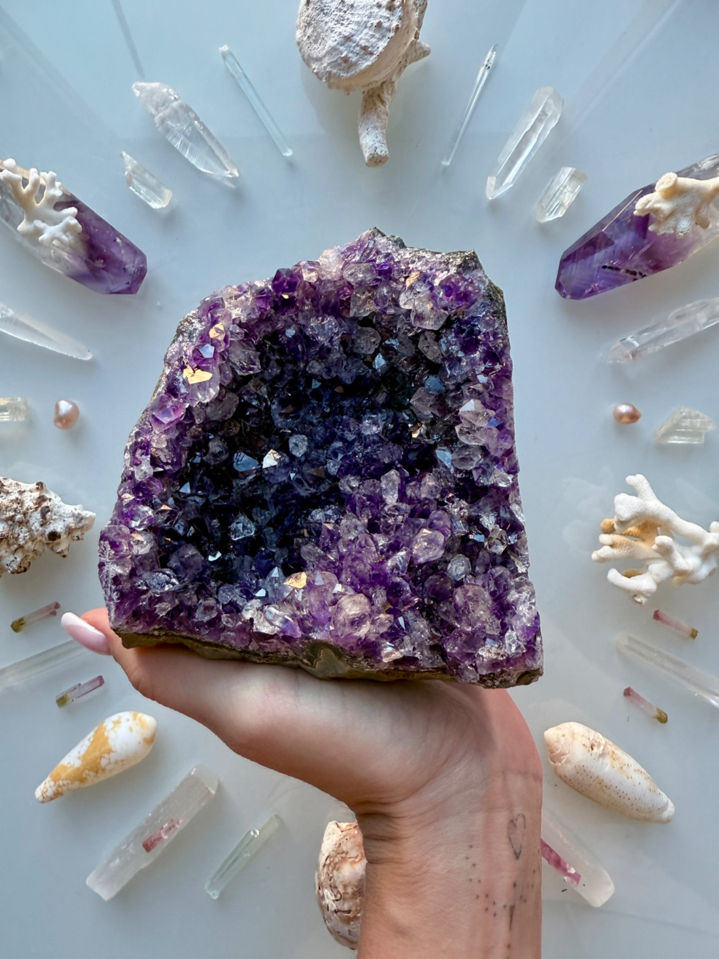 Nádherná stojící drůza hlubokého tmavého ametystu vhodná na oltář nebo do prostoru pro zvýšení vibrací a předání duchovních energií.