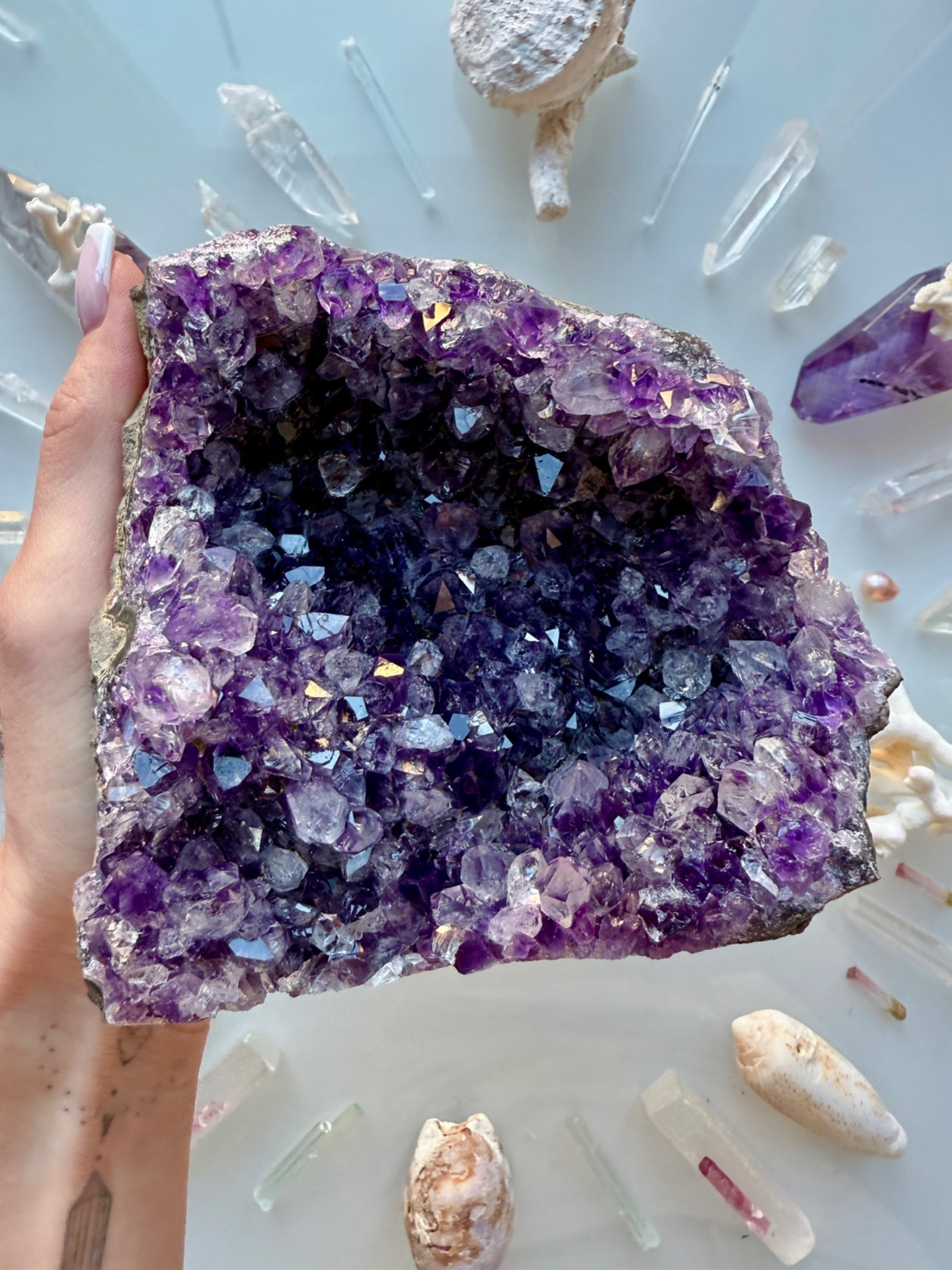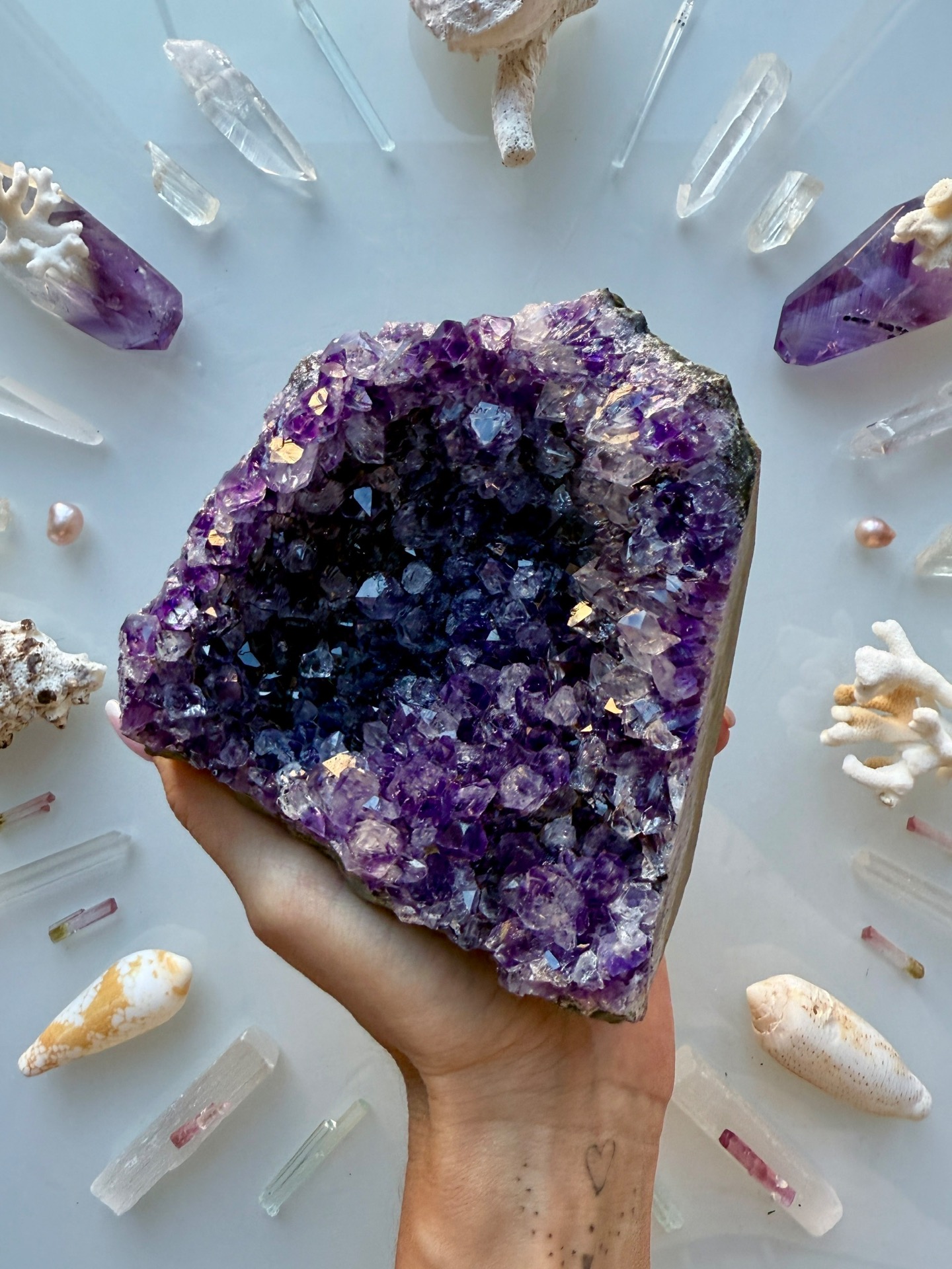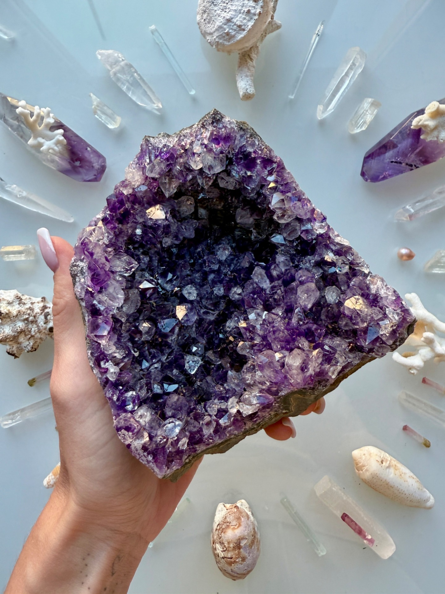 Tento krystal z Uruguaye má hlubokou fialovou barvu a je propojený s moudrostí, pomáhá nám ukázat moudrost naší duše, veškeré poznatky a zkušenosti, jenž neseme, abychom si na ně znovu rozpomněli a v sobě je aktivovali, žili to, co vnitřně cítíme, že je pro nás nachystáno, že to tak má už být.