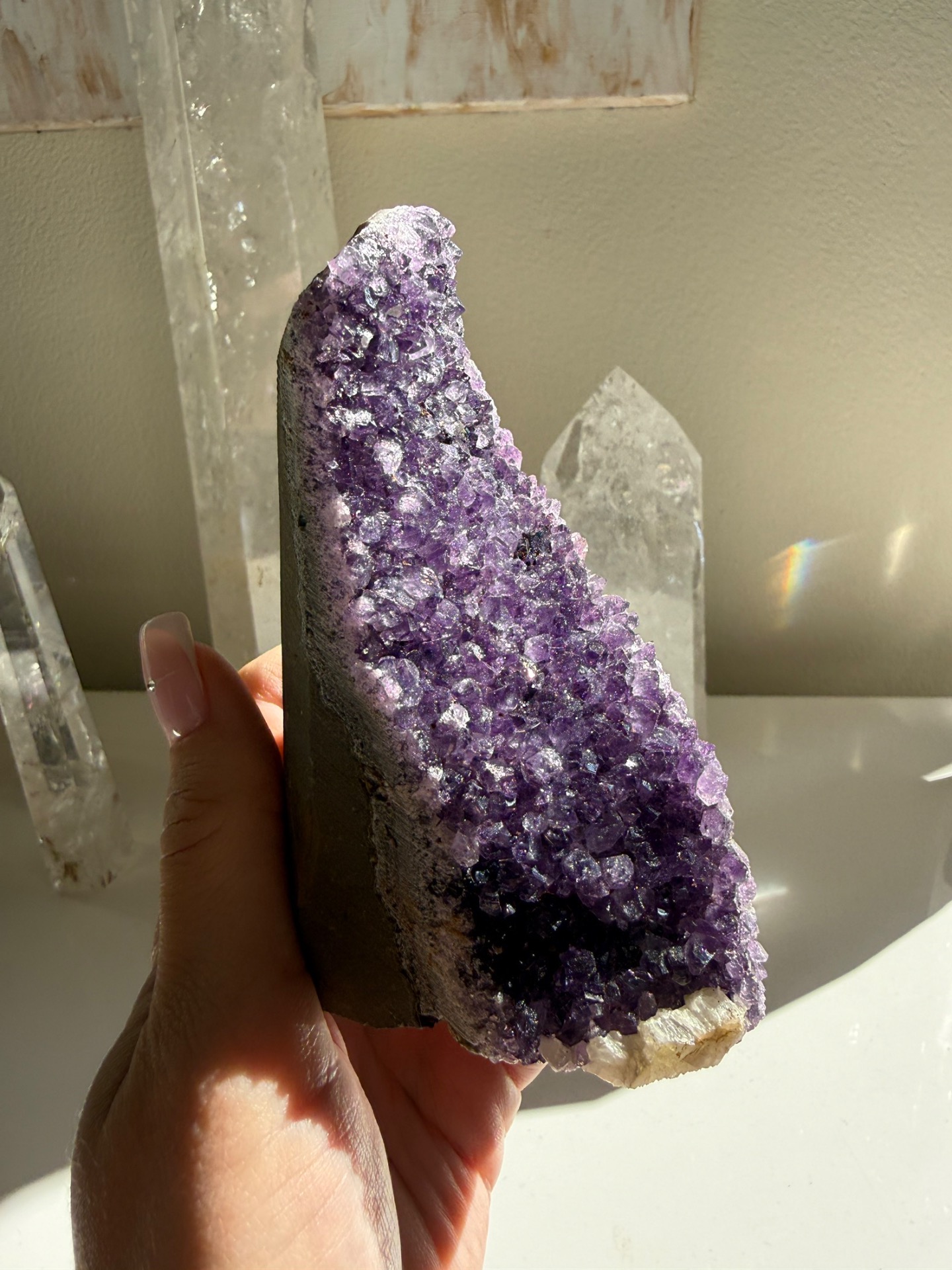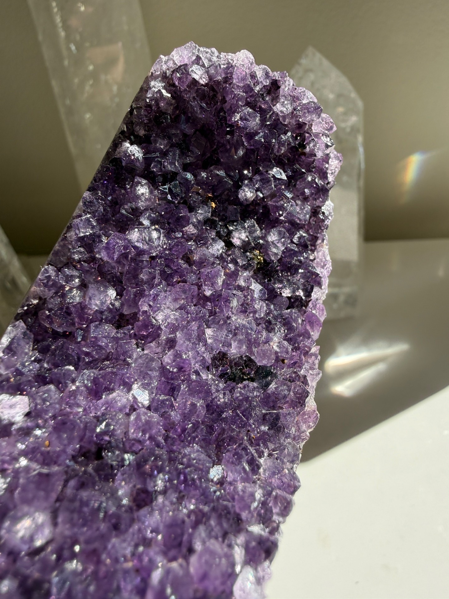 Ametystová drůzička má spirituální energie, které působí především na vyšší energetická centra, korunní čakru, napomáhá v rozvoji intuice a spojením s Vyššími Já, bytostmi světla a jejich pocítění.