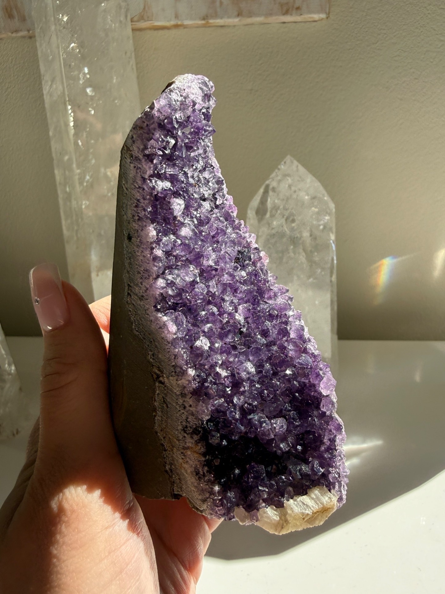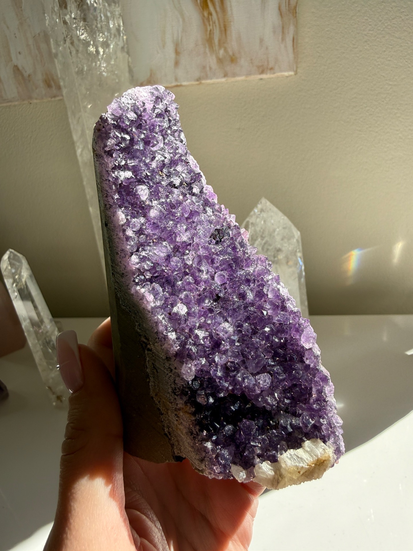 Nádherná malá ametystová stojící drůzička, která je vhodná do prostoru, do práce, či k nočnímu stolku.