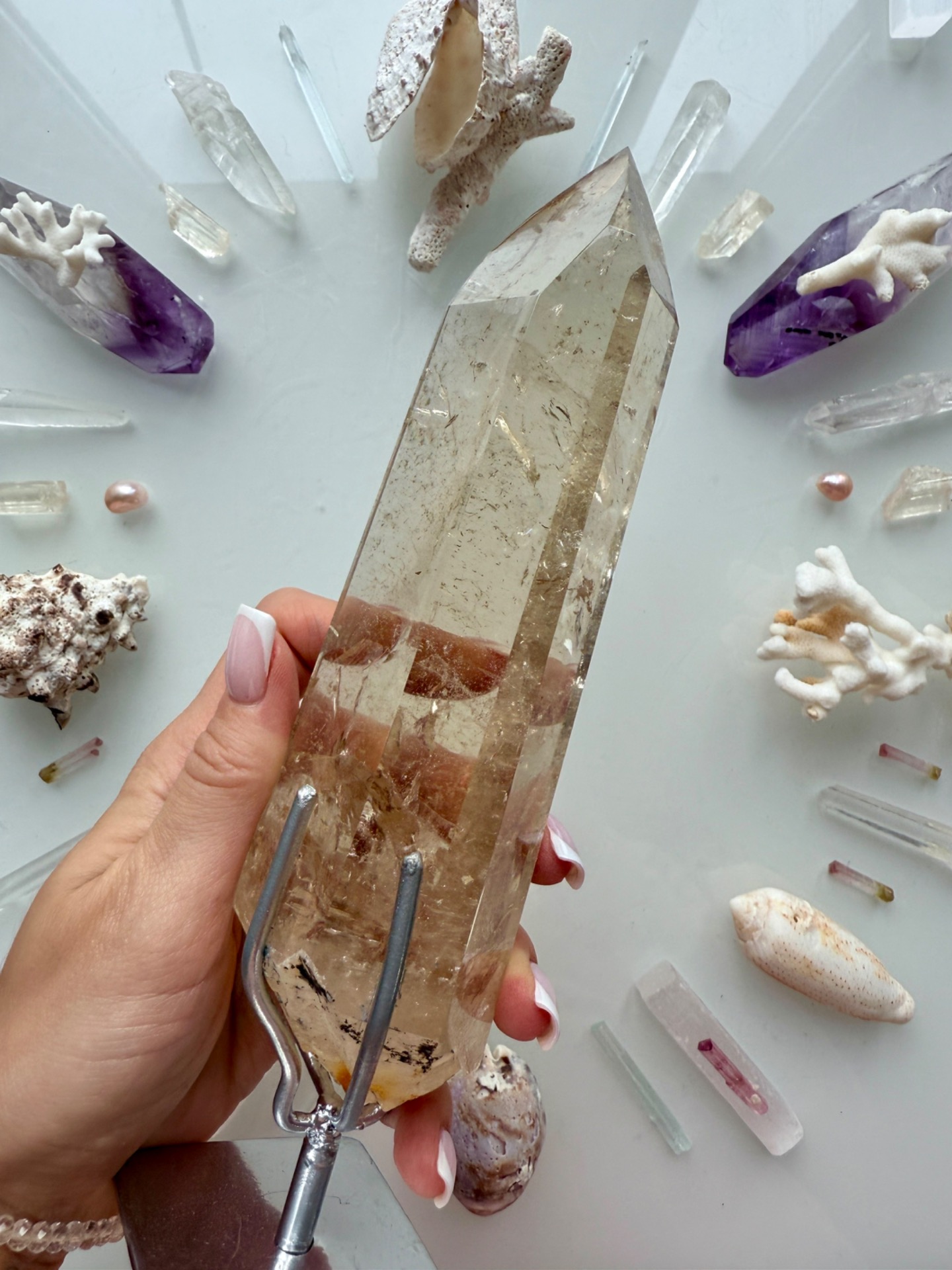 A Uprostřed této geometrie stojí majestátný posvátný krystal oceánské záhnědy, která je spojená s živoucí pamětí vody a také se vzpomínkami a posláním velryb.
