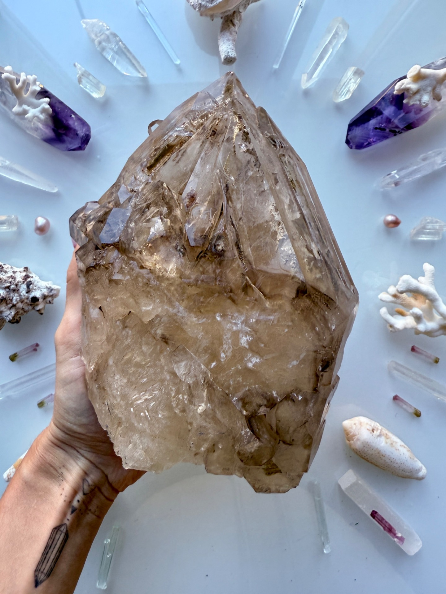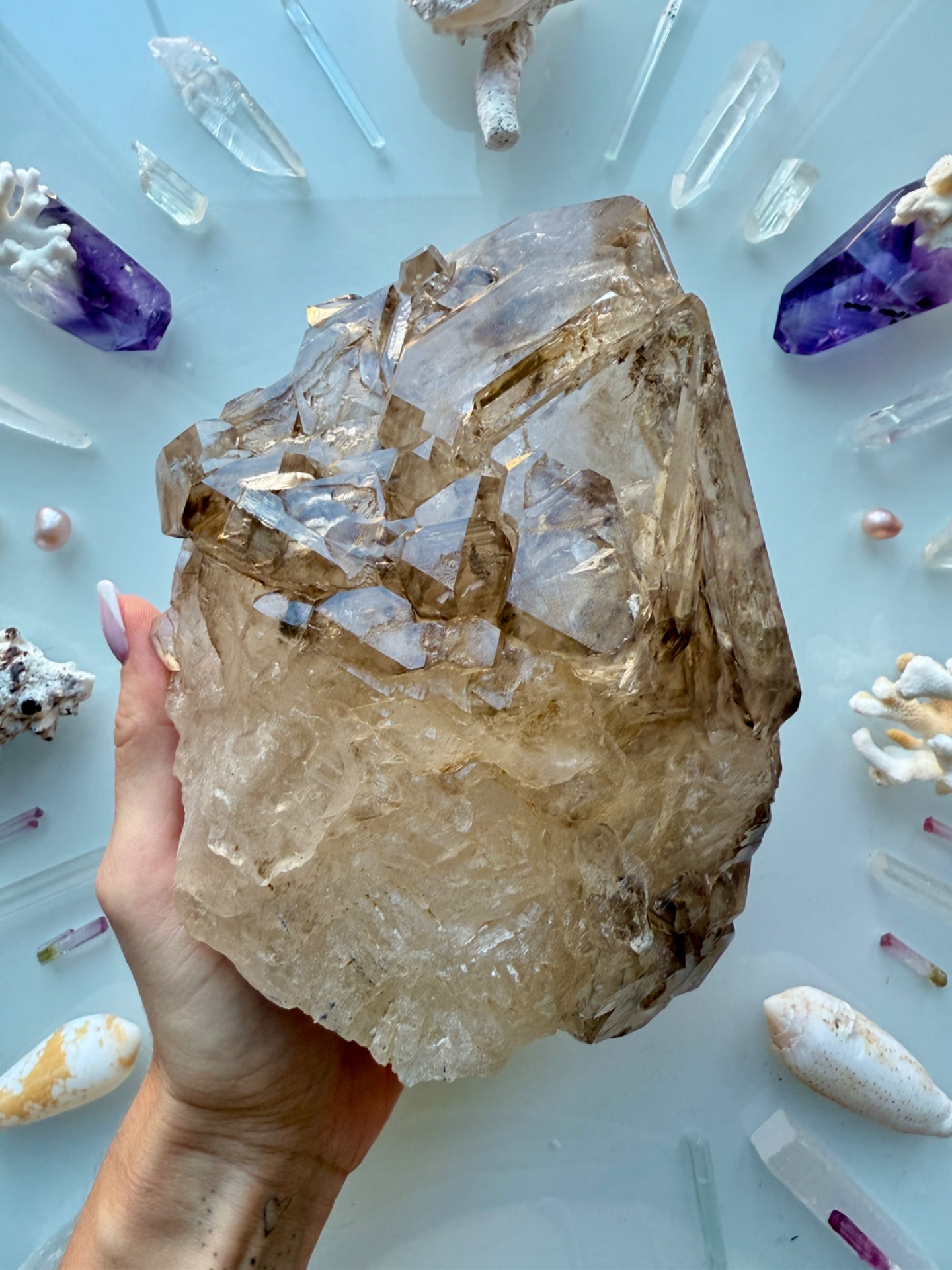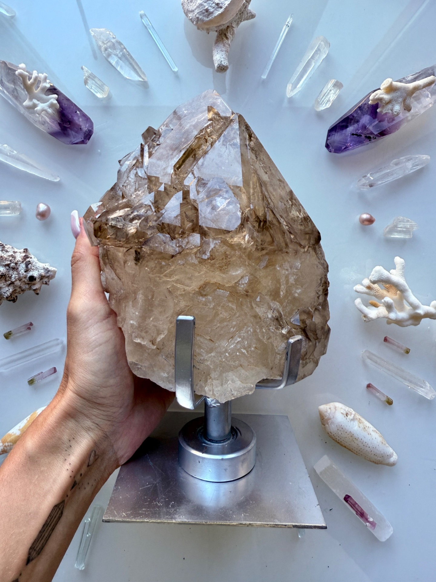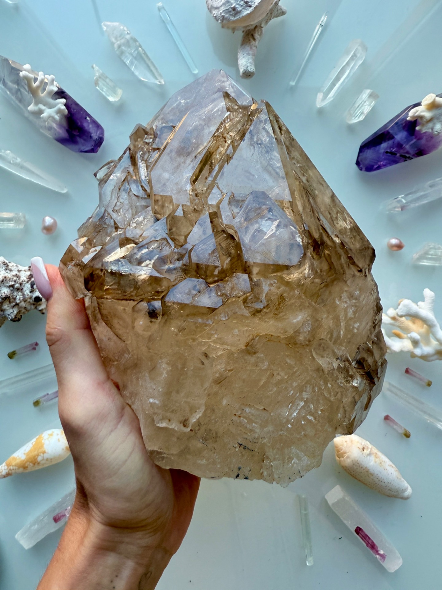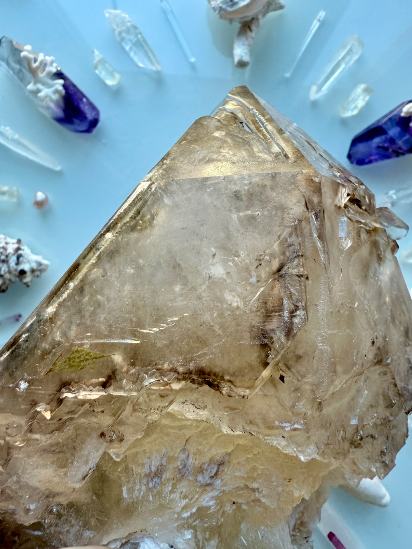 Další výjimečný krystalický kousek přírodního katedrálového citrínu, unikátního kódového krystalu nesoucí informační záznamy a hologramy, které krystal může vysílat. Tento unikátní citrín zastupuje galaktické Slunce a čisté kódy Vzestupu je to oheň, ale zároveň v sobě nese bublinky vody, takže je zde propojení s Vodou..