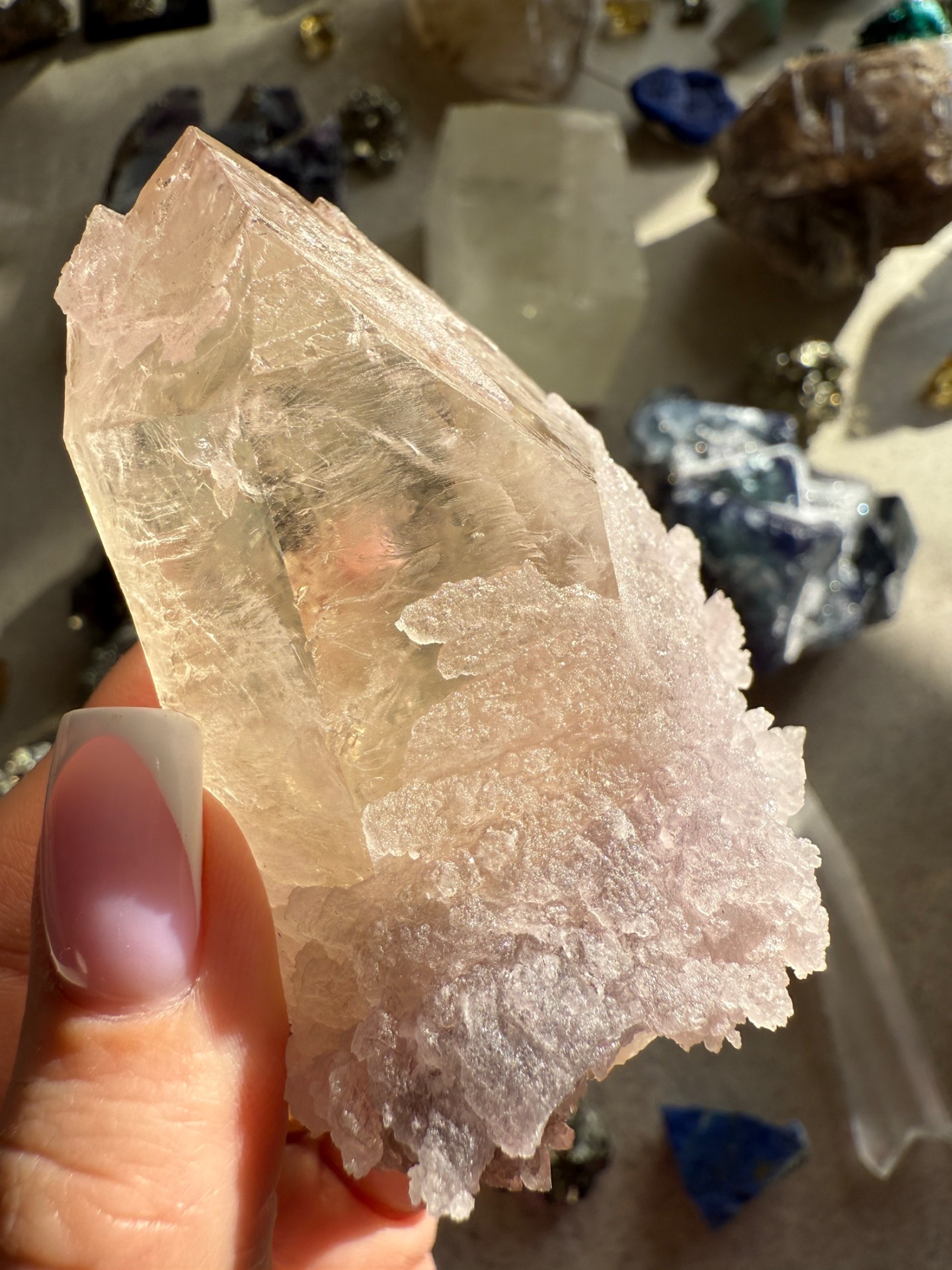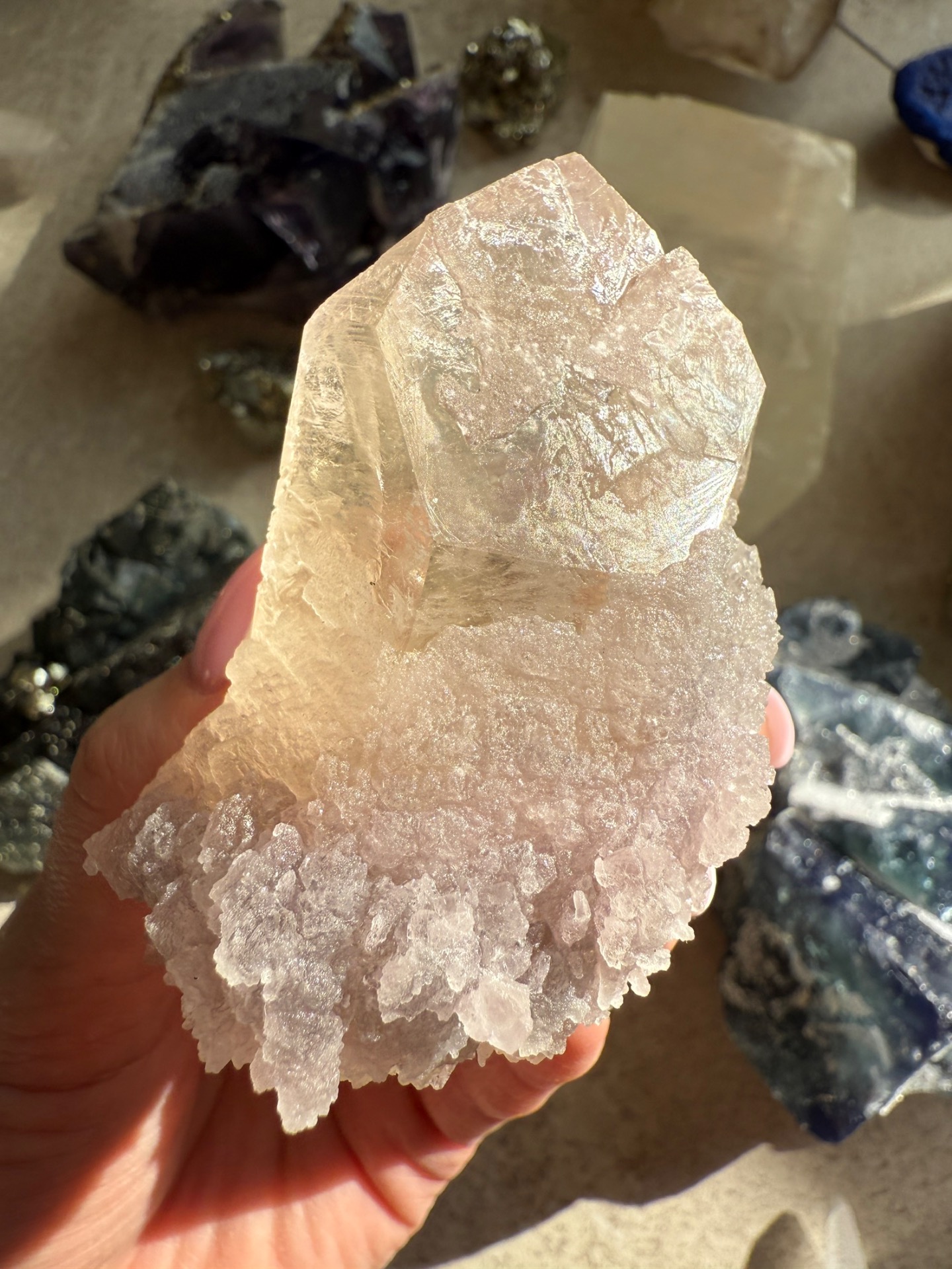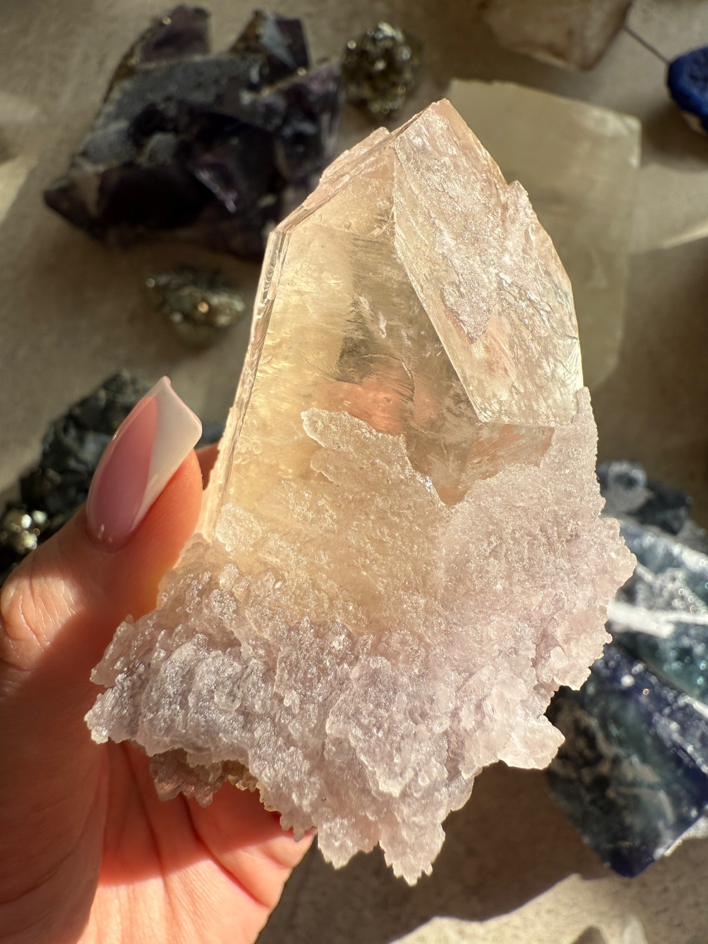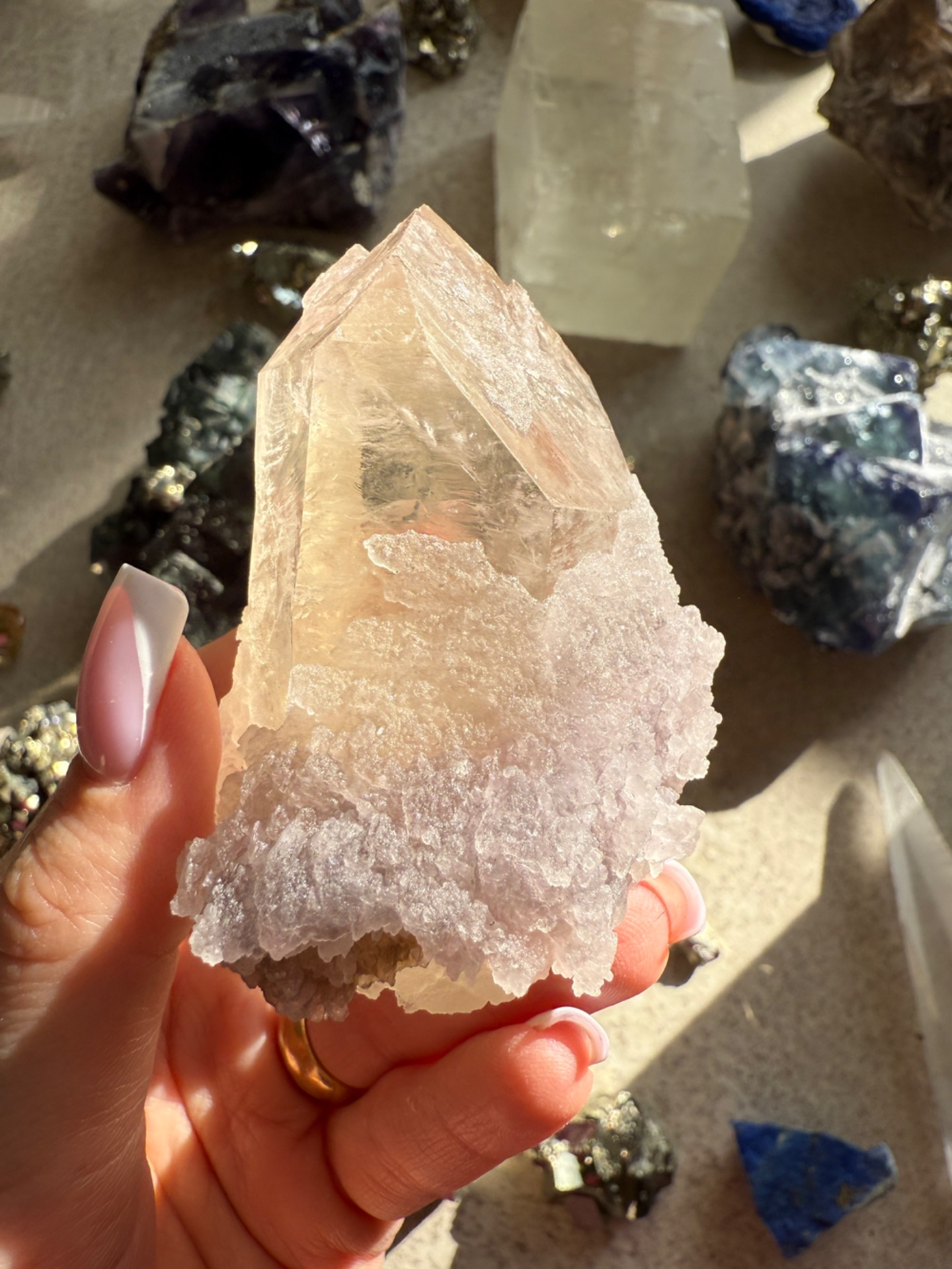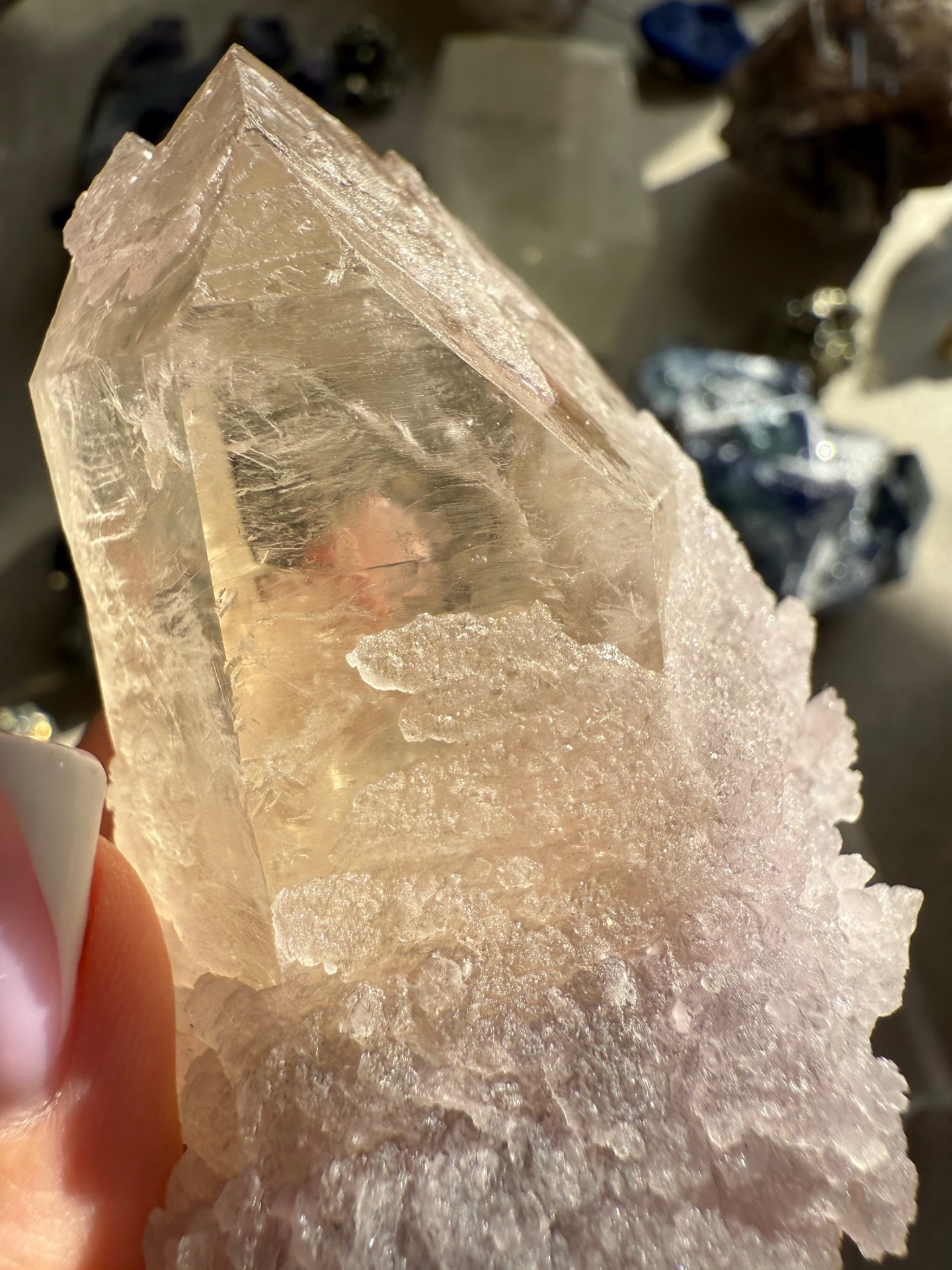 Výjimečný citrín Kristovského Vědomí na kterém je vzácný krystalický růženín. Ano Zkrystalizovaná Láska. Jedná se o velmi speciální krystal, malý poklad nepředatelné energie...