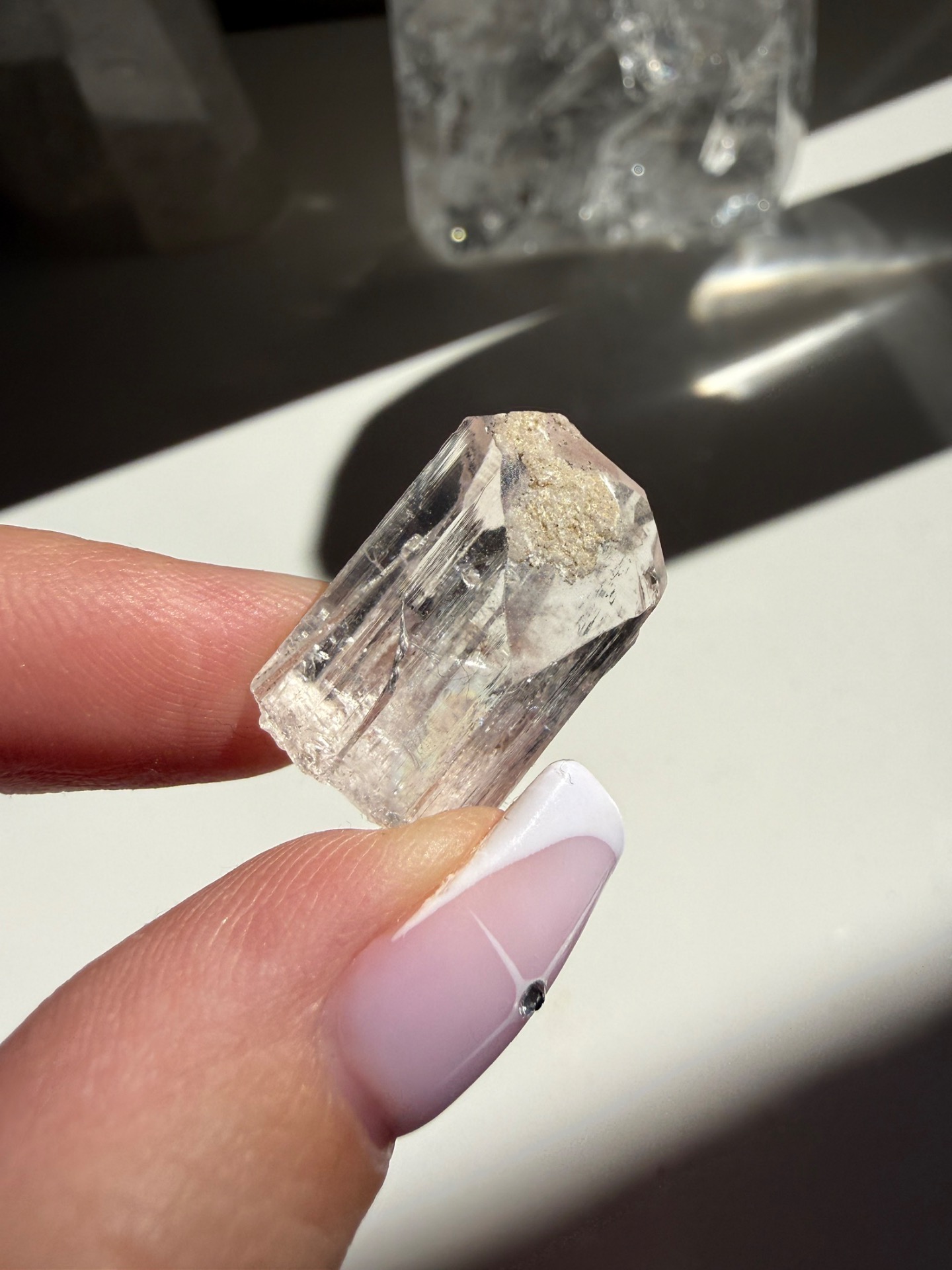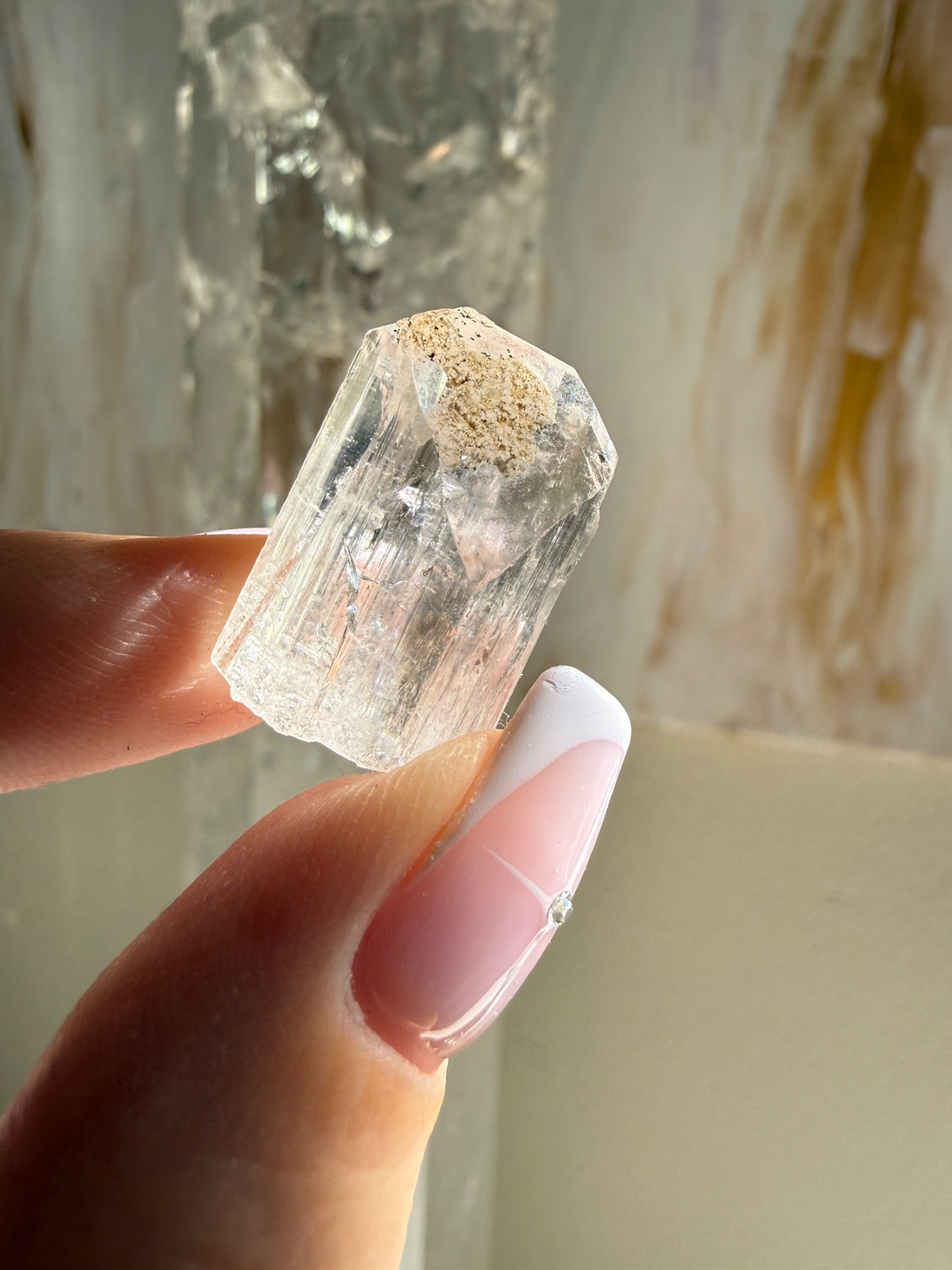 Krystal Danburitu, který nese velmi krásnou a čistou frekvenci světla. Jeho energie je jemná, není násilná a krásně dokáže v jemnosti vést energii do vyšších vibrací.