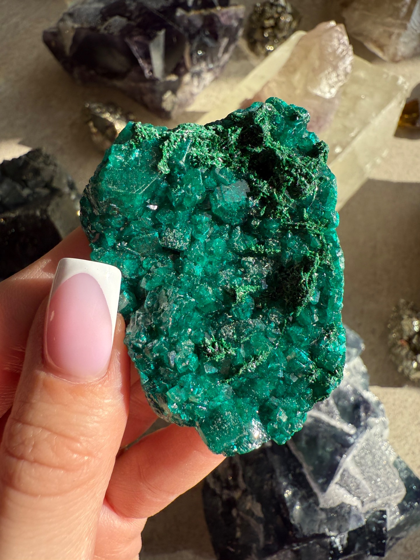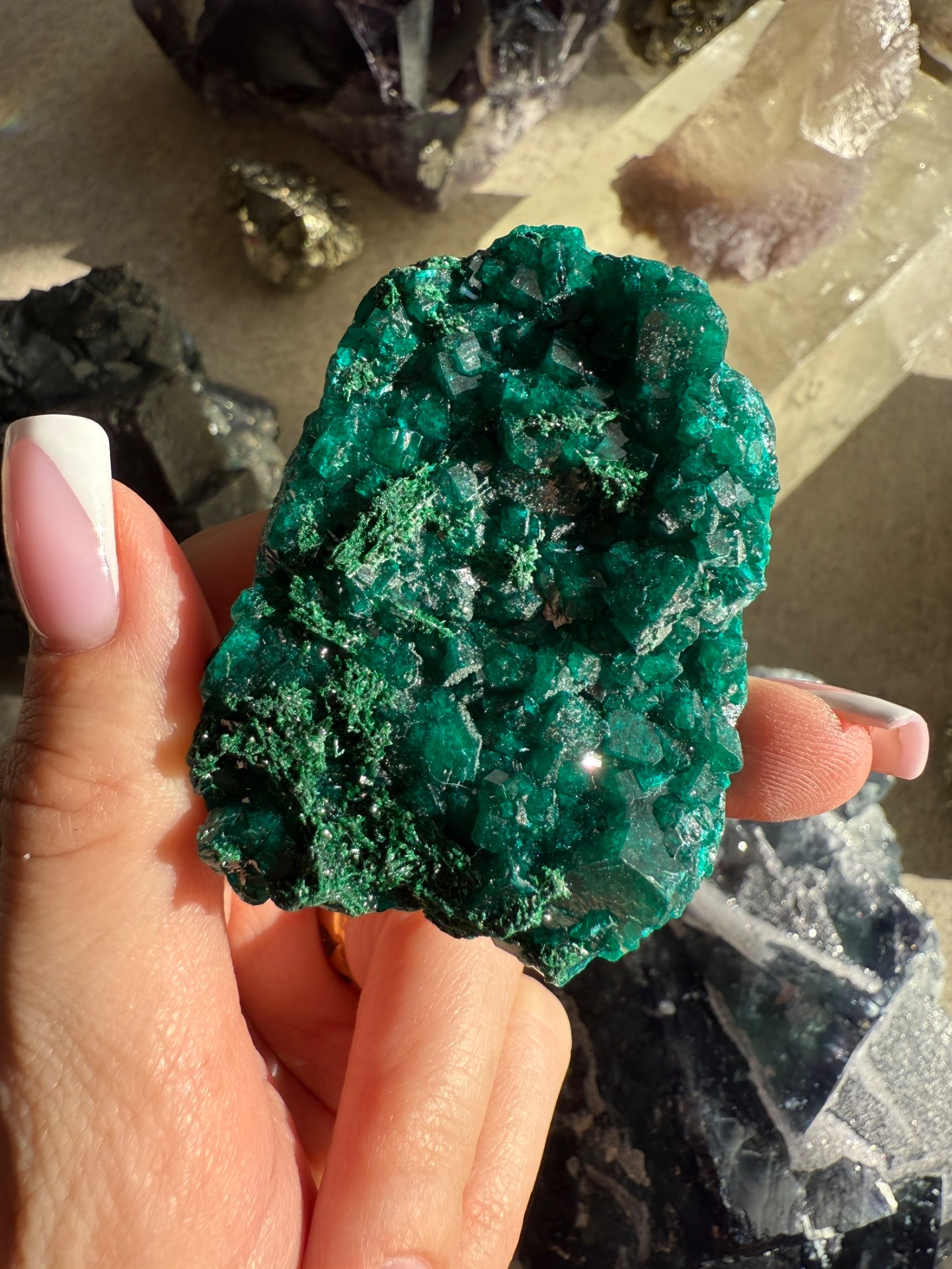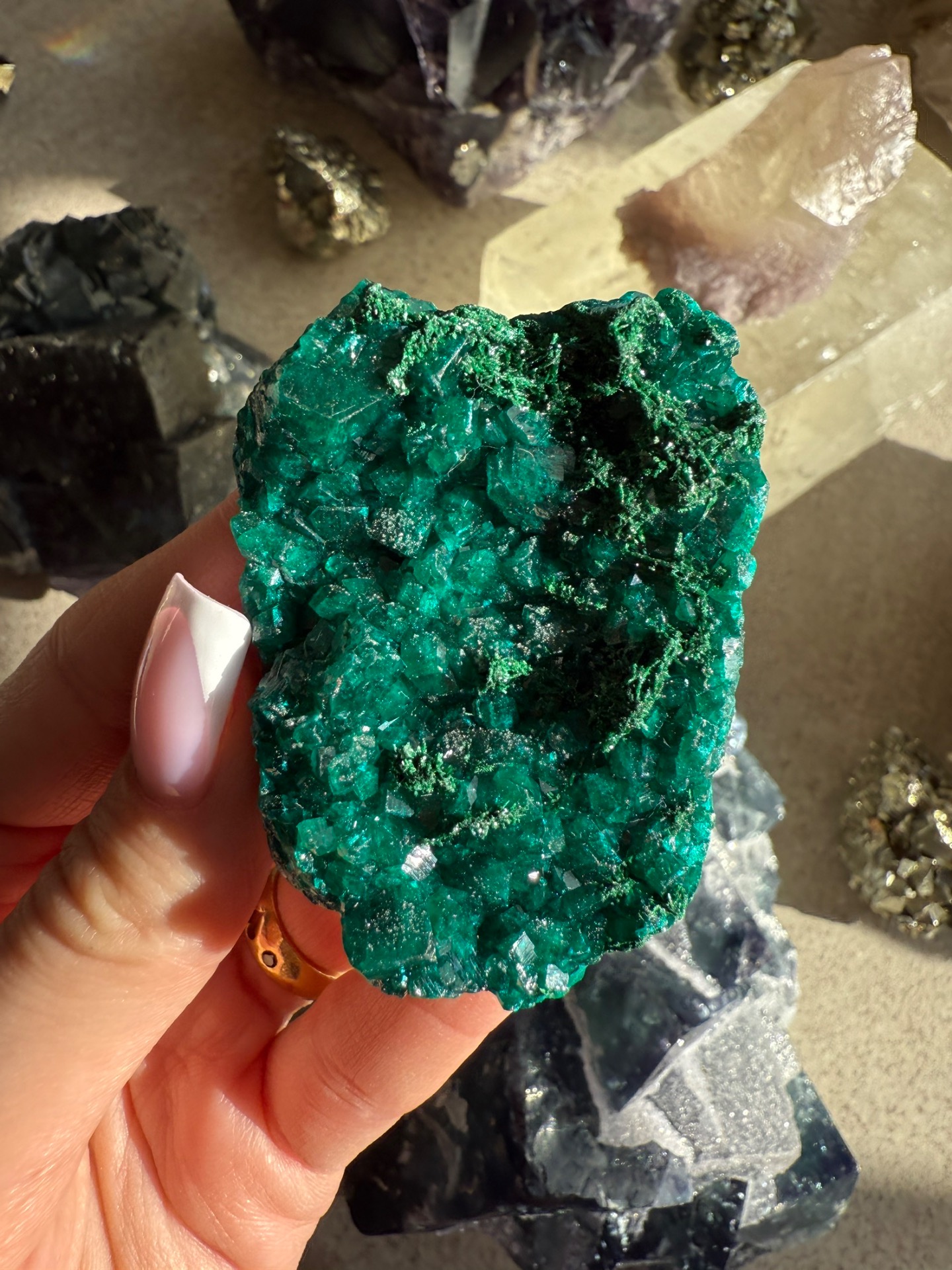 Dioptas je úžasný a nádherný minerál, který vypadá až uměle neboť má sytou zelenou barvu a krásnou krystalizaci. Ale je to přírodní krystal, který takto vydala matka Země.