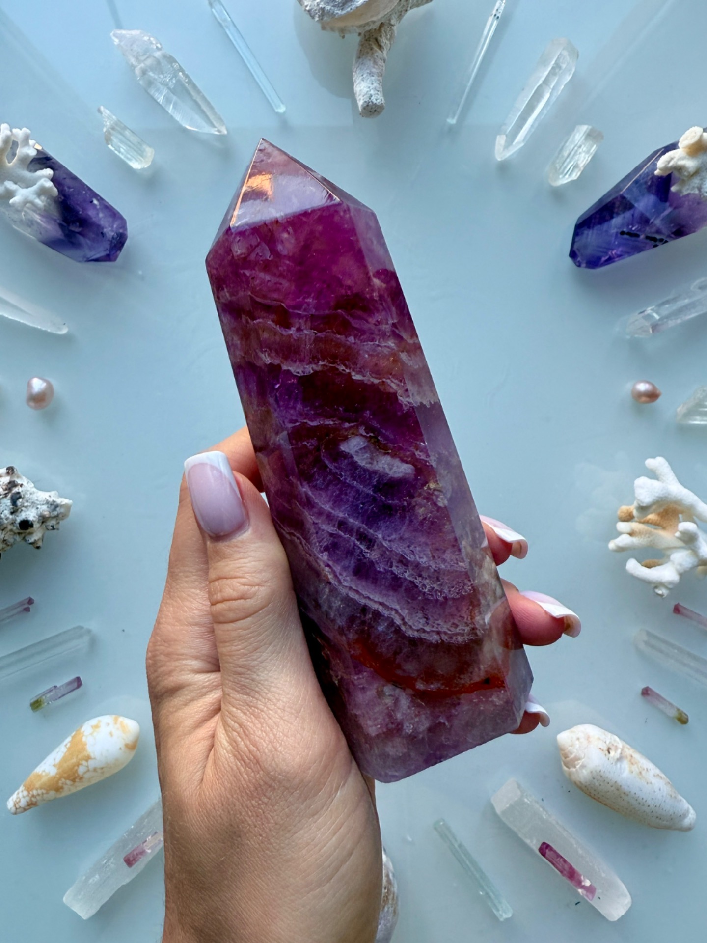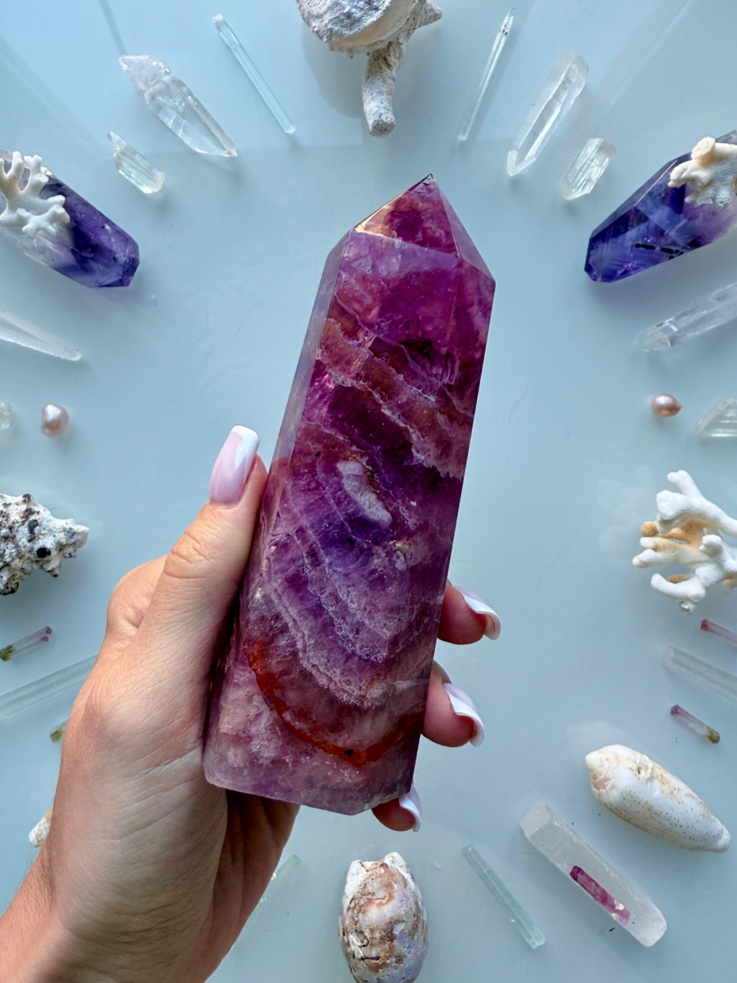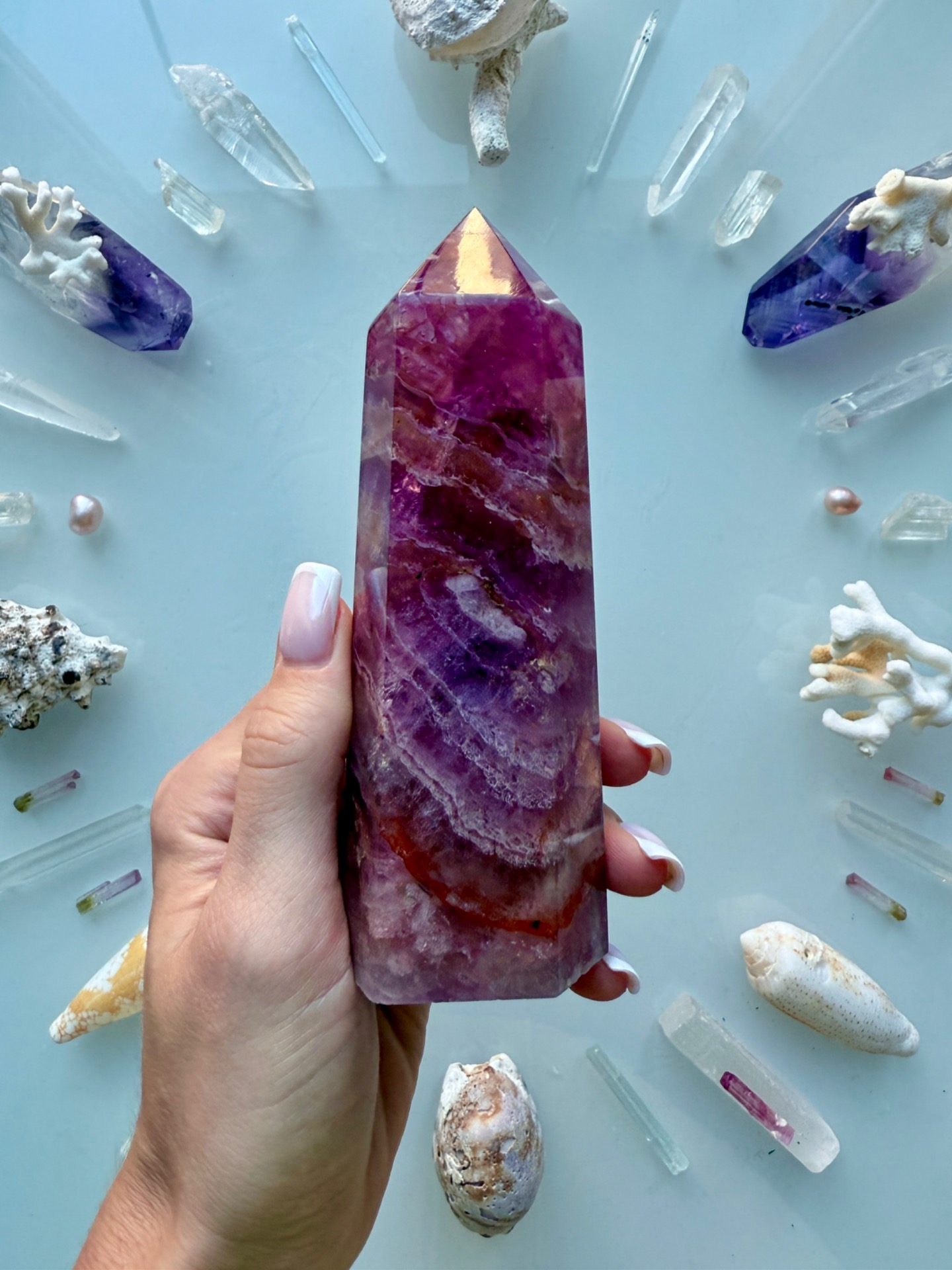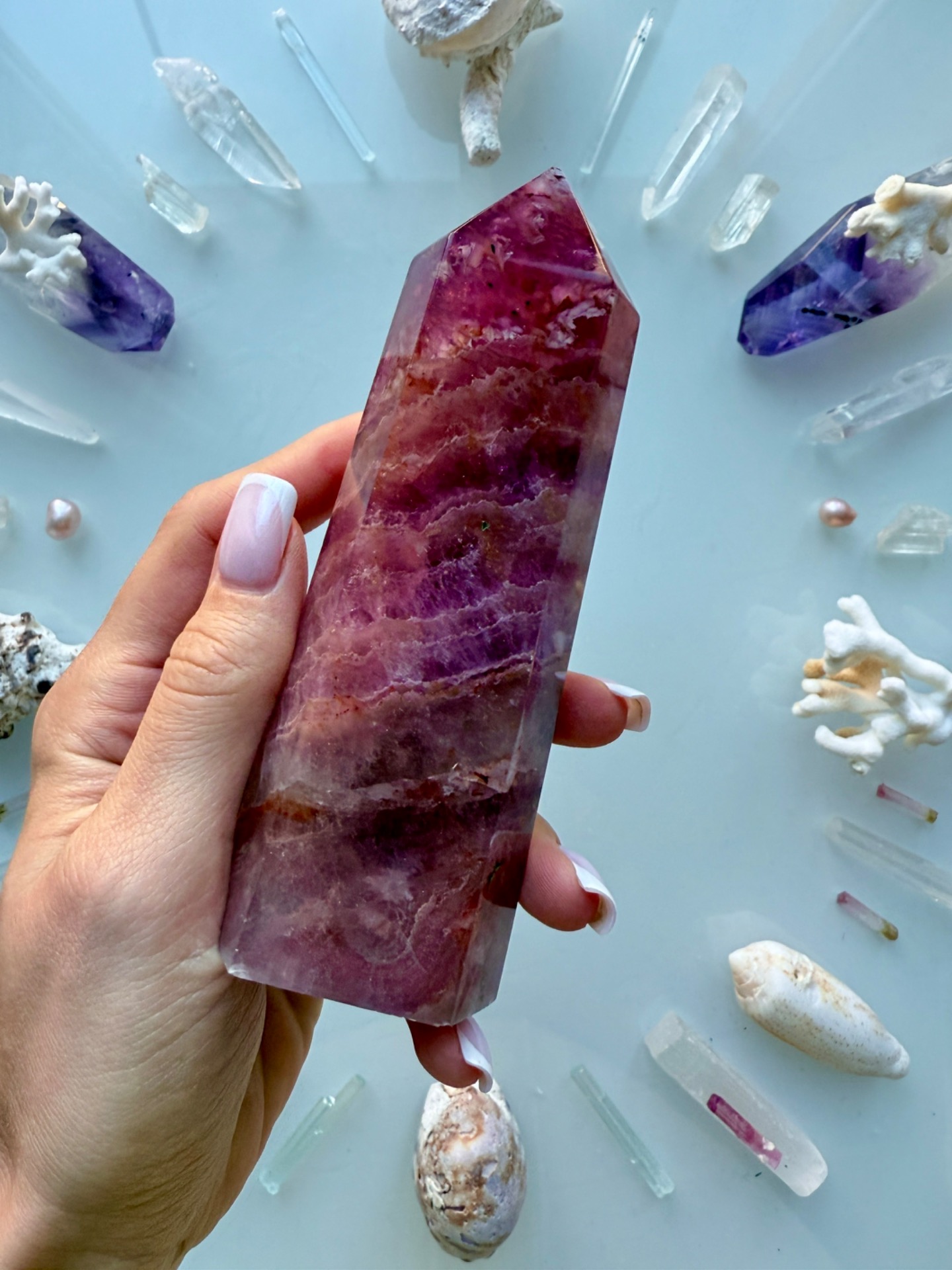 Fluoritová špička pomáhá přijímat a ukotvovat duchovní energie do těla, aby se vše mohlo projevit ve fyzickém života.