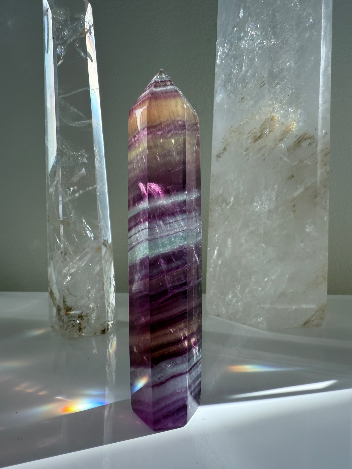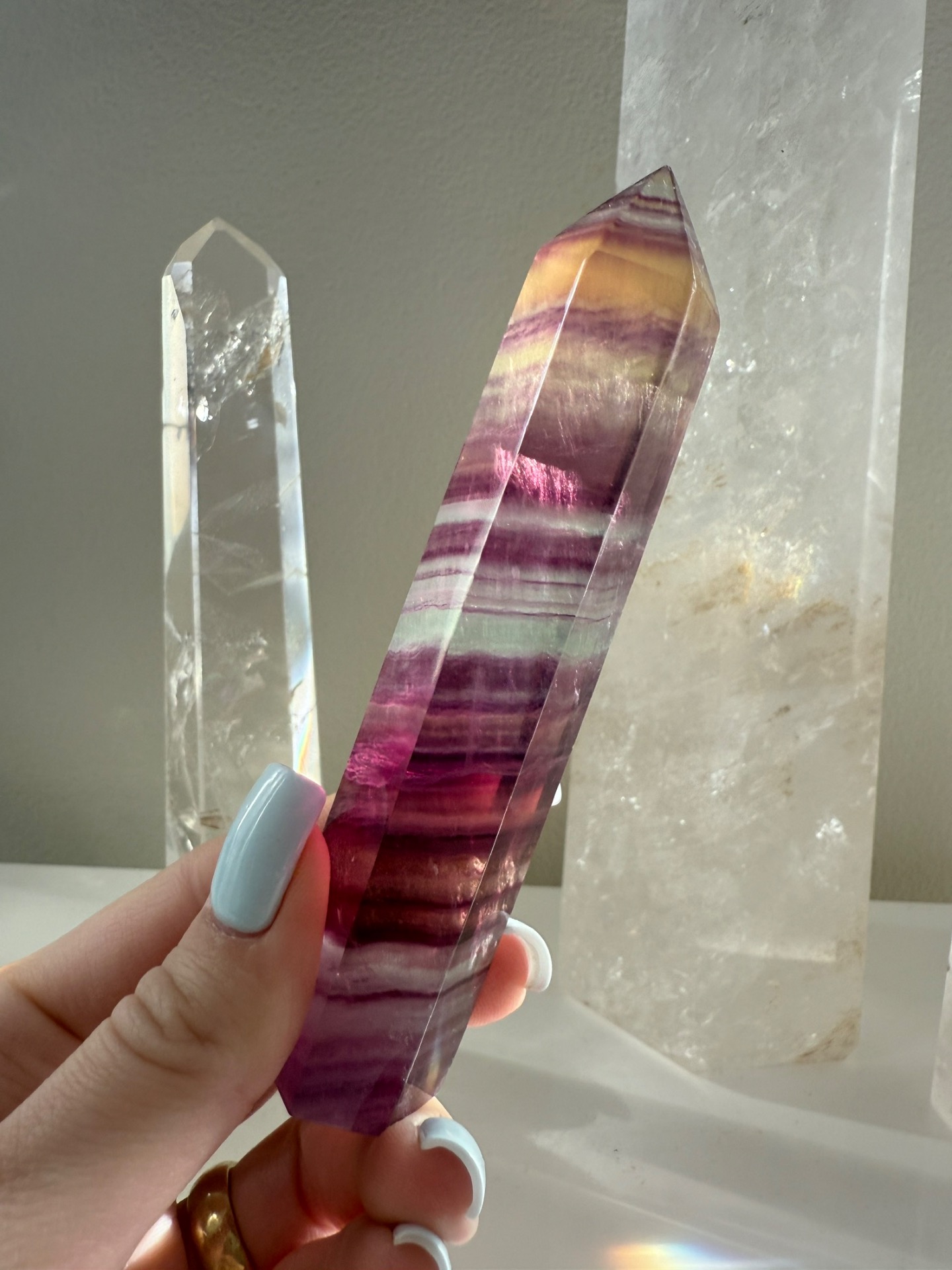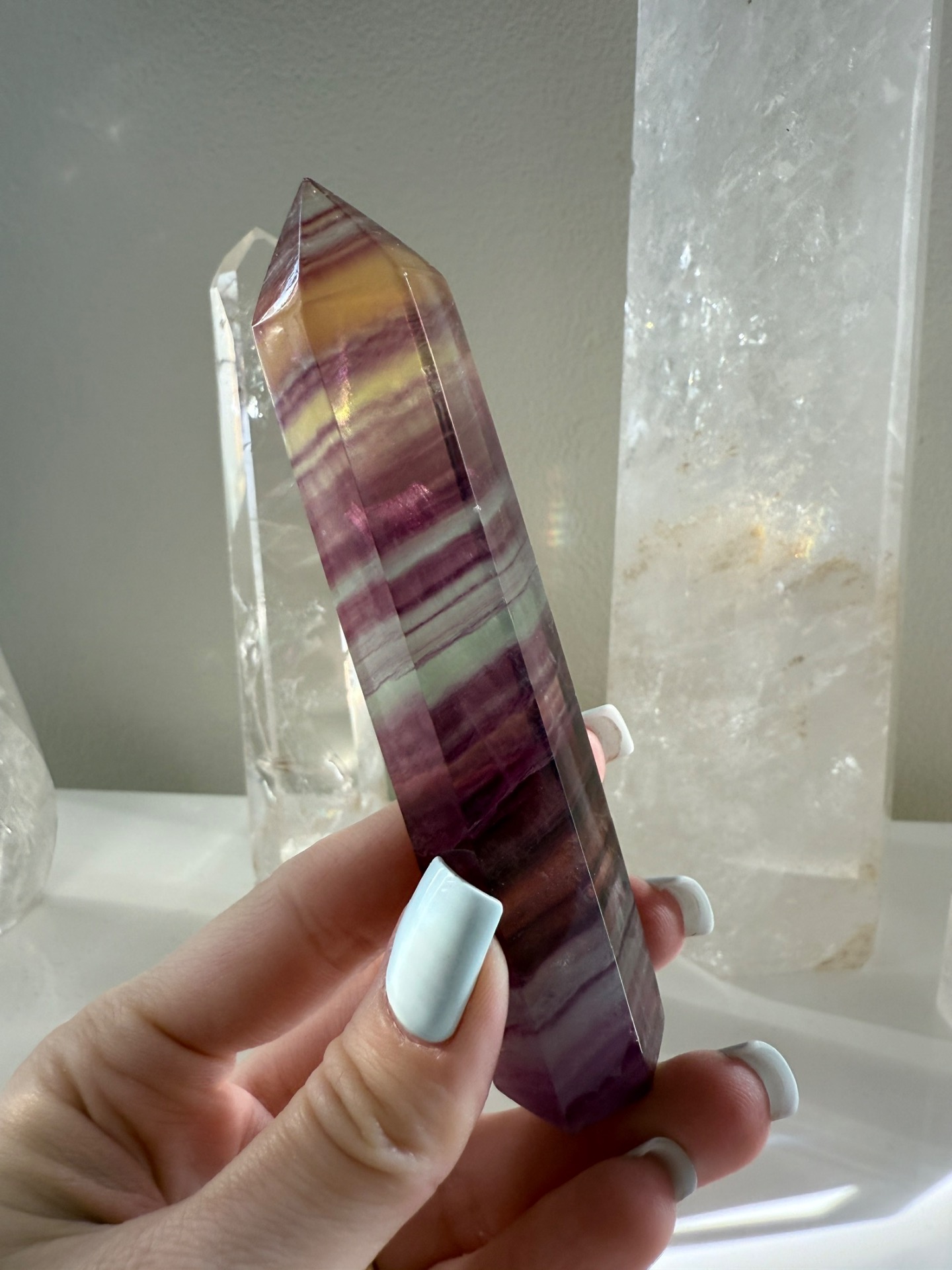 Fluoritová špička pomáhá přijímat a ukotvovat duchovní energie do těla, aby se vše mohlo projevit ve fyzickém života.