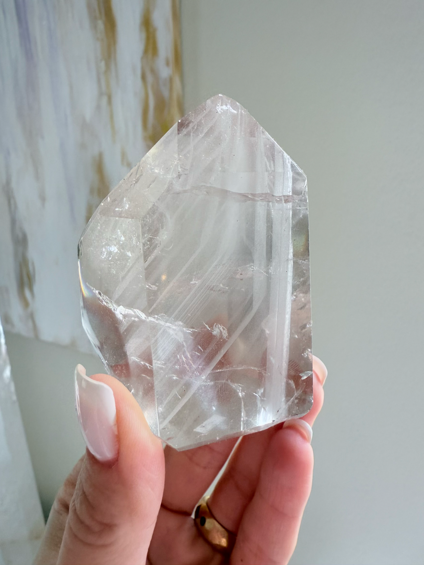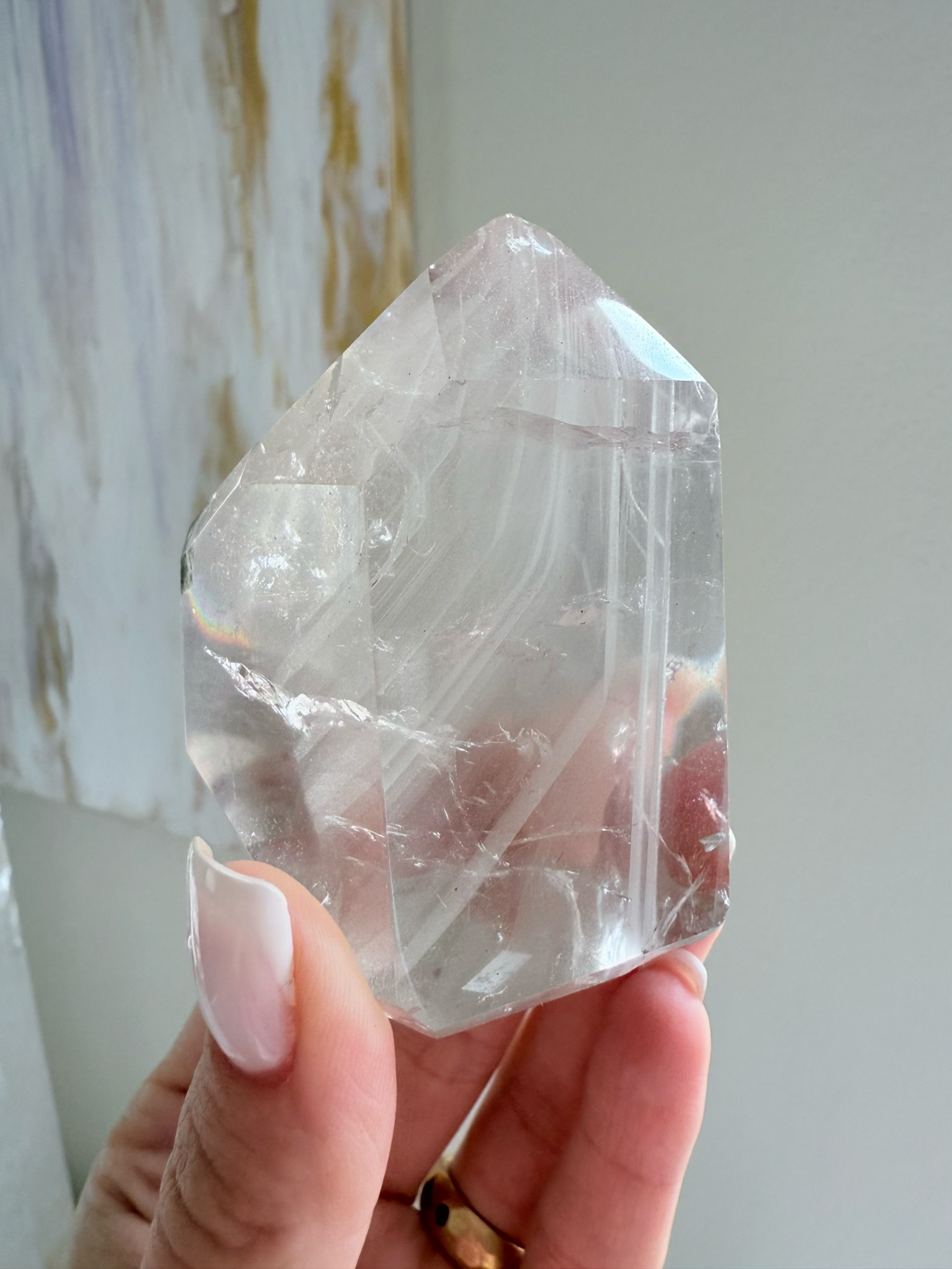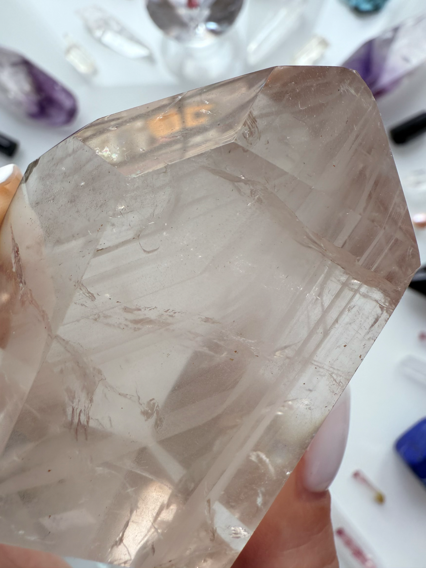 Výjimečný kousek světelné špičky křišťálu, která v sobě nese fantomy v hojném počtu, který nám ukazuje vývoj krystalu a působí na naše vývoj naší duše, poznání a moudrostí.
