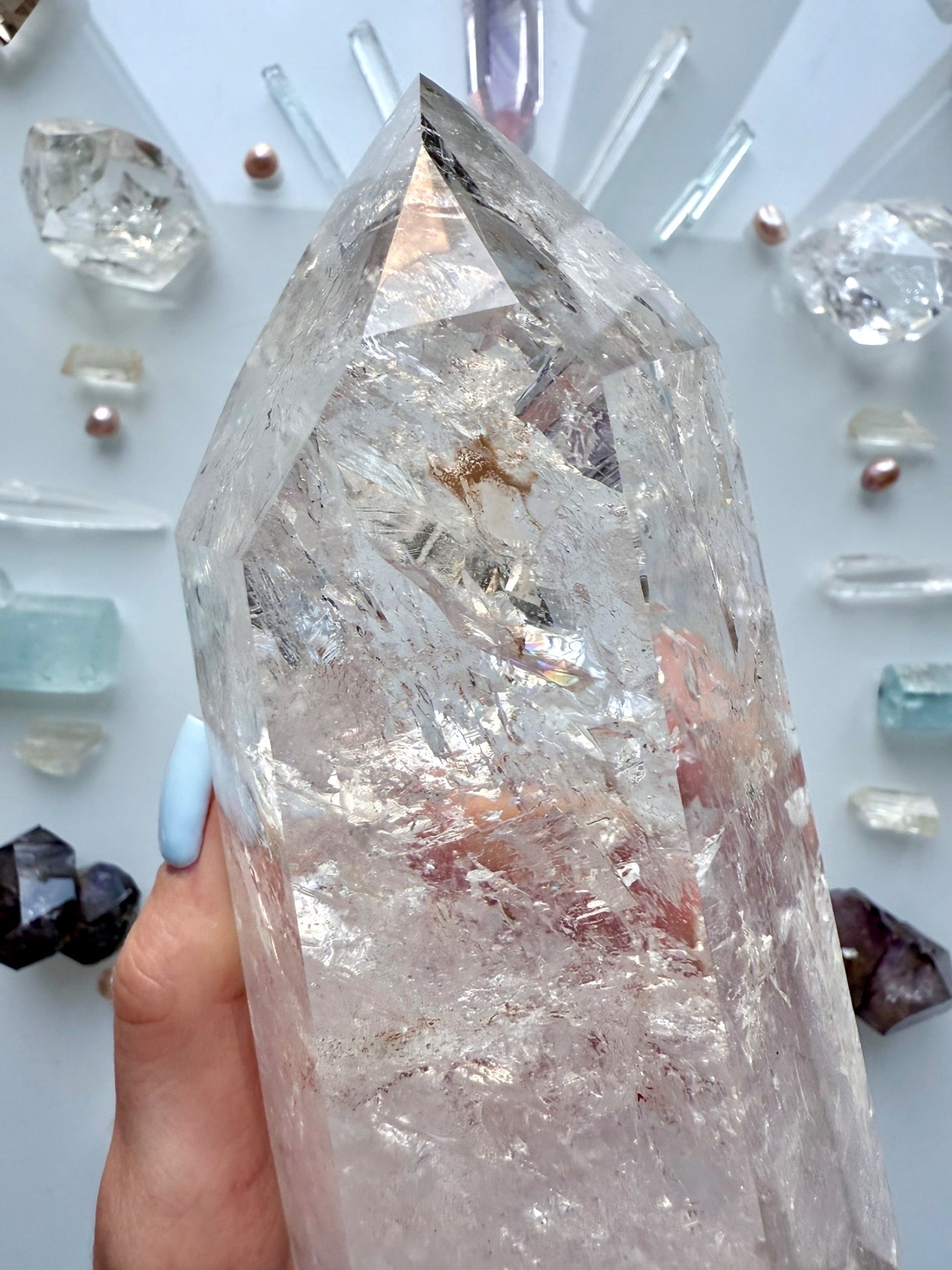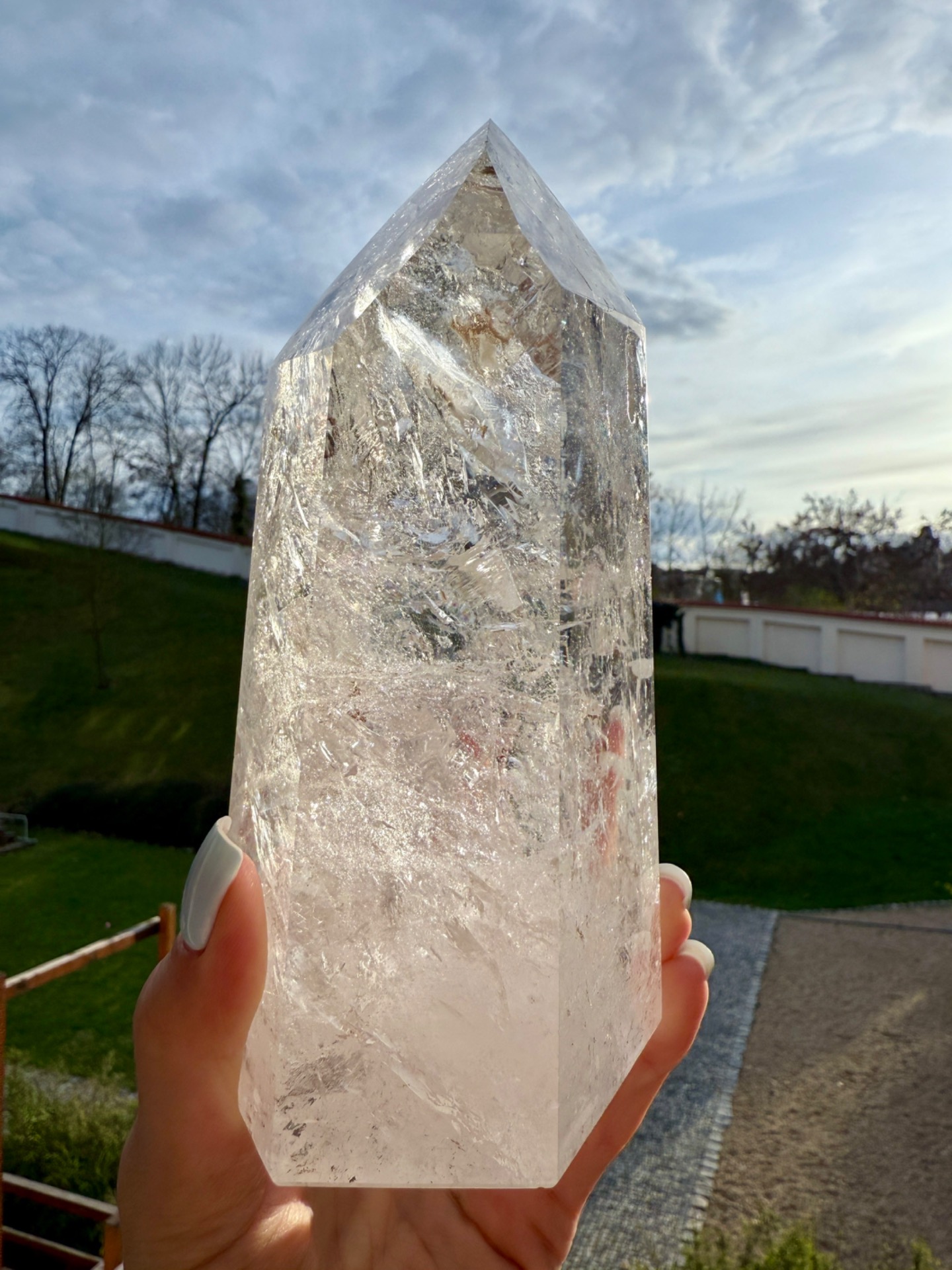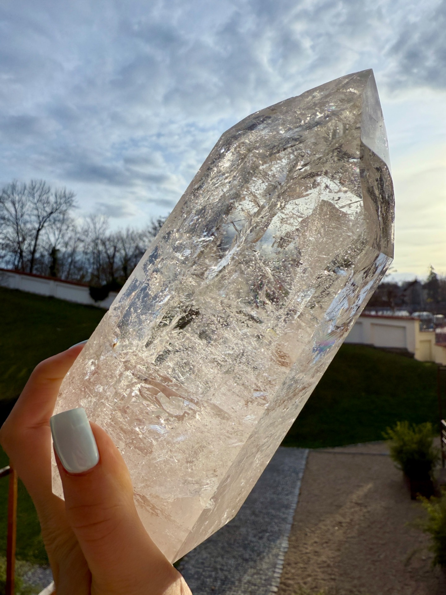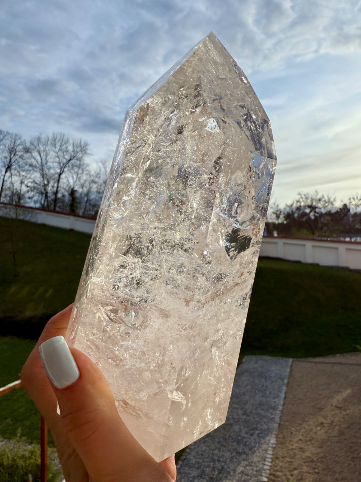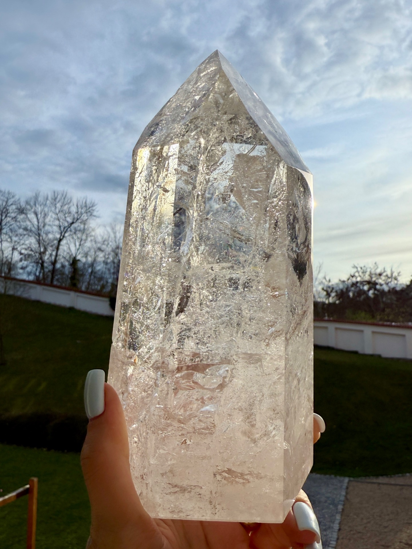 Nádherná diamantová křišťálová špice, plná světla, duhových odstínů, které se v krystalu ukazují. Zároveň je zářičem a předavatelem krystalického Kristovského Vědění. Vůbec se nedá zachytit jeho nádherné a zářivé světlo.