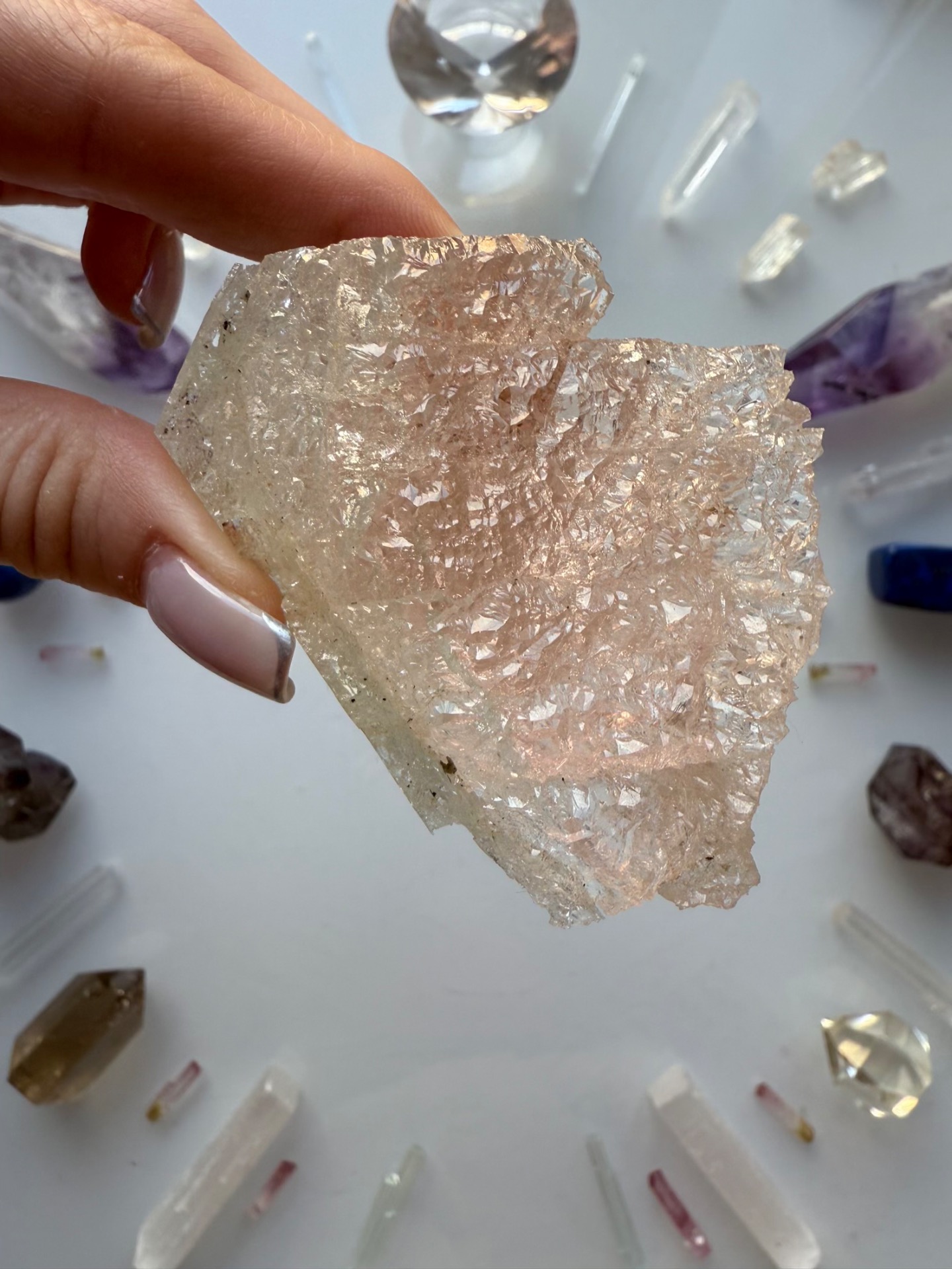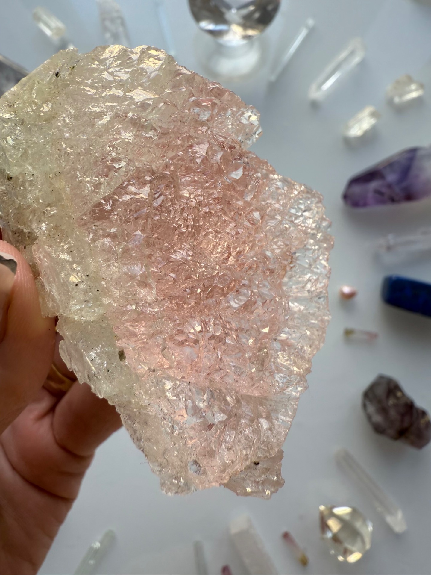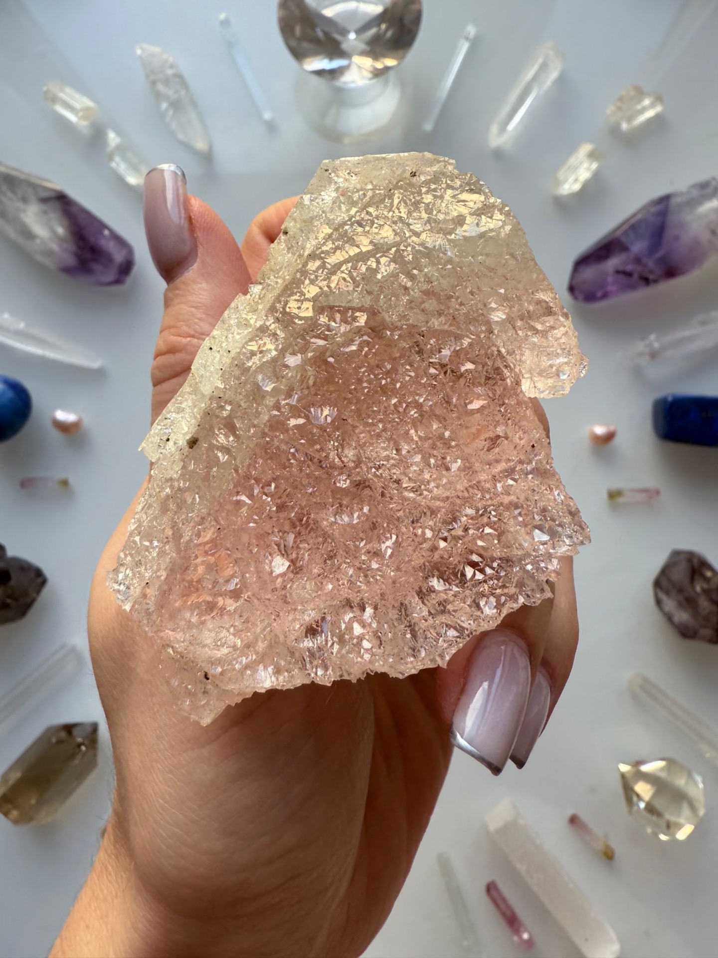 Nádherný mřížkový krystalický Morganit, velmi silného světla. Z oblasti Golconda, kde se nacházejí velmi výjimečné Morganity. Multidimenzionální krystal pracující s vyššími růžovými paprsky bezpodmínečné Lásky, plazmatické tekuté energie, která prochází i těmi největšími bloky propojené s Láskou.