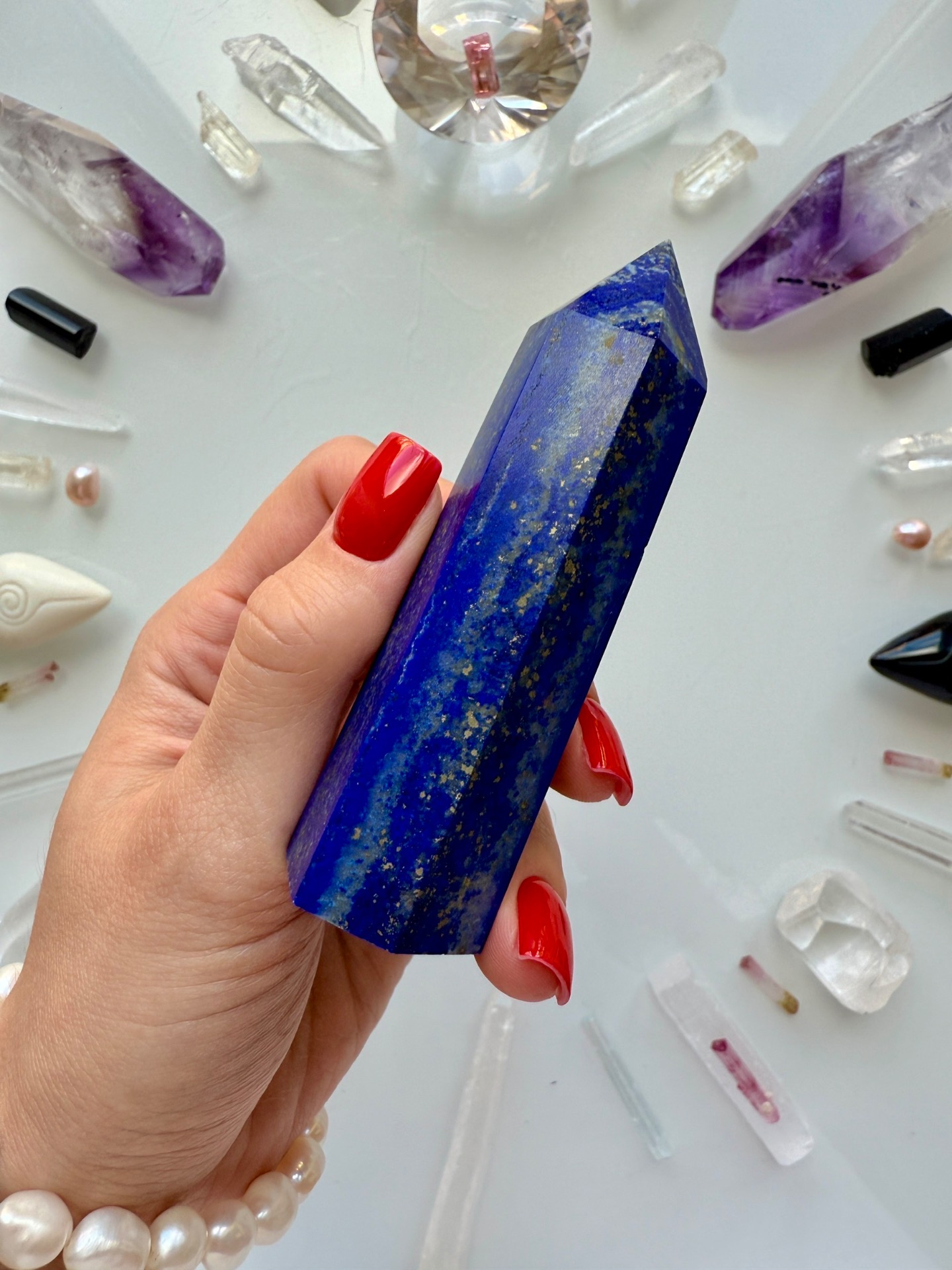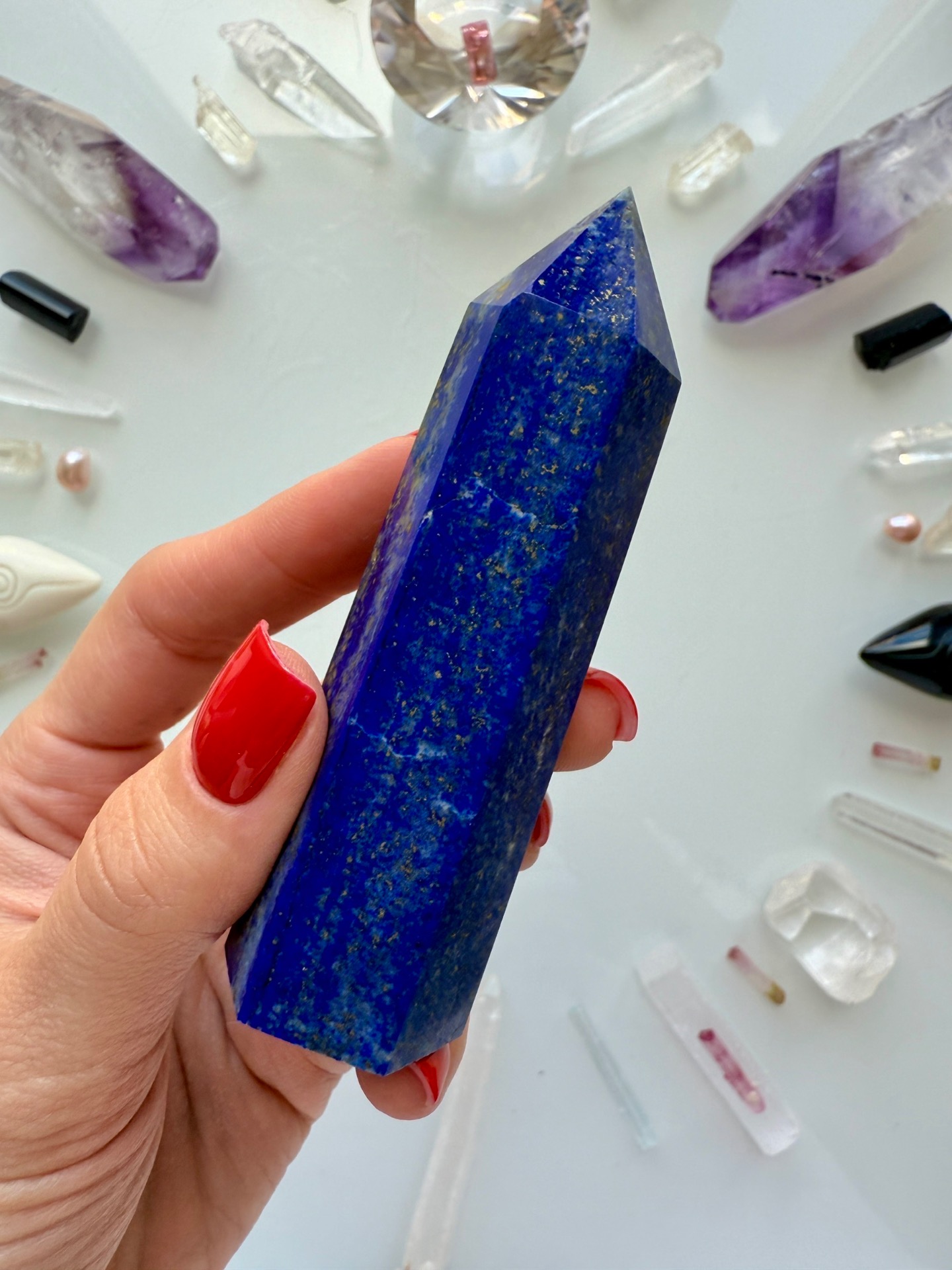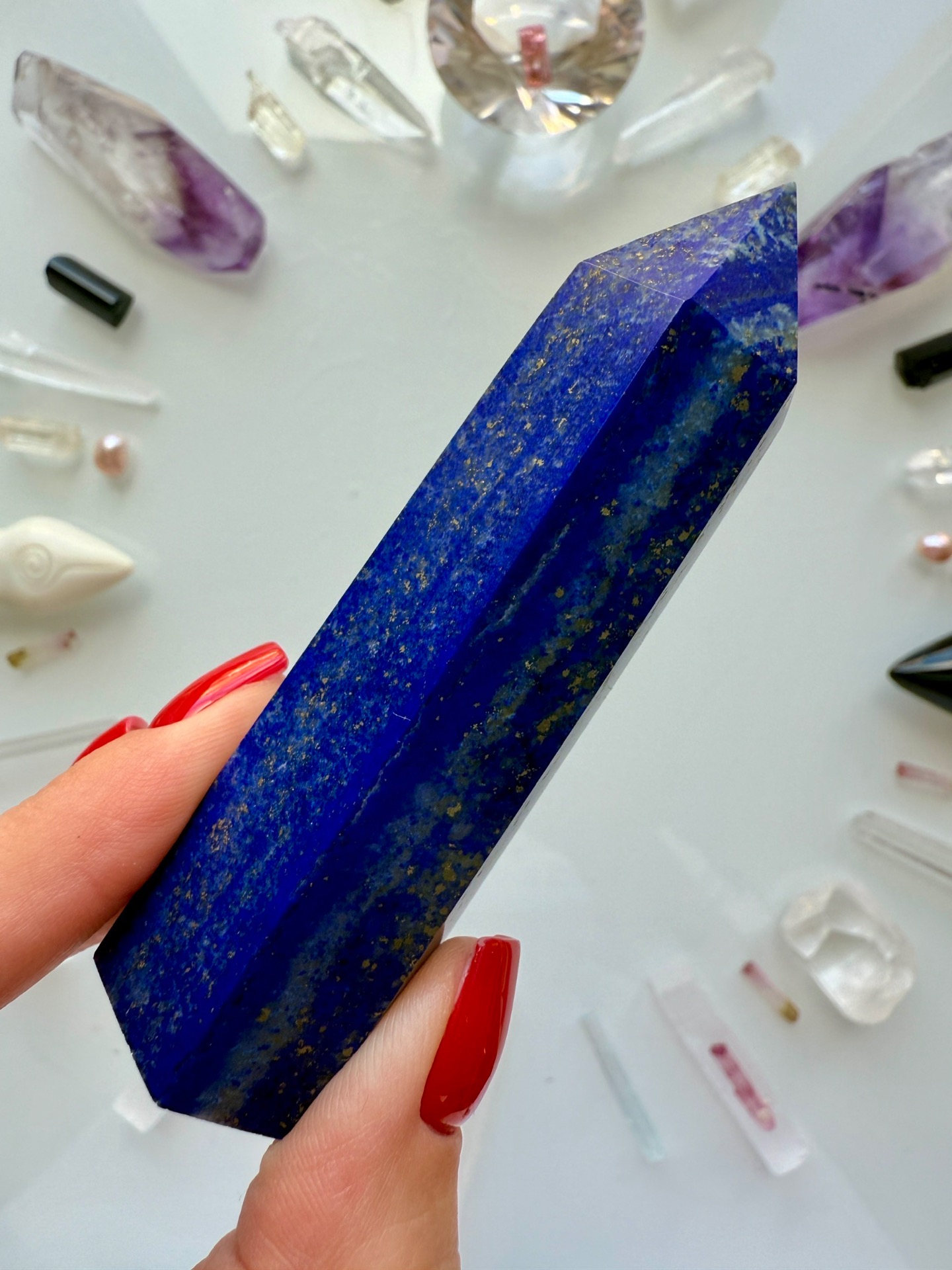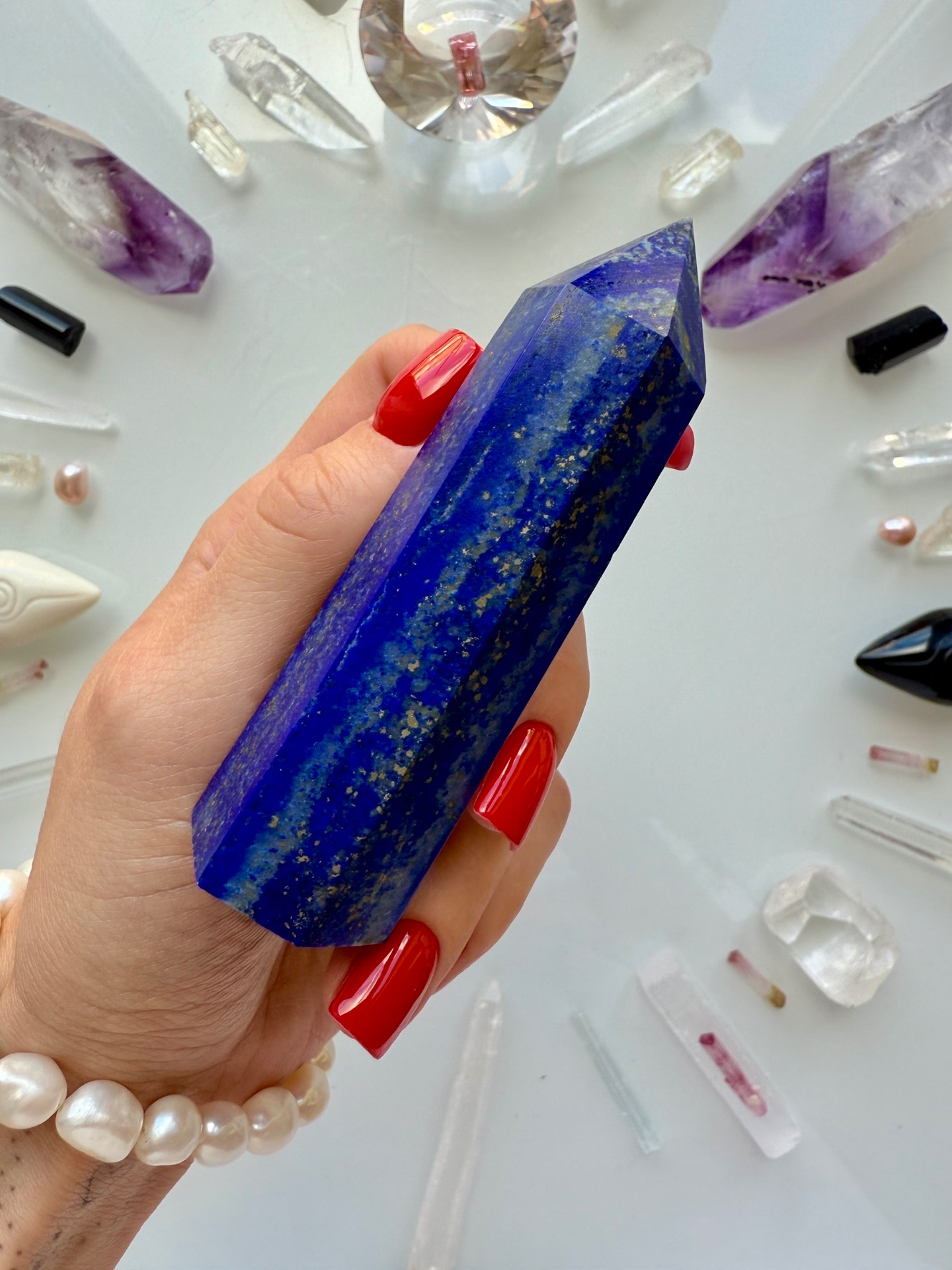 Lapis lazuli zobrazuje naše iluze, chyby a také karmu z více rovin. Krystal svou nádhernou královsky modrou barvou působí svým paprskem na Třetí Oko v propojení s Krční čakrou.