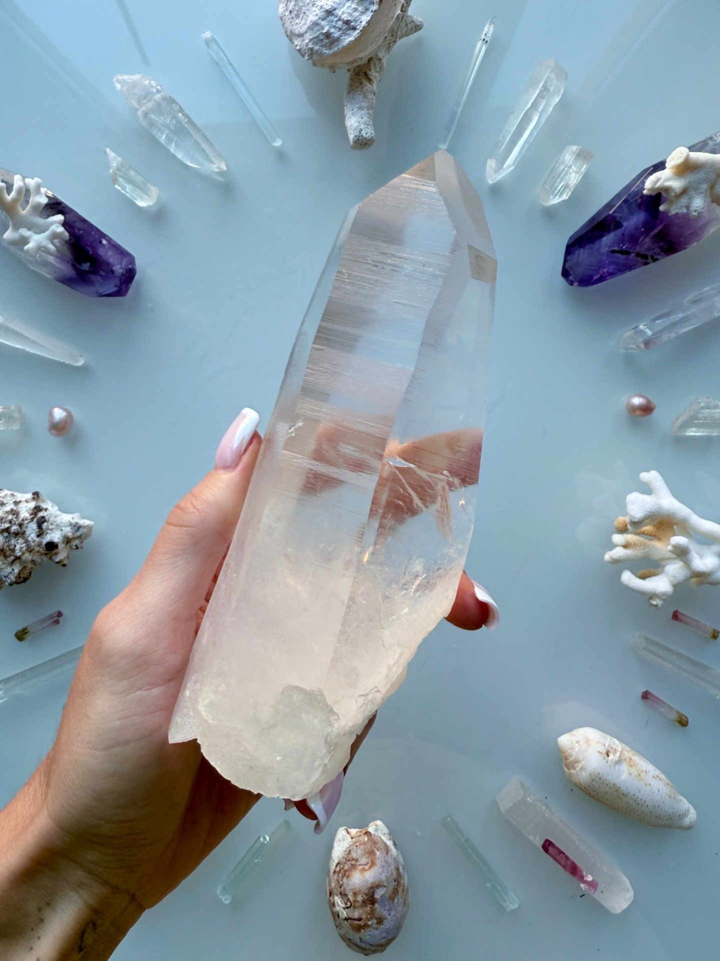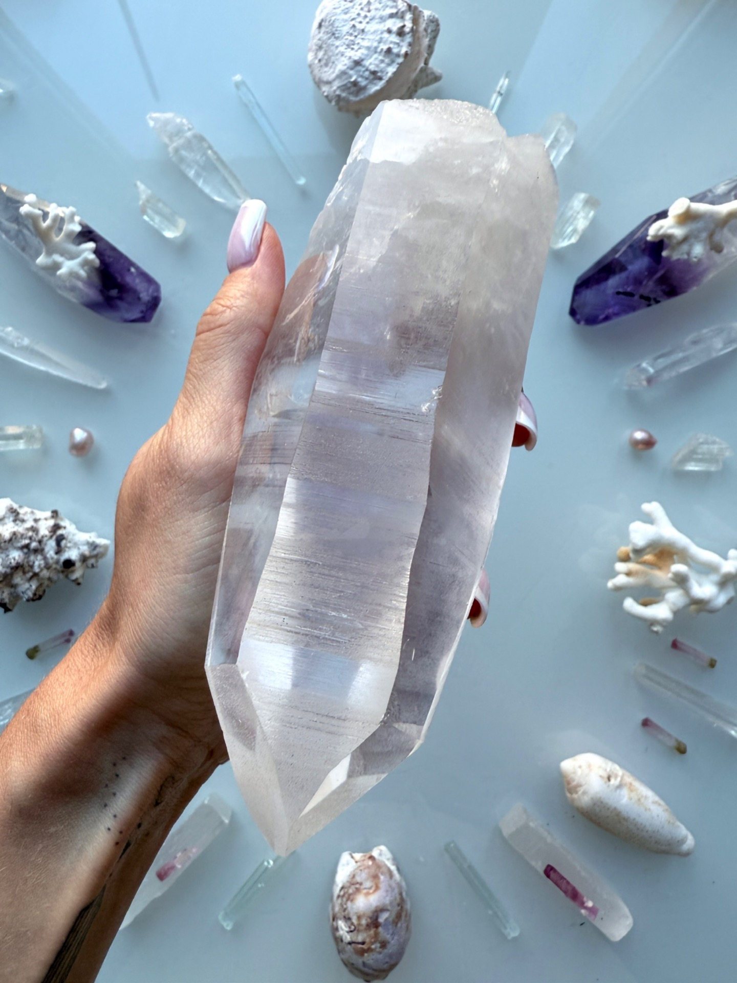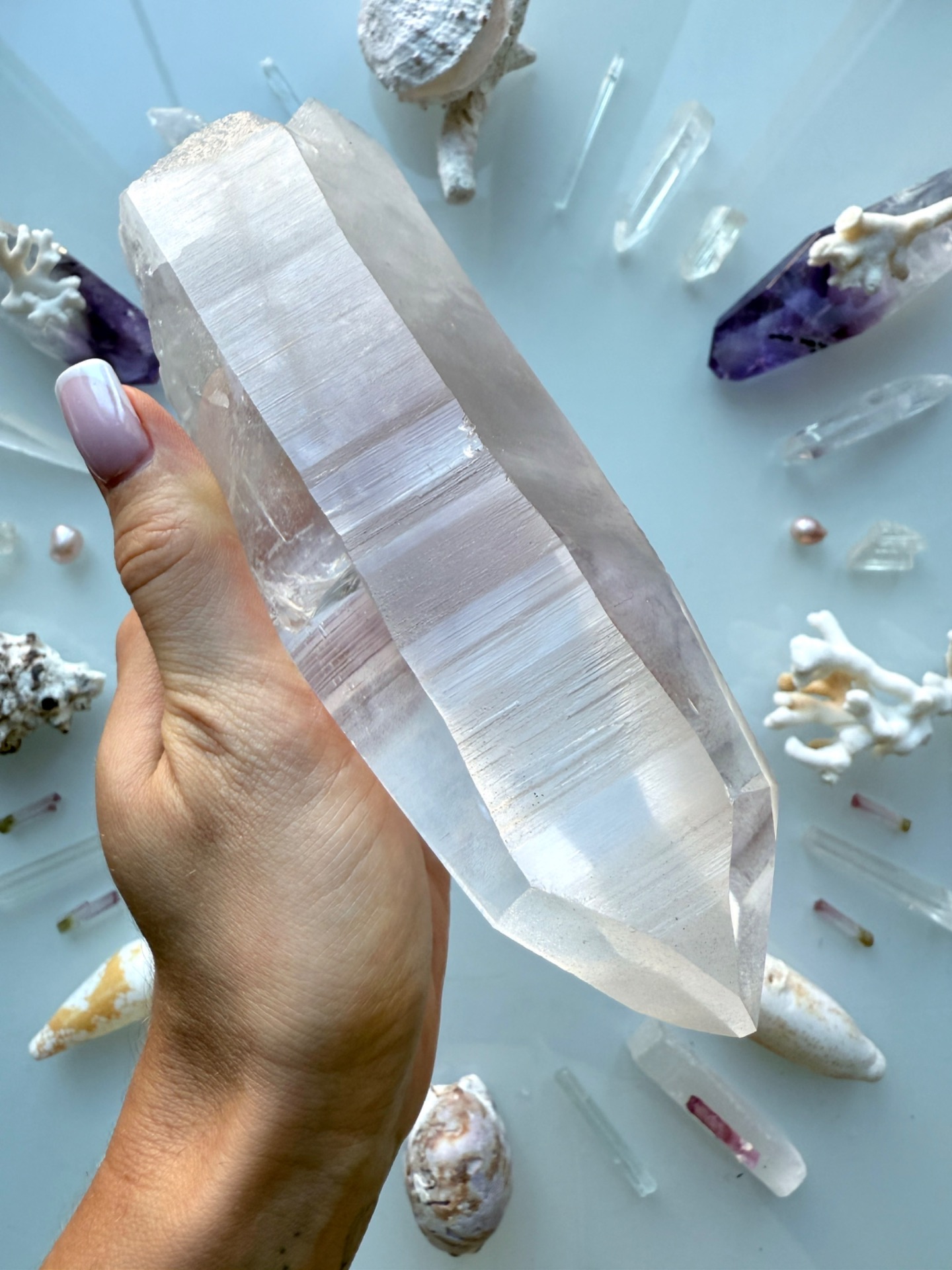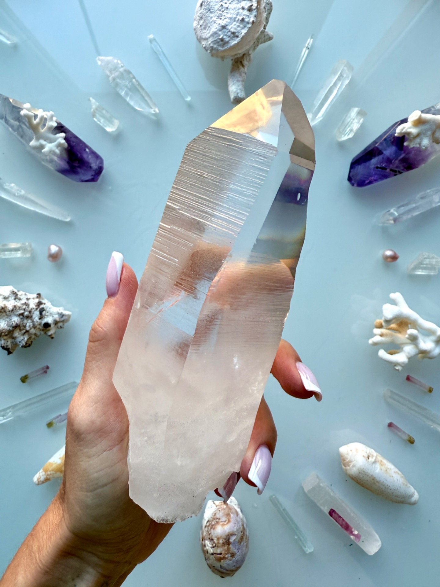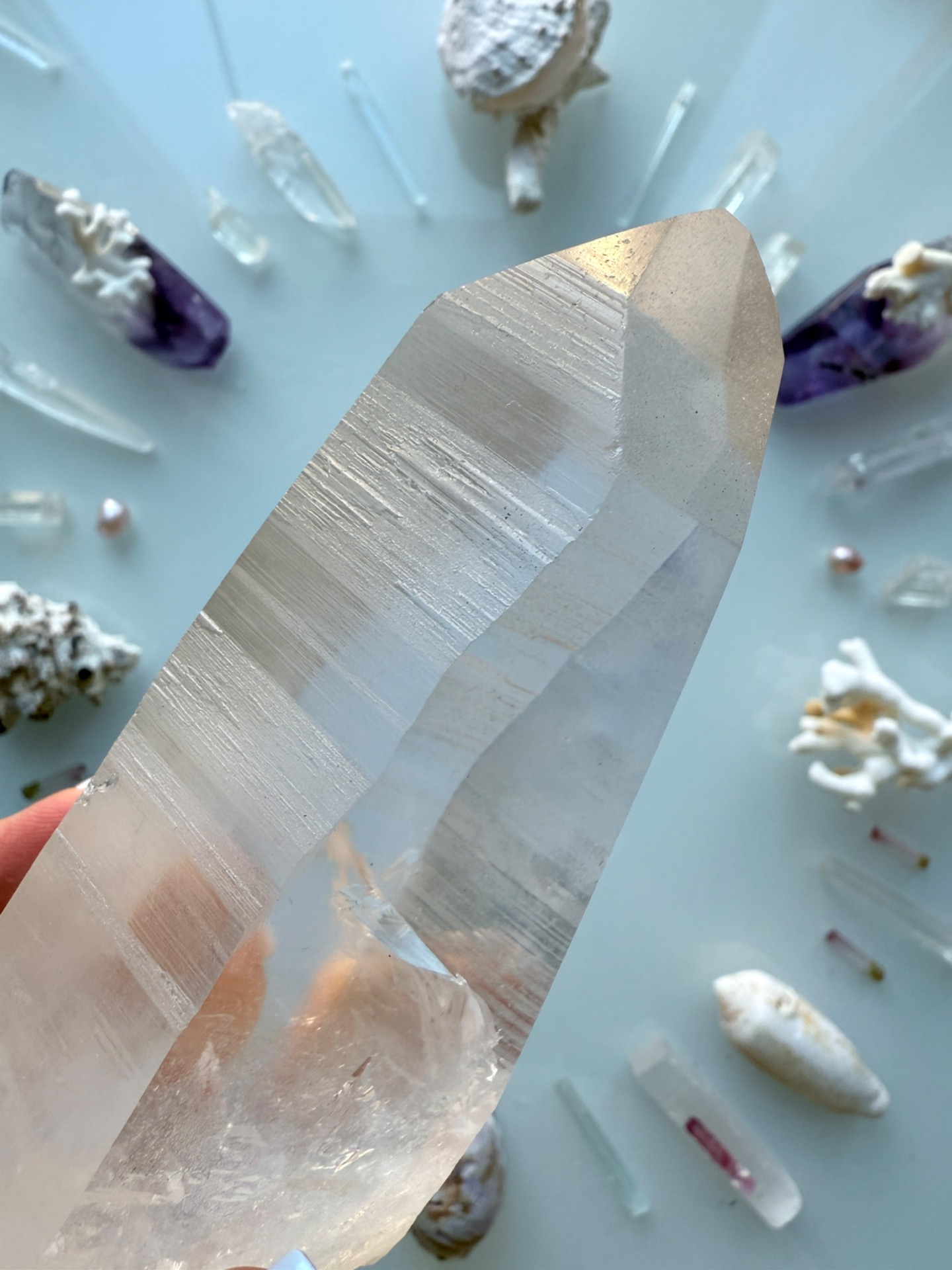 Nádherný, čistý, hluboký Lemurský křišťál, který je zároveň strážcem záznamů. Nese na své plošce trojúhelníčky jako uchované záznamy, kterých je tam mnoho.
