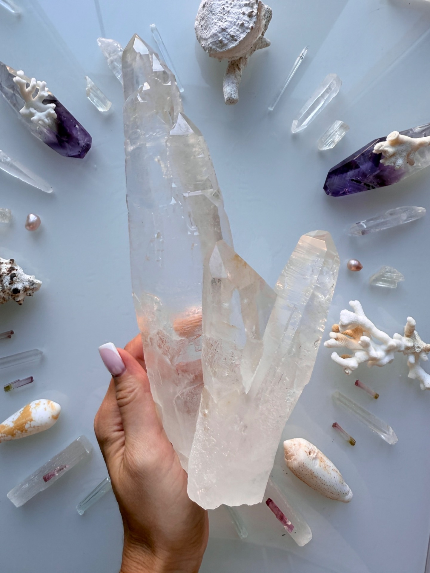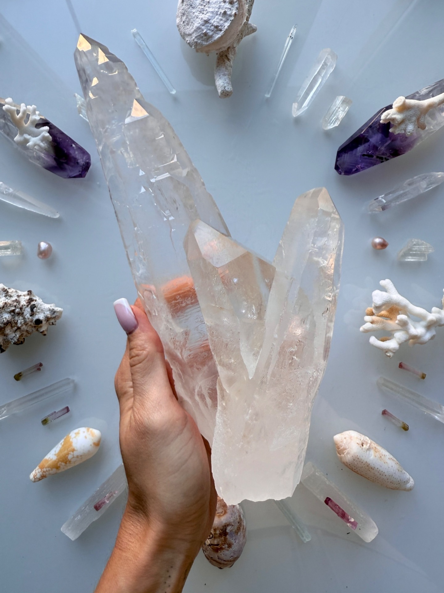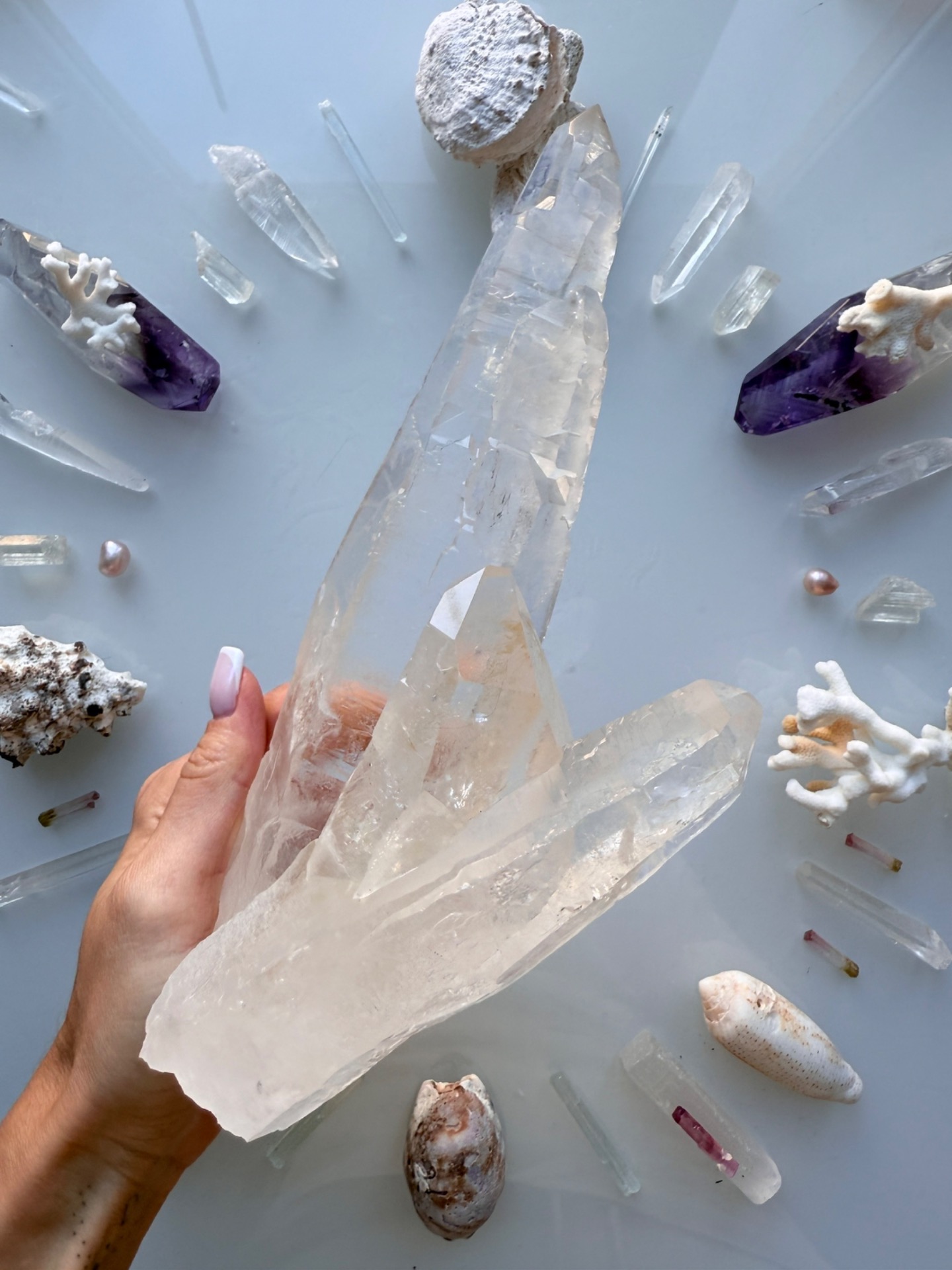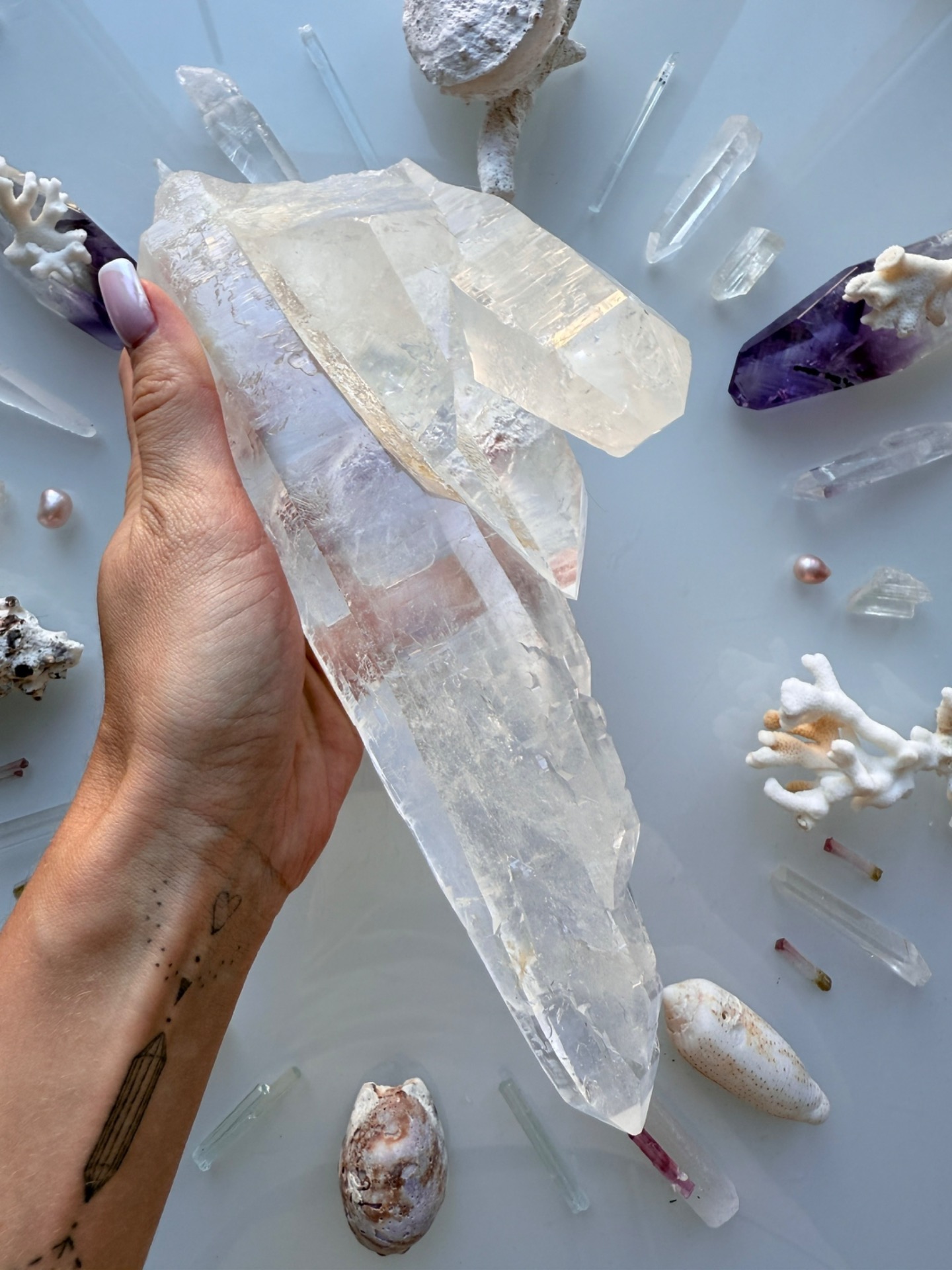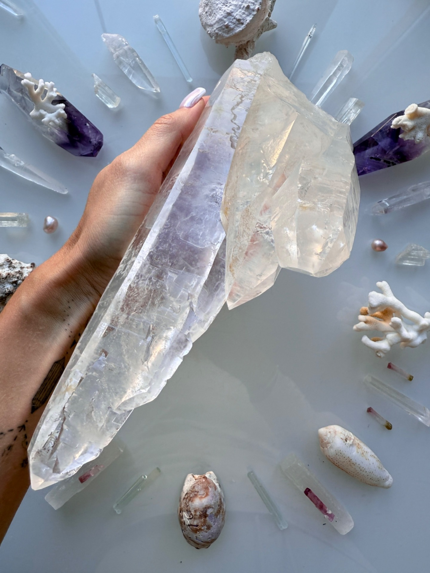 Nádherný surový světelný prastarý krystal Stařešina, který se hluboce dotkne tvé podstaty, neboť nese hlubokou moudrost, Vědění.