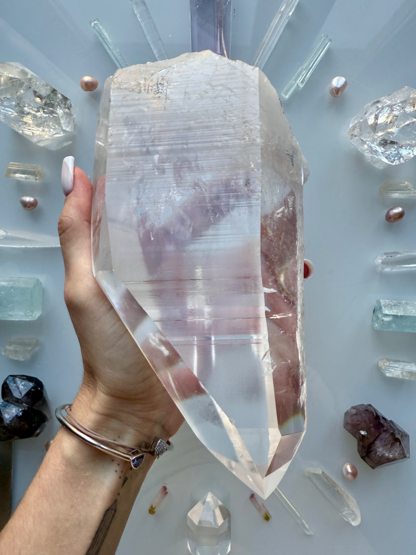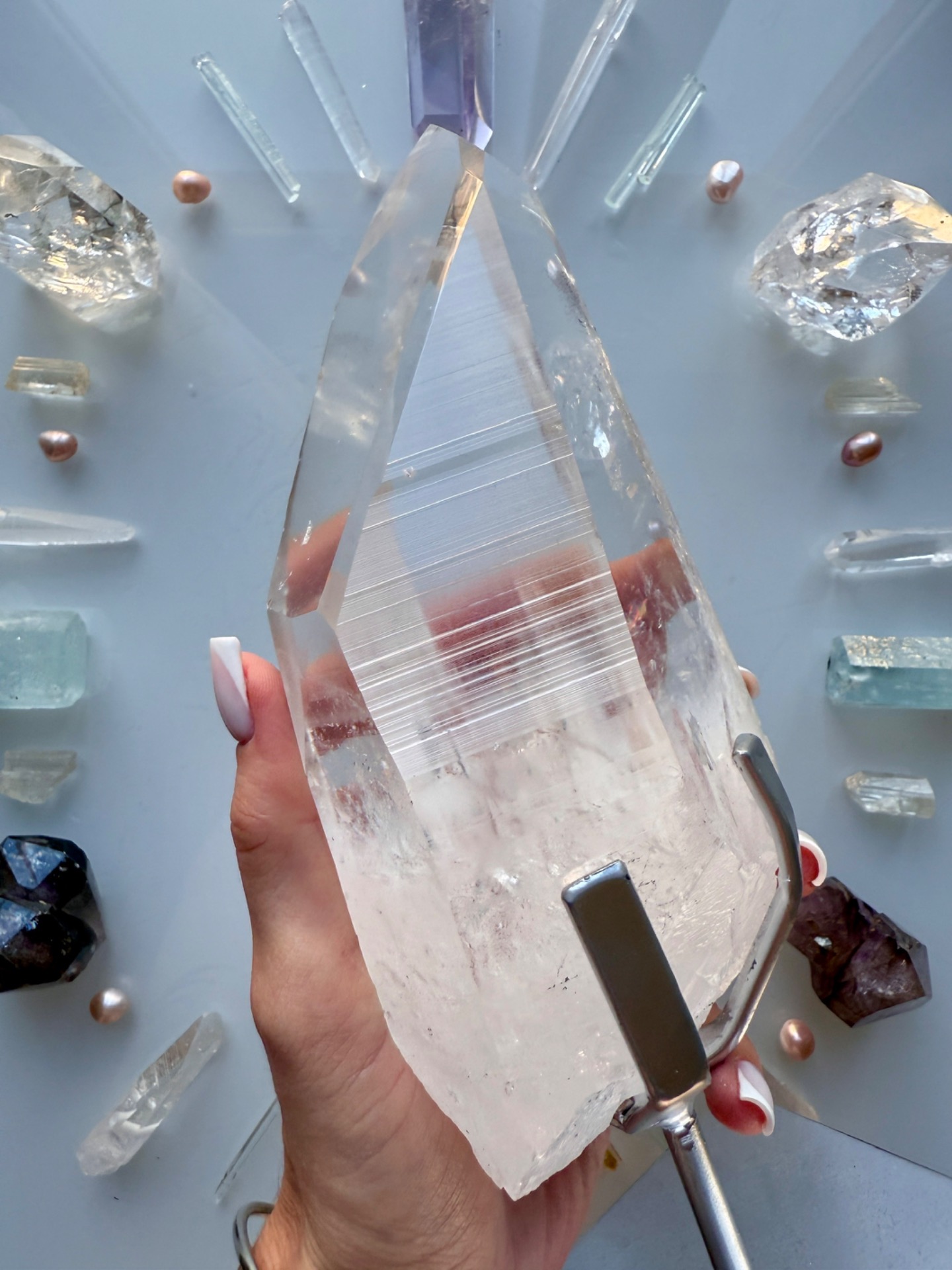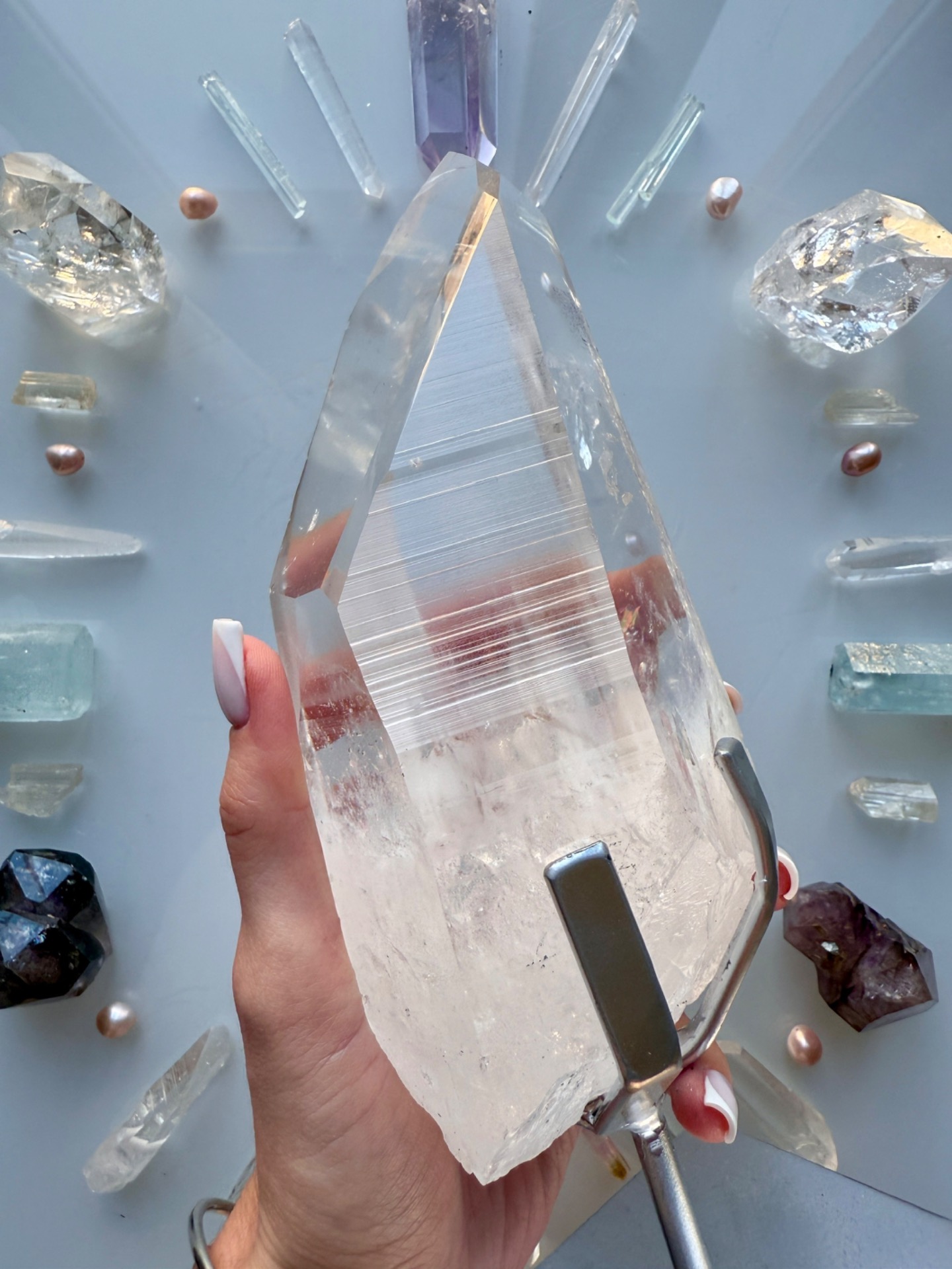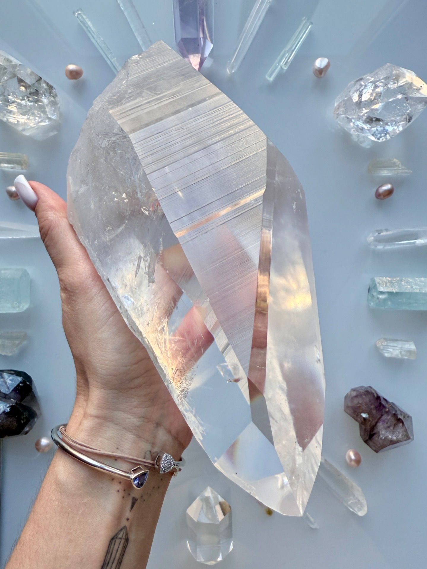 Ne jeho těle jsou z jedné strany i takové nově připojené křištálky, které nejsou na povrchu, ale prostupují do krystalu. Krystal se otevřel, aby přijal toto Nové Vědomí a energeticky tak vytvářel most mezi minulostí, Lemurií, naší pamětí a tím, co v Přítomnosti vytváříme.