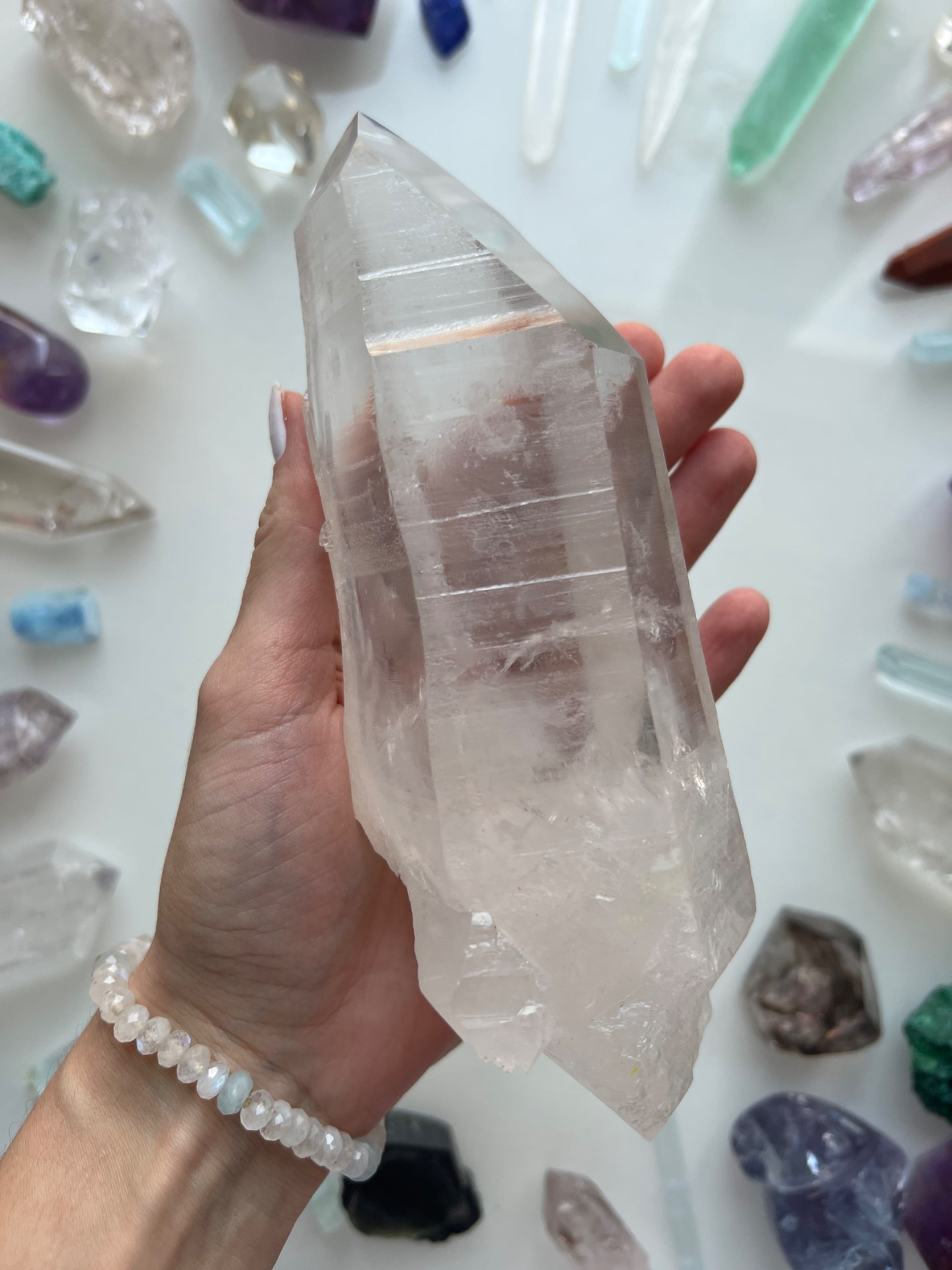 Nádherný, surový oboustranný křišťál, který zosobňuje hranici Země a Vesmíru. Tak jak je postavený, tak dolní strana - rozvětvená zastupuje Zemi a jsou zde ukotvené záznamy.