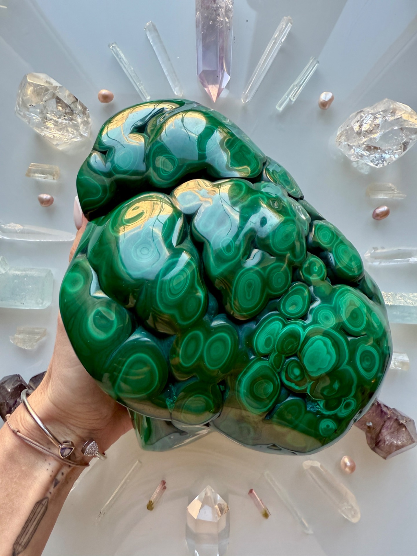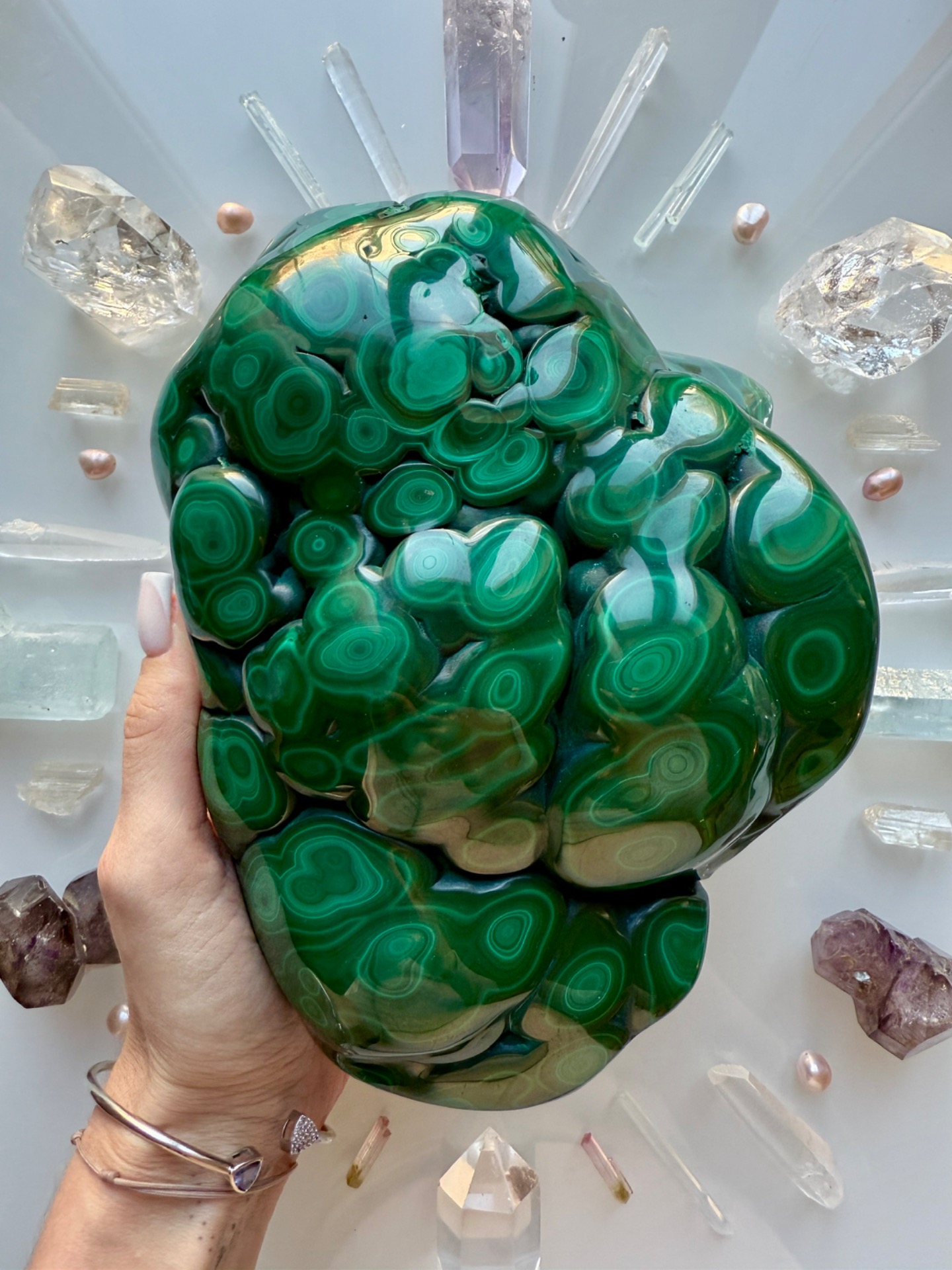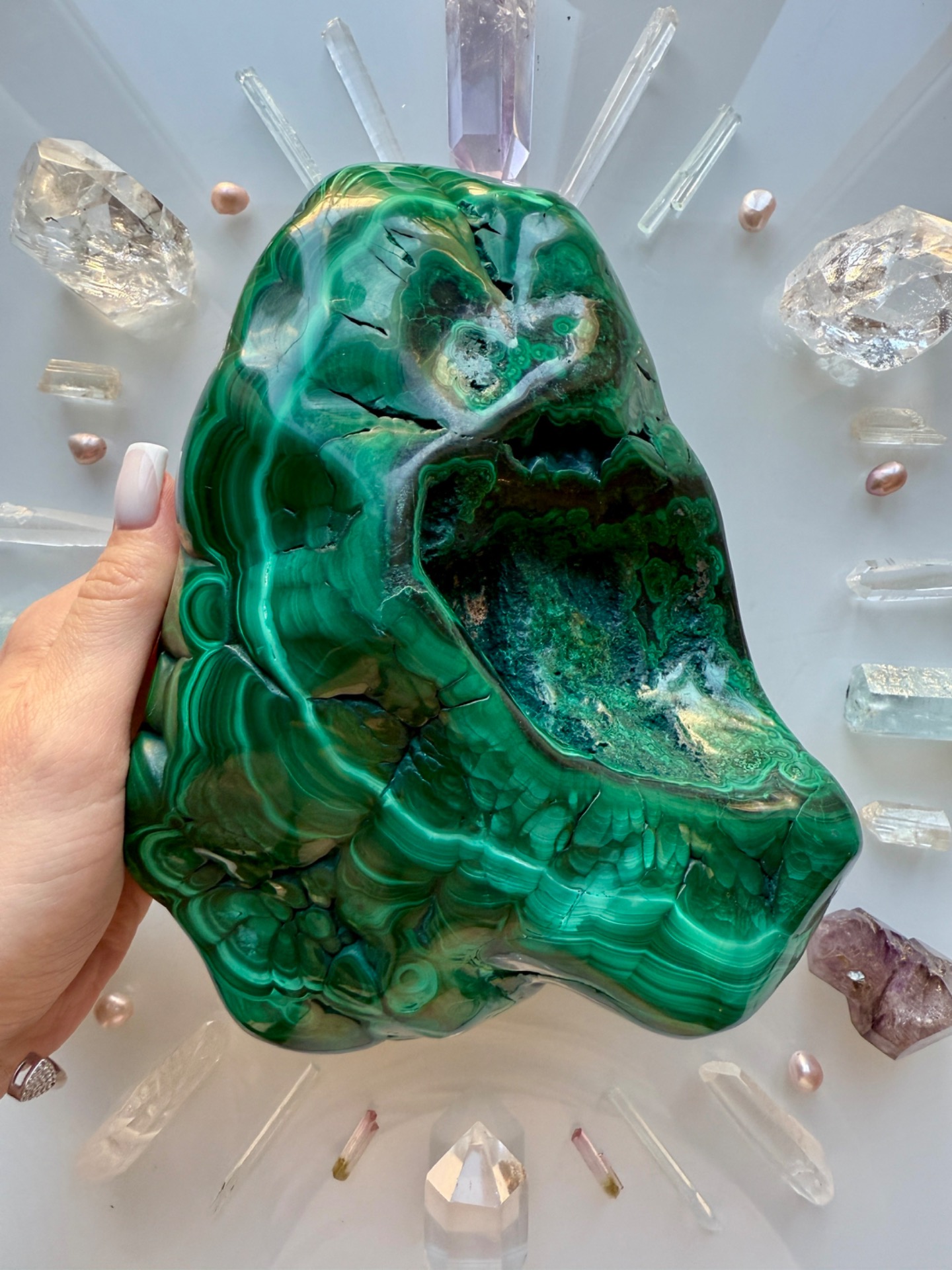 Výjimečný mistrovský velký Malachit vhodný do prostoru, kde může léčit. díky jeho silnému vibračnímu dosahu.