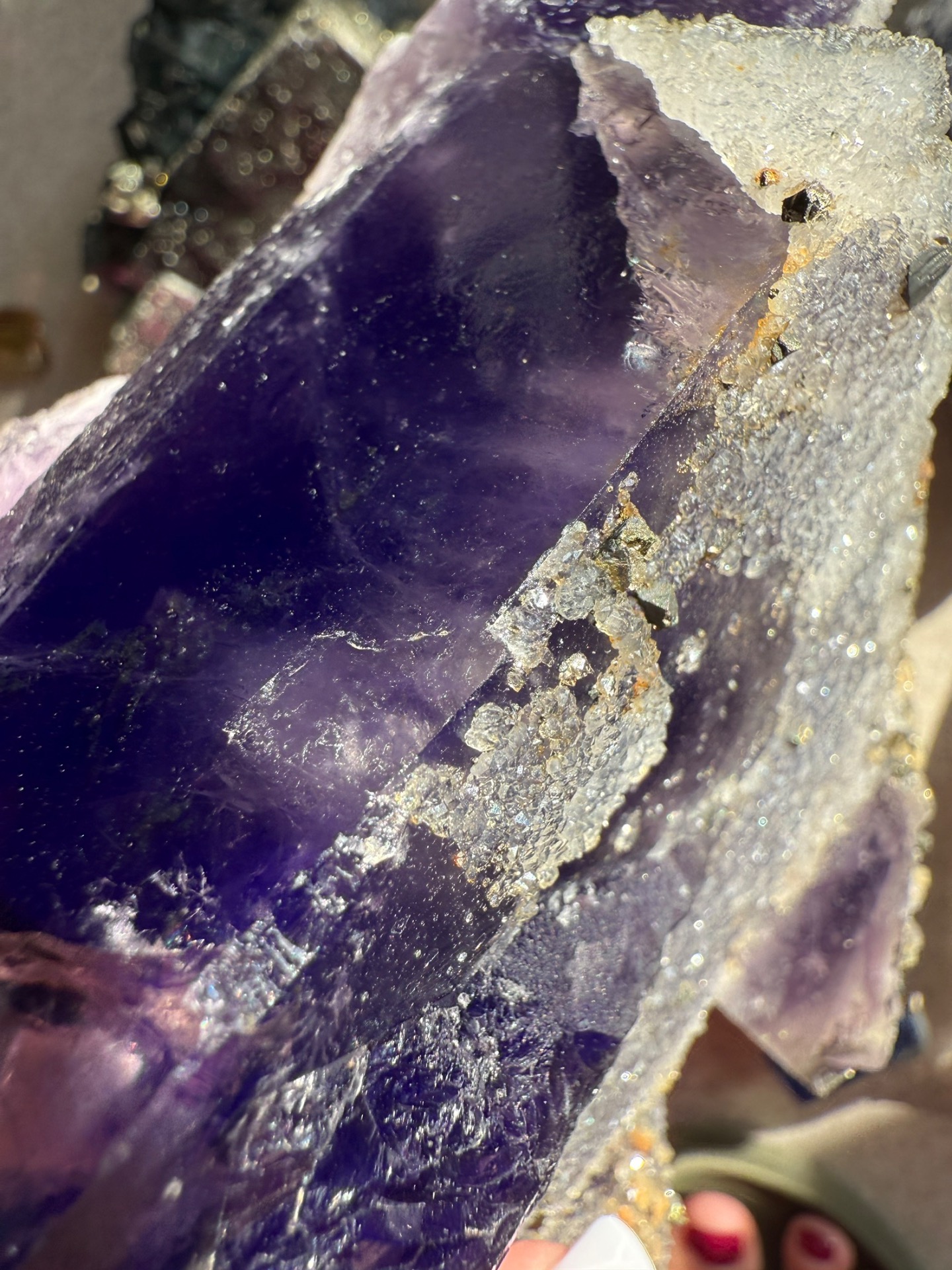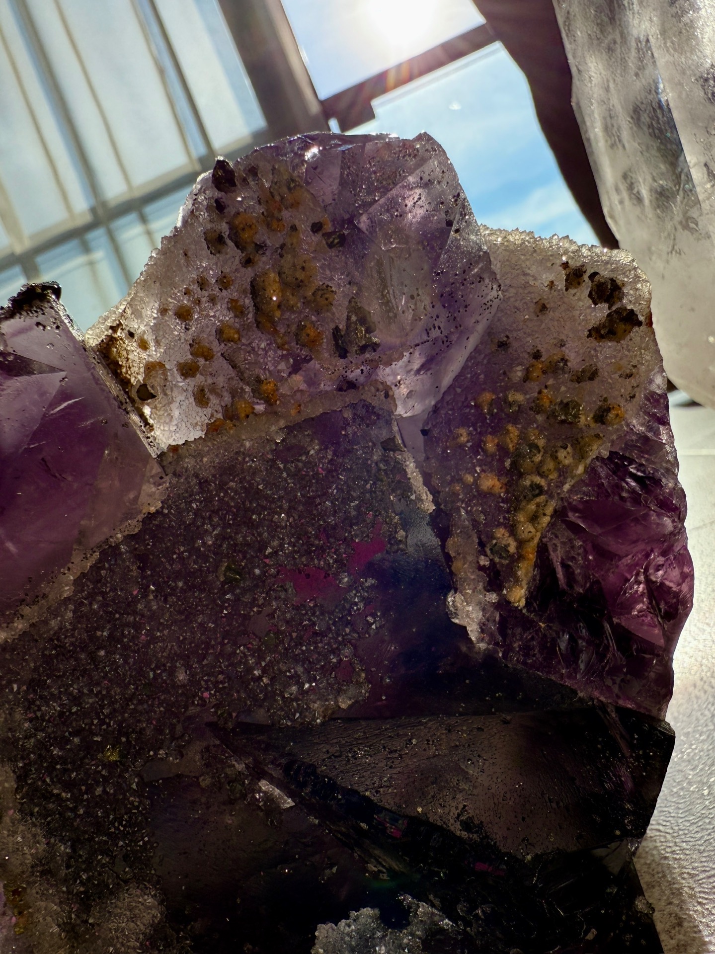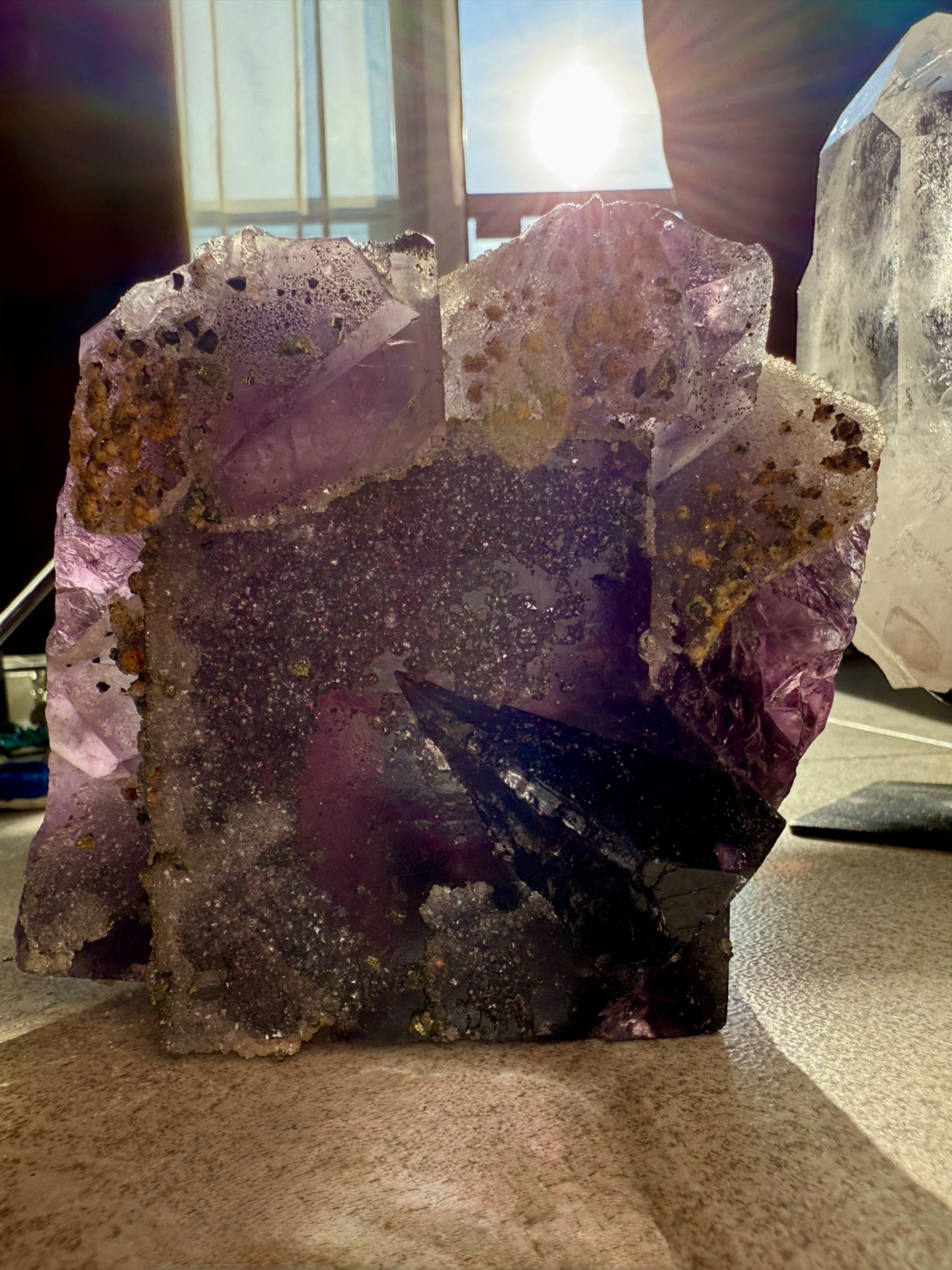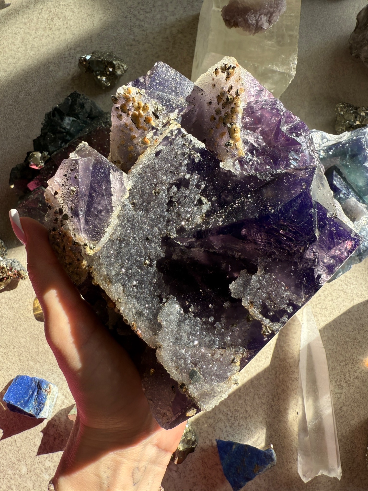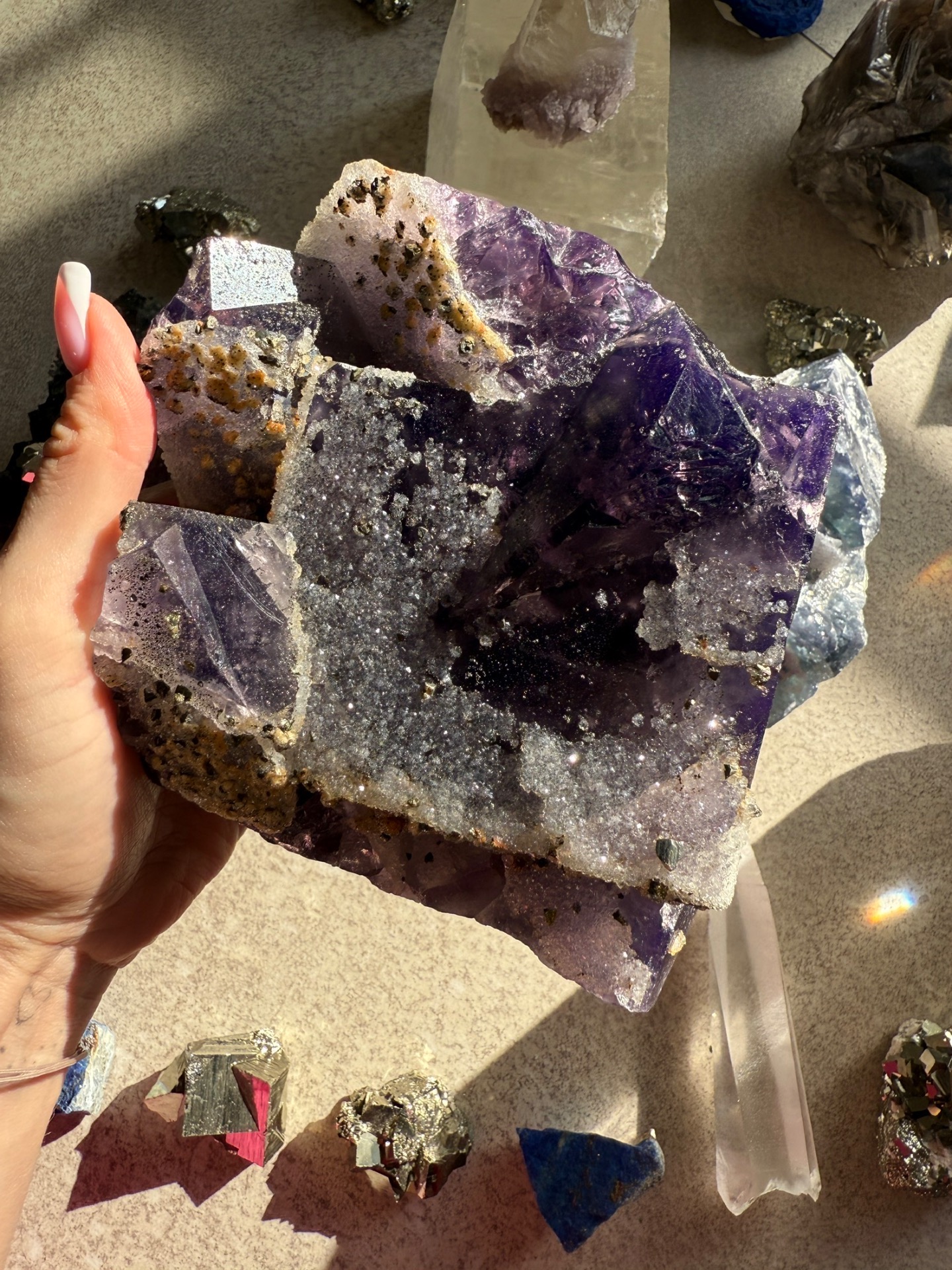 Mistrovský fialový fluorit, na kterém je upět zlatý pyrit. Jedná se tak o silné propojení fialového paprsku a zlatých kódů hojnosti.