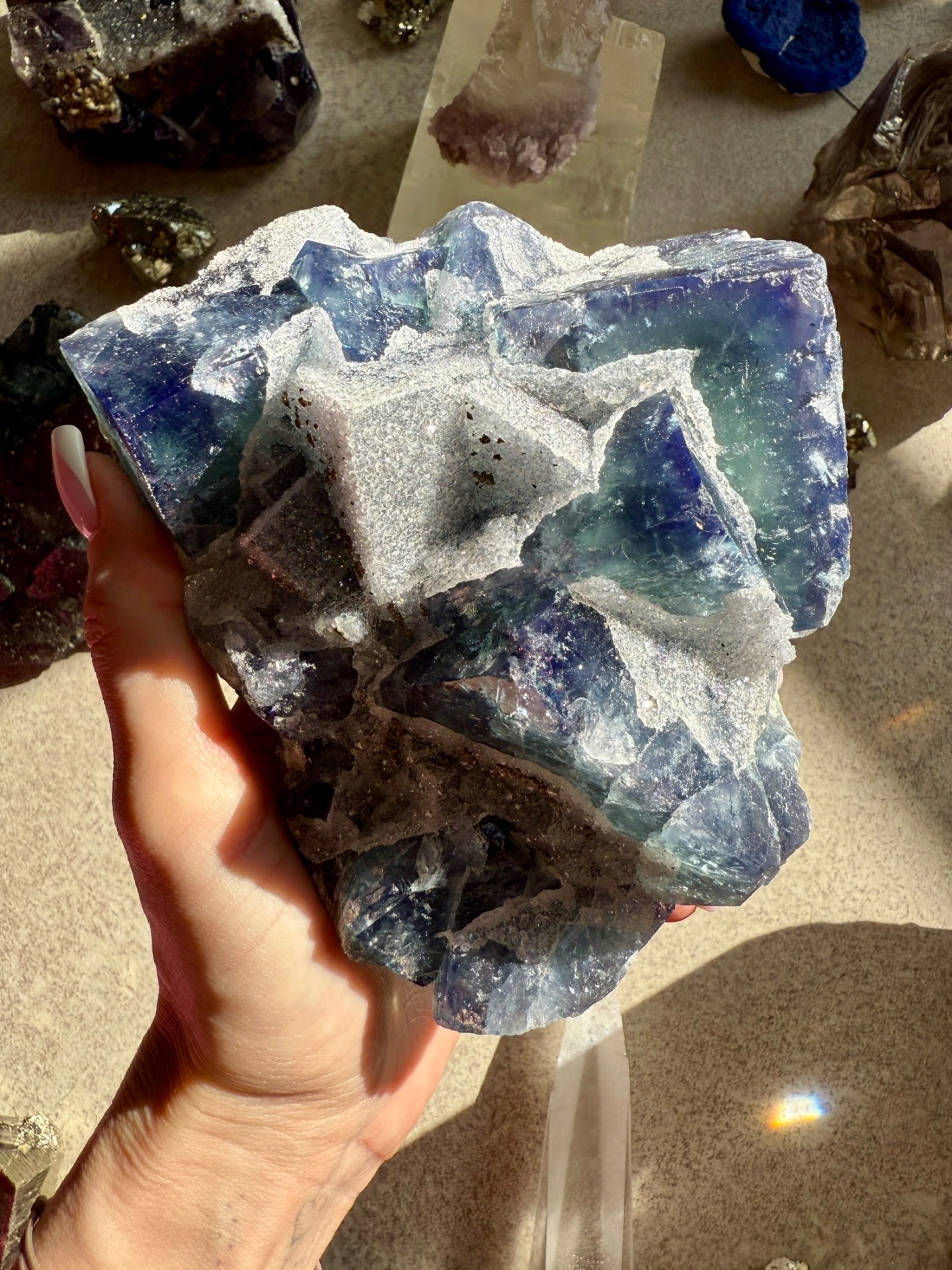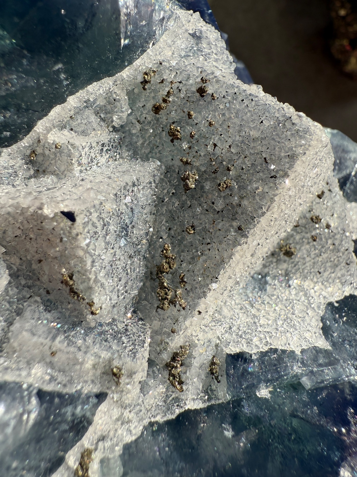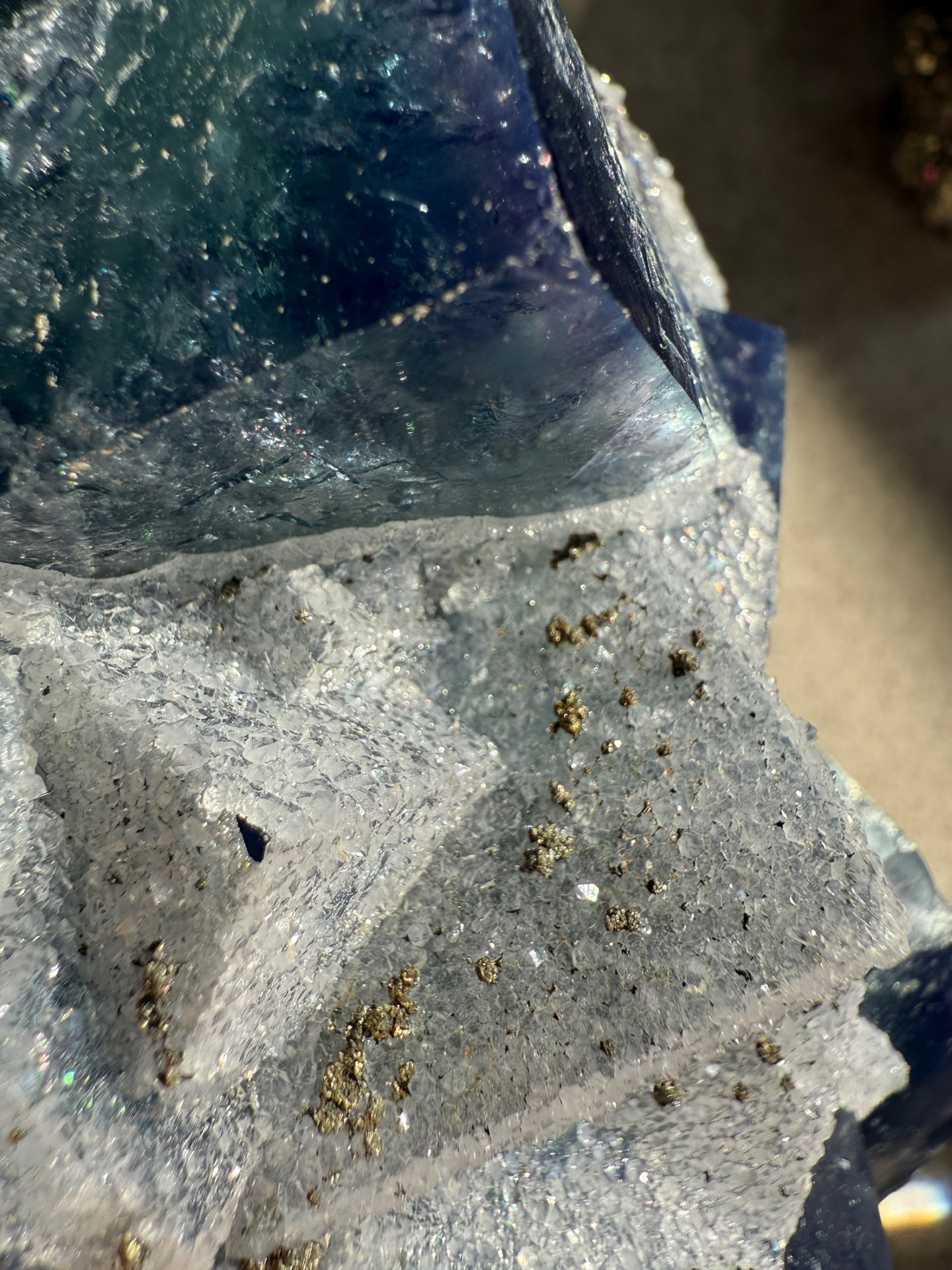 Mistrovský surový zeleno-fialový fluorit, na kterém je krásná krystalizace a navíc jím prochází cestička zlatého pyritu.