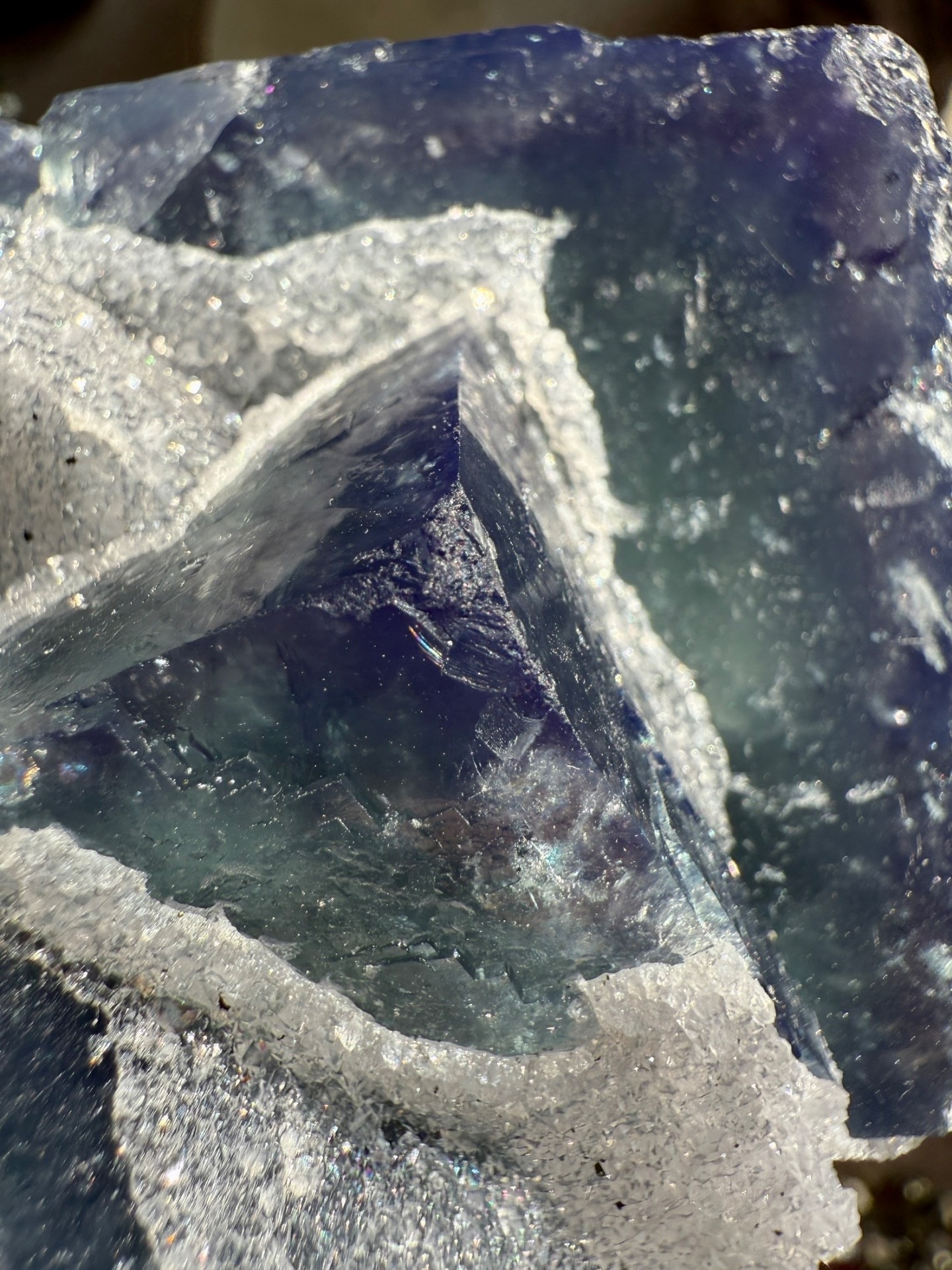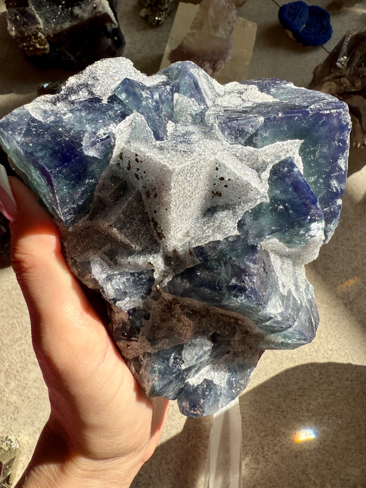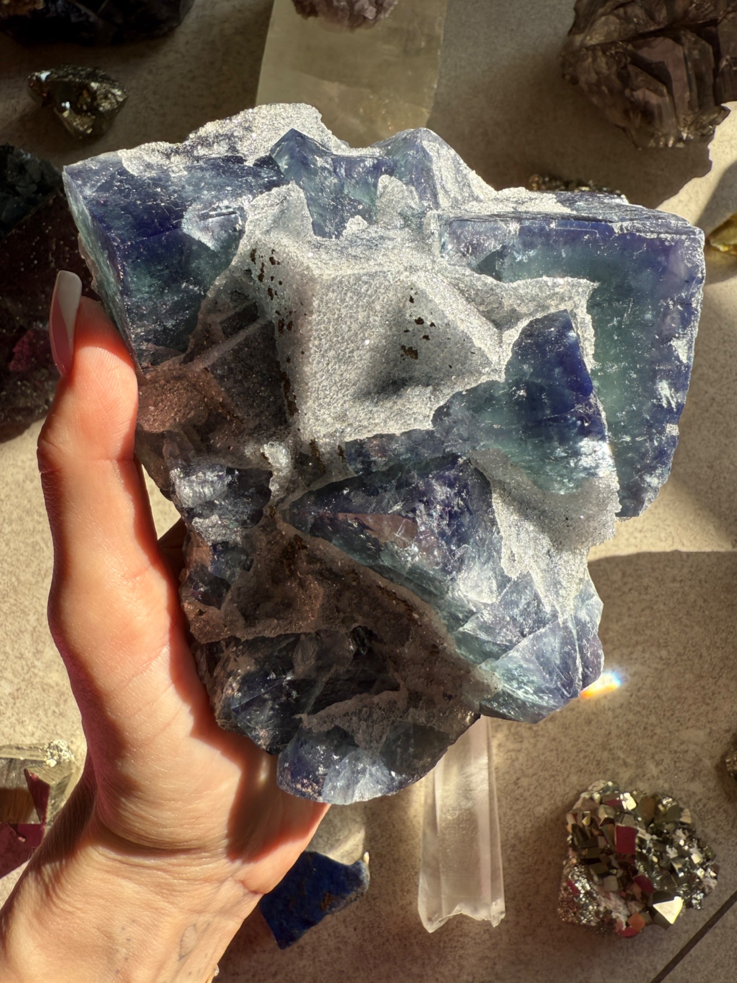 Mistrovský surový zeleno-fialový fluorit, na kterém je krásná krystalizace a navíc jím prochází cestička zlatého pyritu.