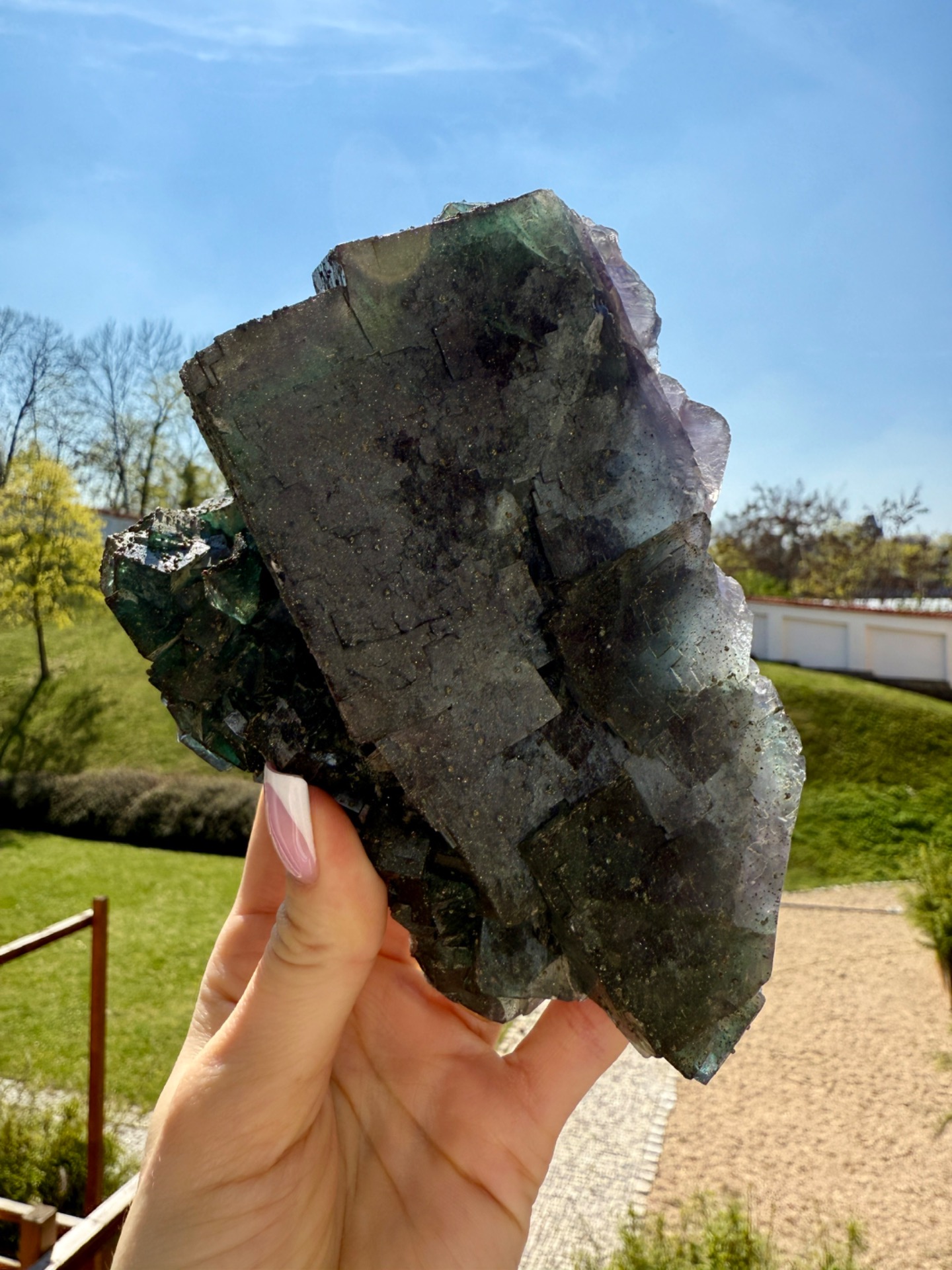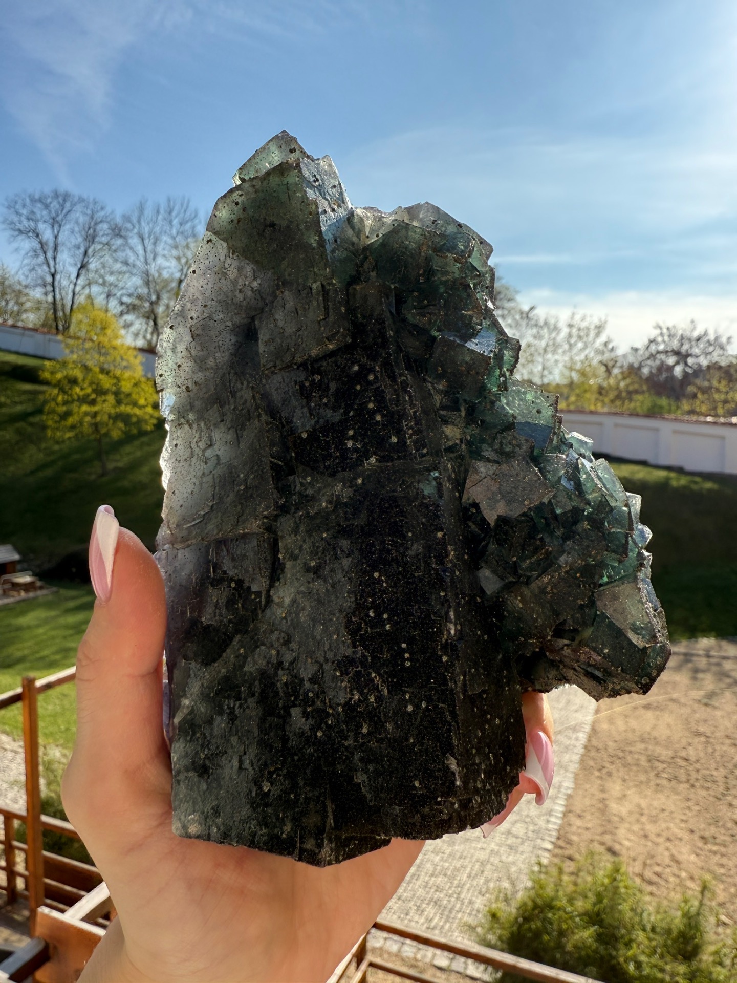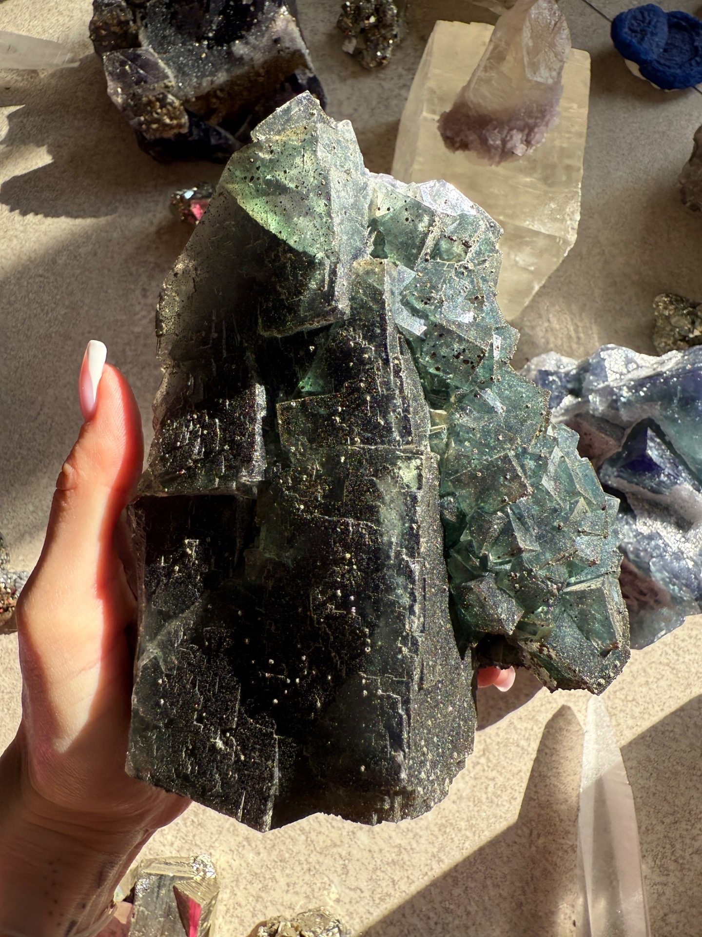 Unikátní zelený fluorit jako surový krystal, na kterém je rozeset zlatý pyrit. Tento krystal je takový jiný, než jiné zelené pyrity, které jsou léčitelské. Tento navíc léčení zeleným paprskem předává i poléčení vztahu k hojnosti / penězům / hodnotě jako tokové. Sebehodnotě a Harmonii.