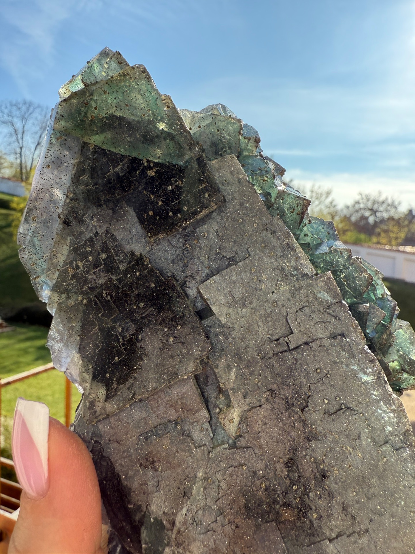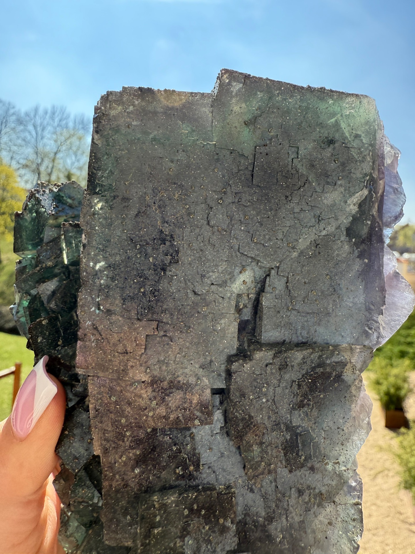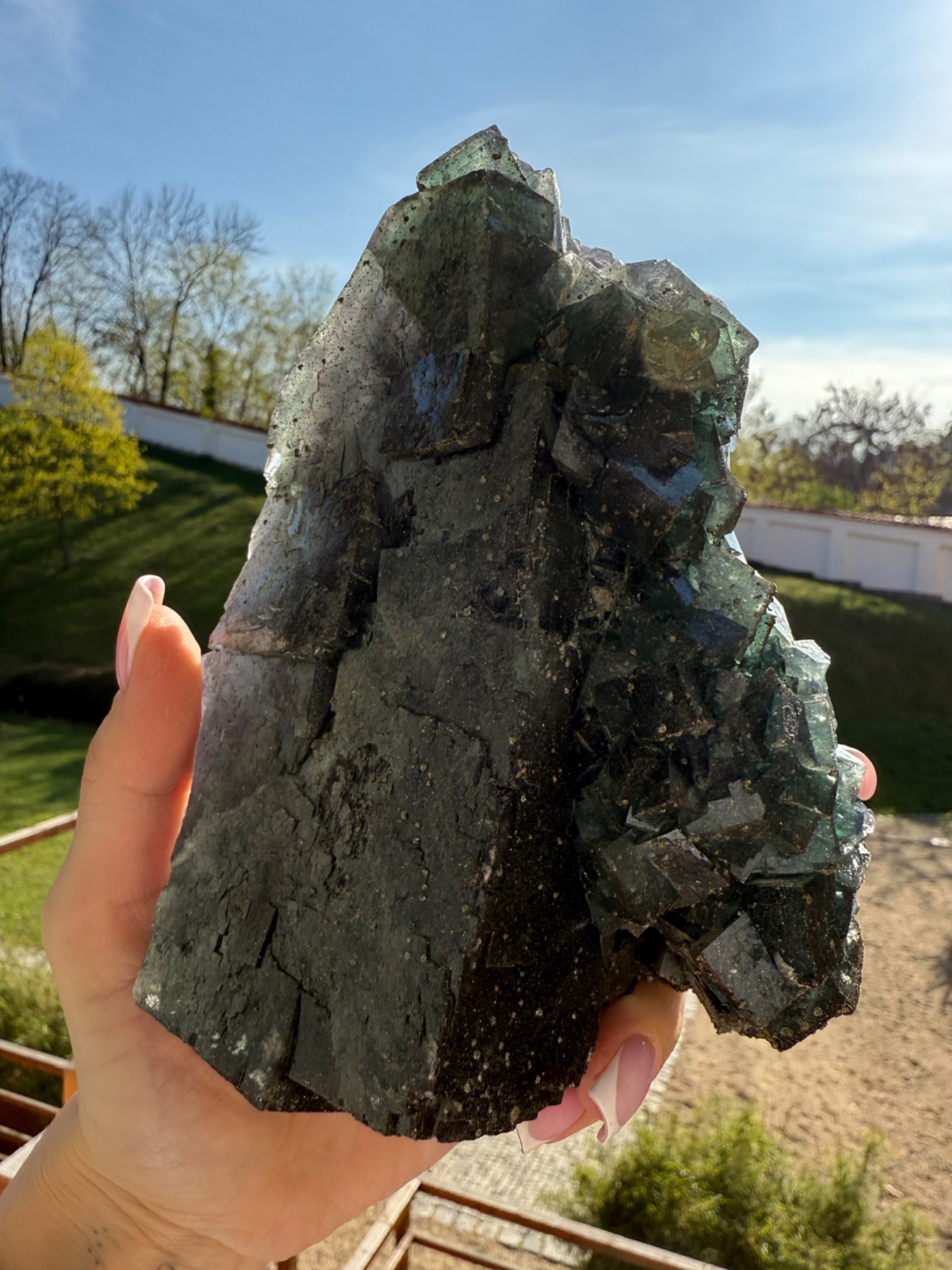 Unikátní zelený fluorit jako surový krystal, na kterém je rozeset zlatý pyrit. Tento krystal je takový jiný, než jiné zelené pyrity, které jsou léčitelské. Tento navíc léčení zeleným paprskem předává i poléčení vztahu k hojnosti / penězům / hodnotě jako tokové. Sebehodnotě a Harmonii.