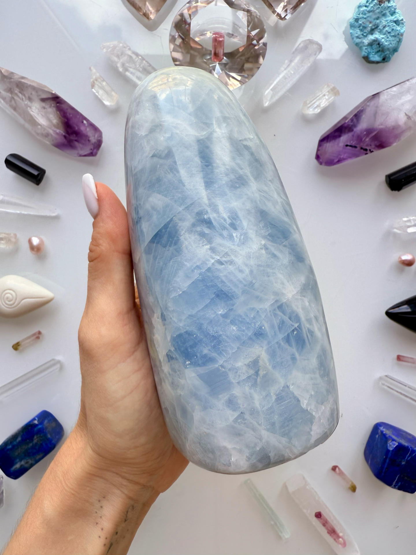 Nádherný modrý kalcit úžasné kvality má velmi jemné, laskavé, milující a příjemné vibrace.