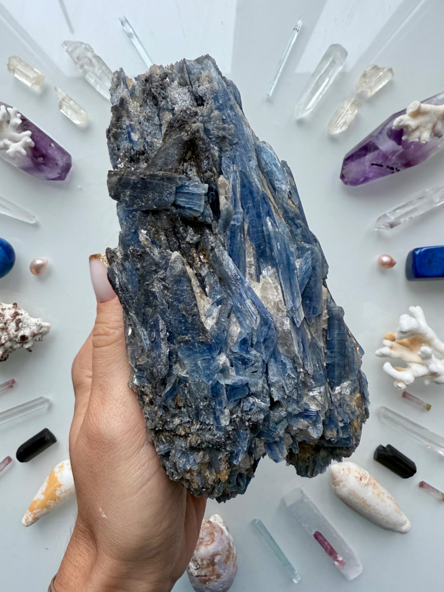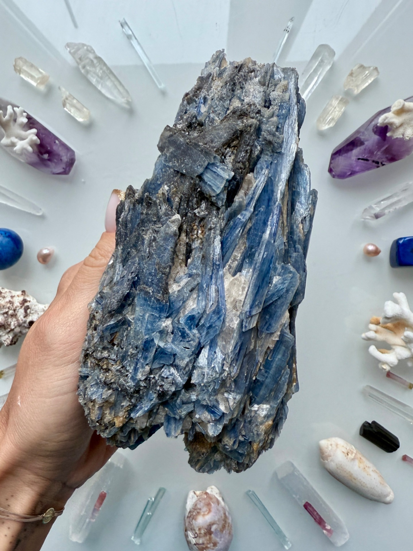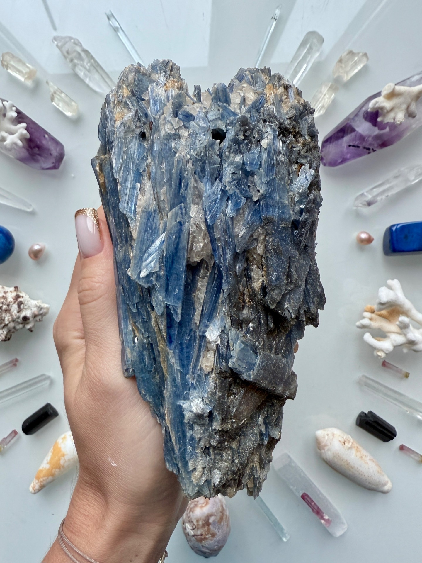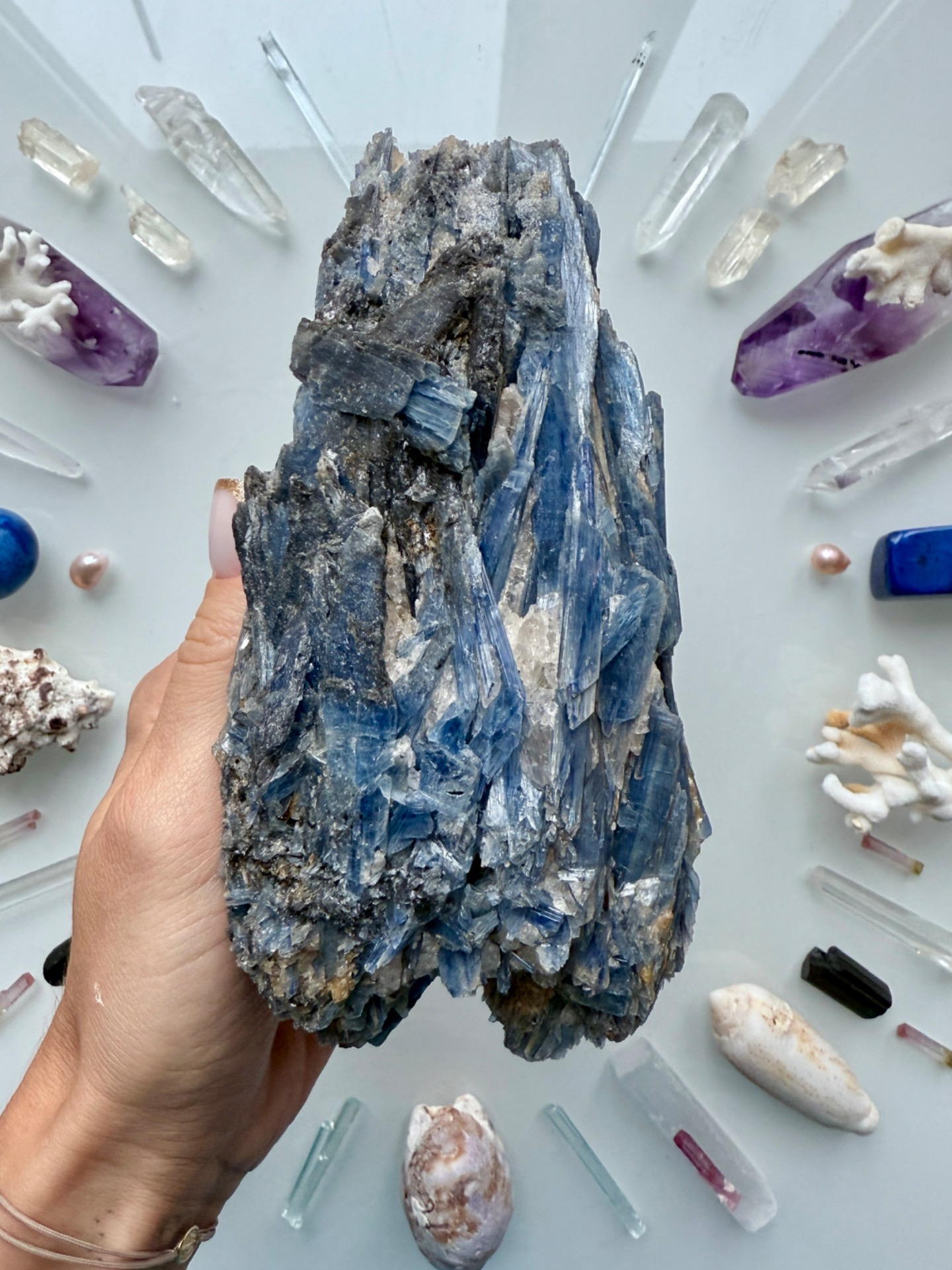 Nádherný krystalický Kyanit. Tento kámen je propojený s bytostmi Modrého paprsku (Blue Avian, Sírius, Plejády, Arkturiáni, energie Krále Artuše a kulatého stopu...), Rasy a bytosti, kteří s námi pracují a pomáhají nám na naší cestě Vzestupu a v komunikaci s Vyšší Sférou.
