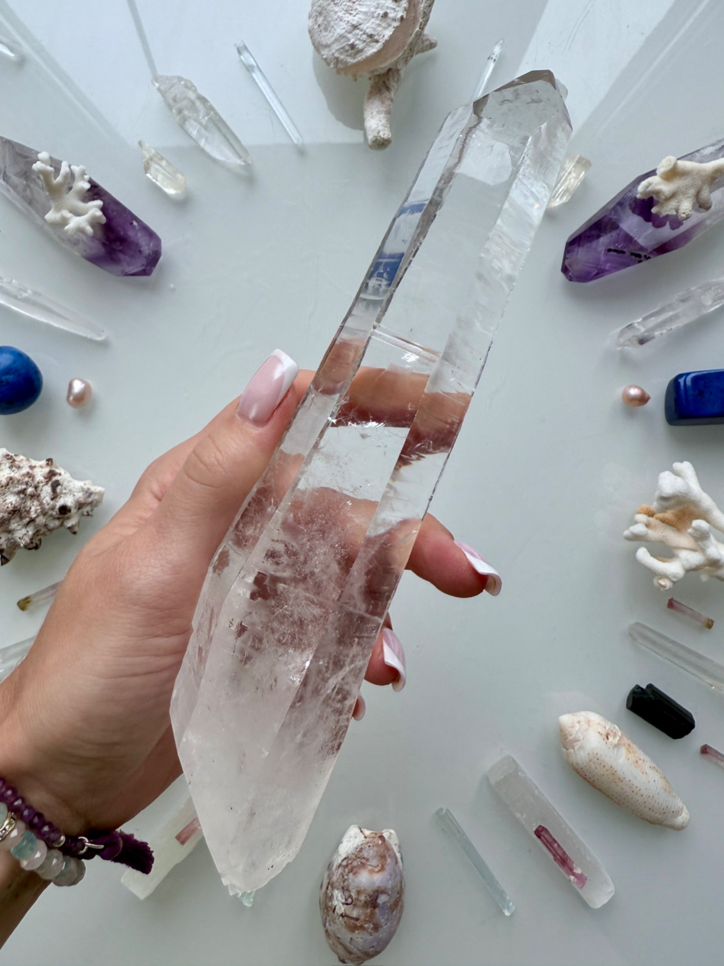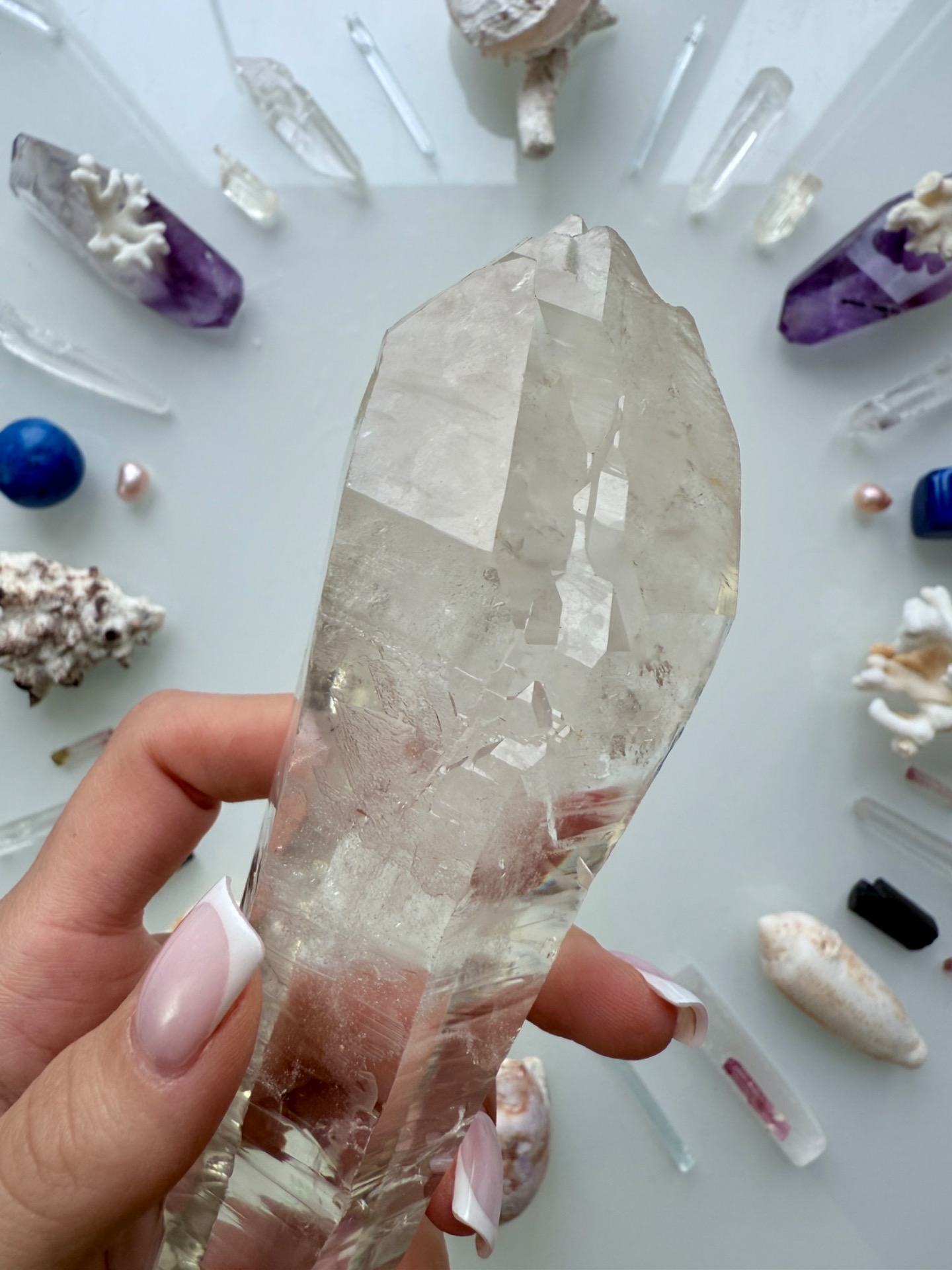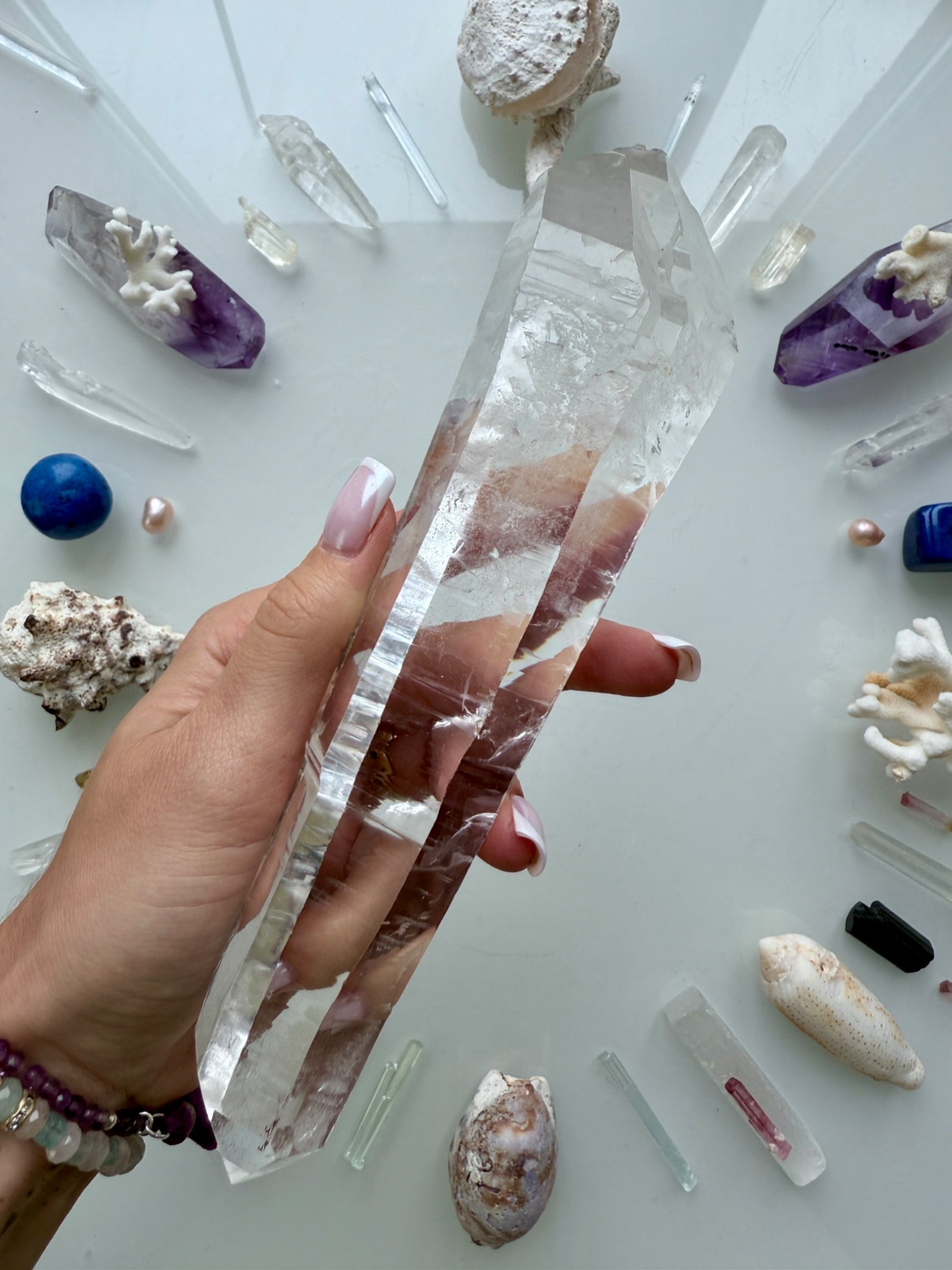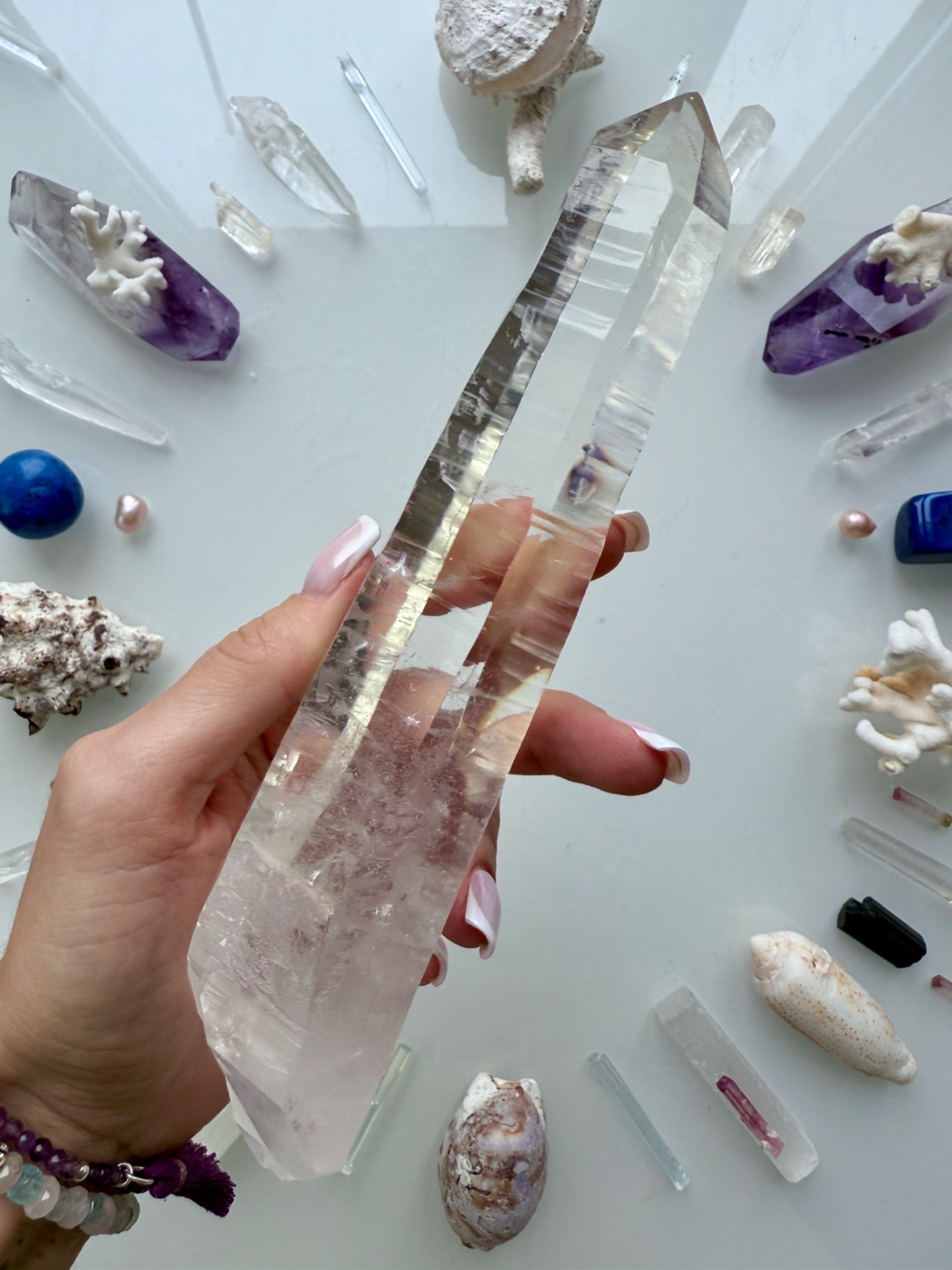 Jedná se o velmi čistý, průzračný krystal s aktivní křemíkovou energií, Silné krystalické Světlo jako mistr, který vás paprskem vezme na místa, která jsou s vámi propojená. Do katedrál a učení ze sfér, které jsou vaším domovem.