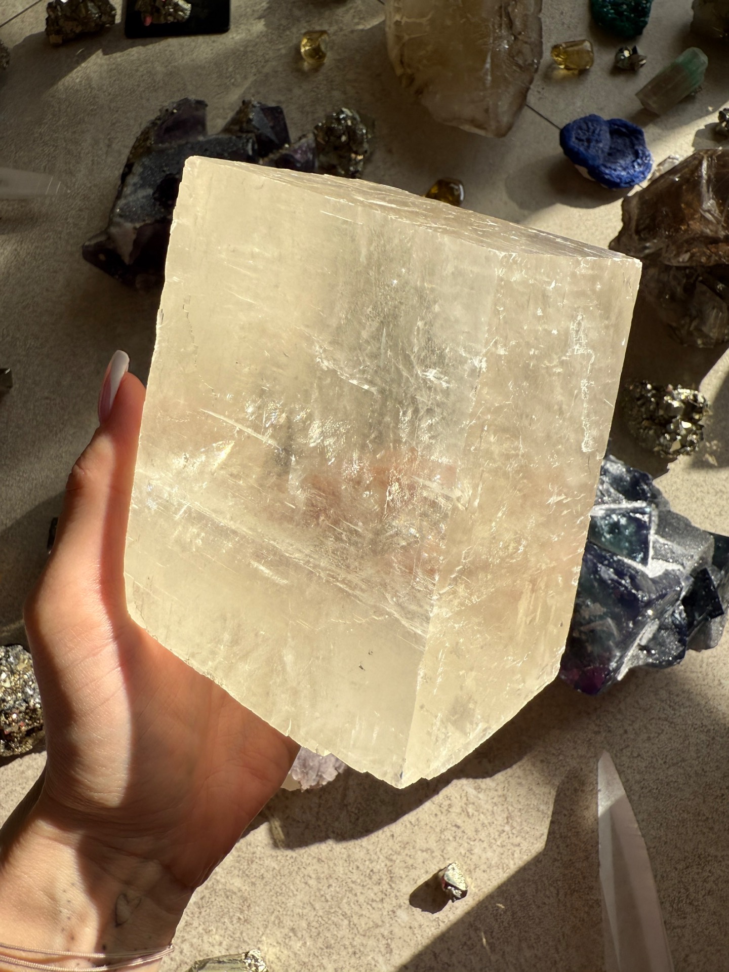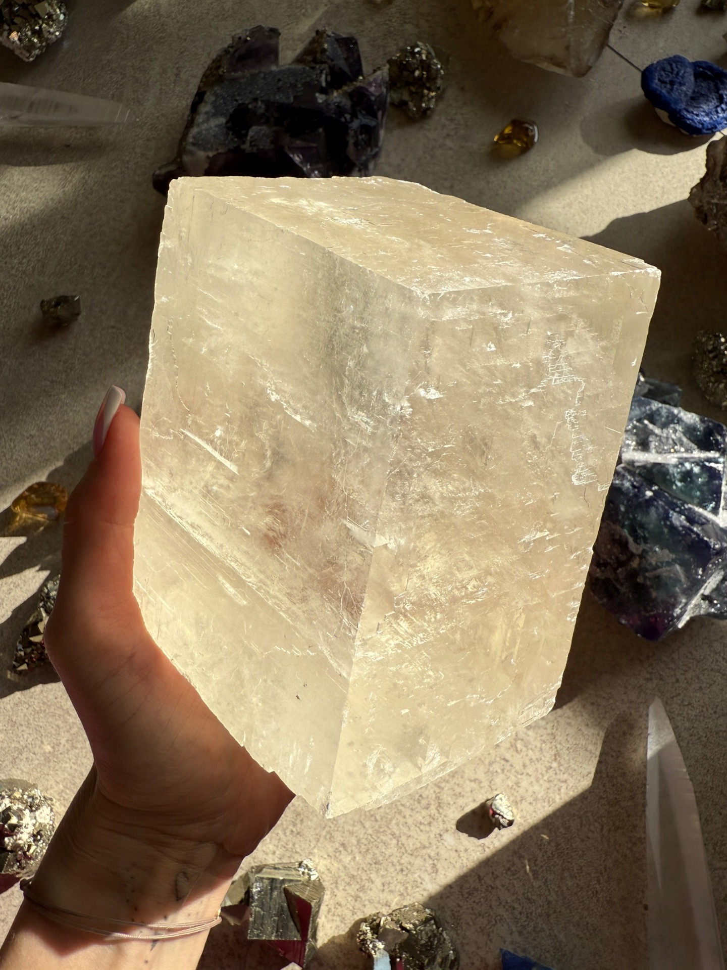 Nádherný, velký zlatý kalcit má dar zesilovat energie díky svojí schopnosti dvojlomu - neboli vše, co kalcitem prochází, se zdvojí.