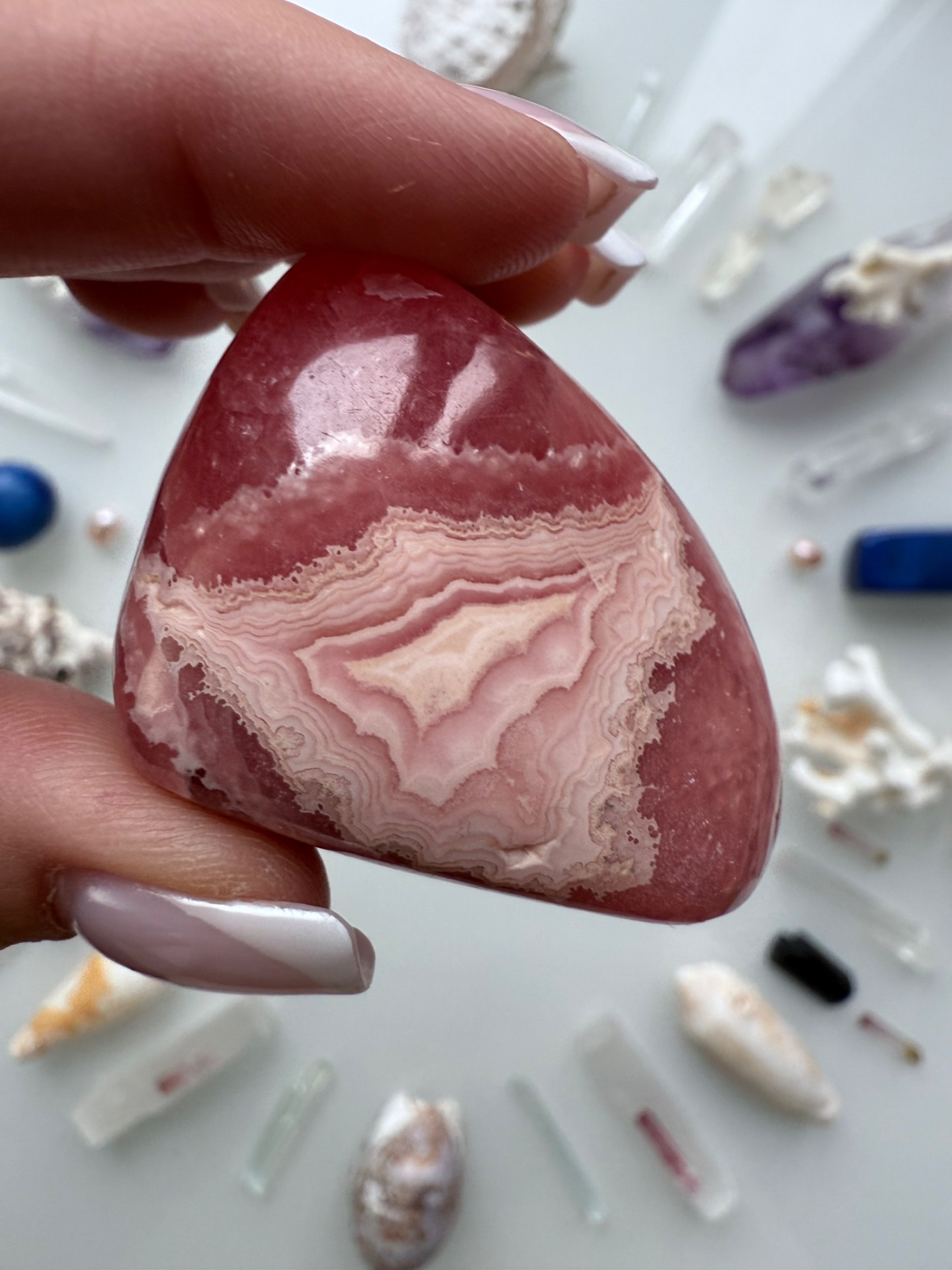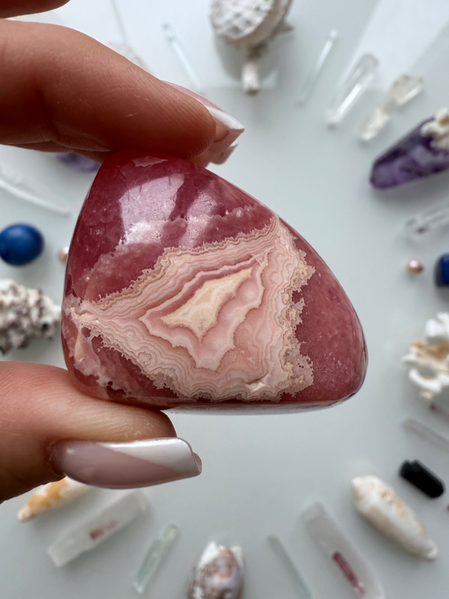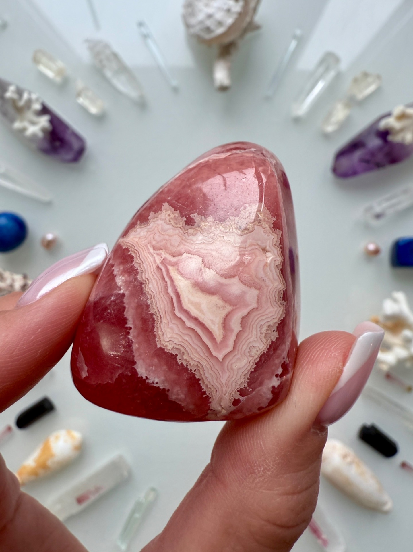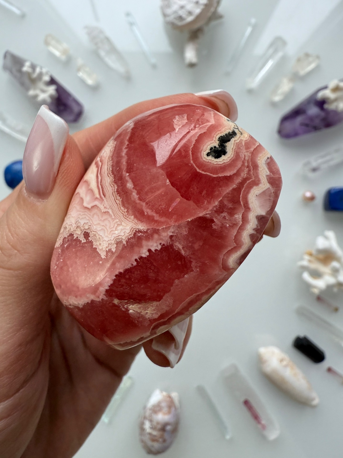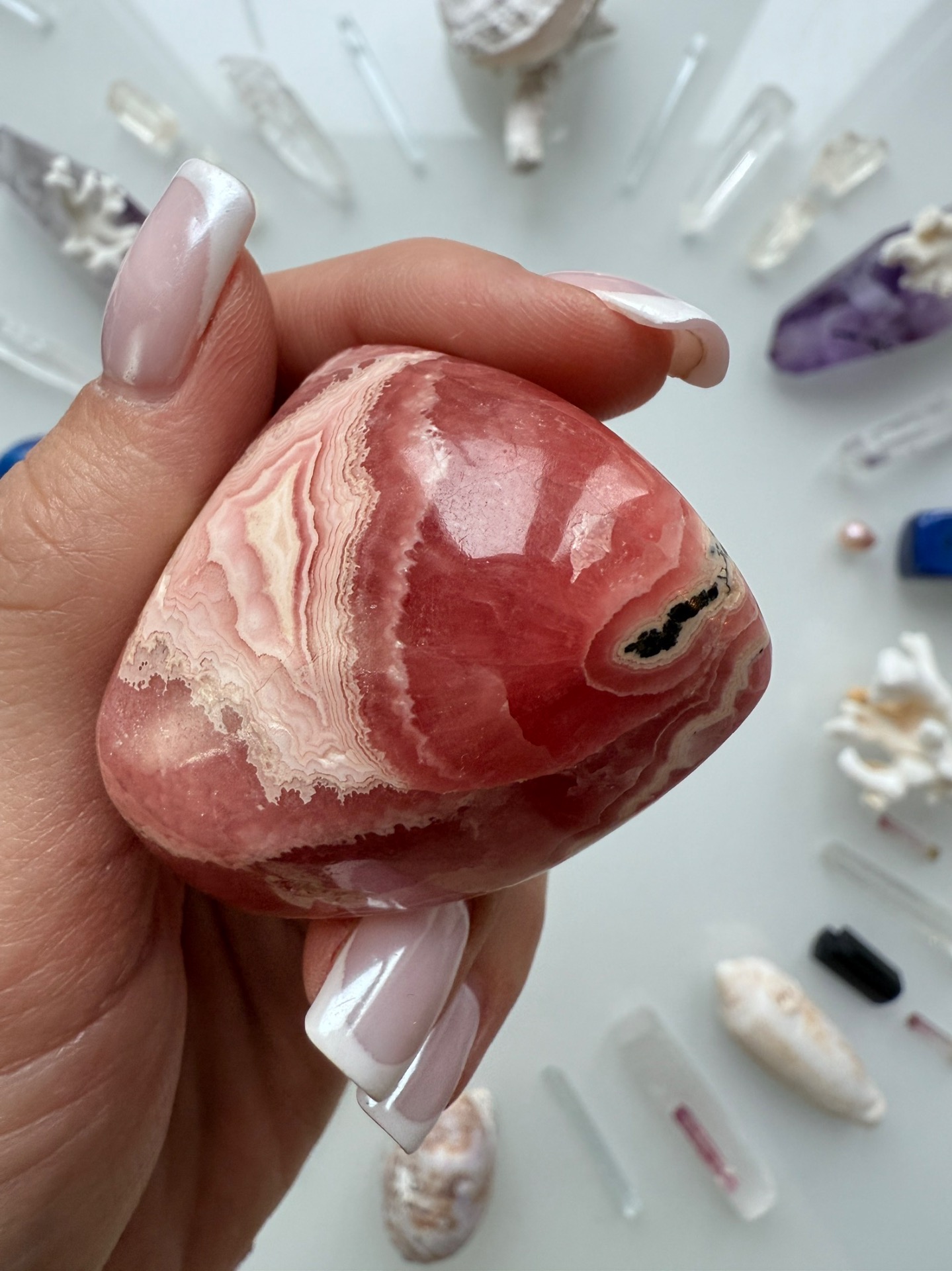 Nádherný a kvalitou úžasný silný krystal plné barvy Rodochrozitu z Perú nese silnou koncentrovanou energii, která paprskem a energií zastupuje živel ohně a dokáže nejen v našem srdci, ale také v těle znovu pocítit podstatu našeho života, našeho bytí.