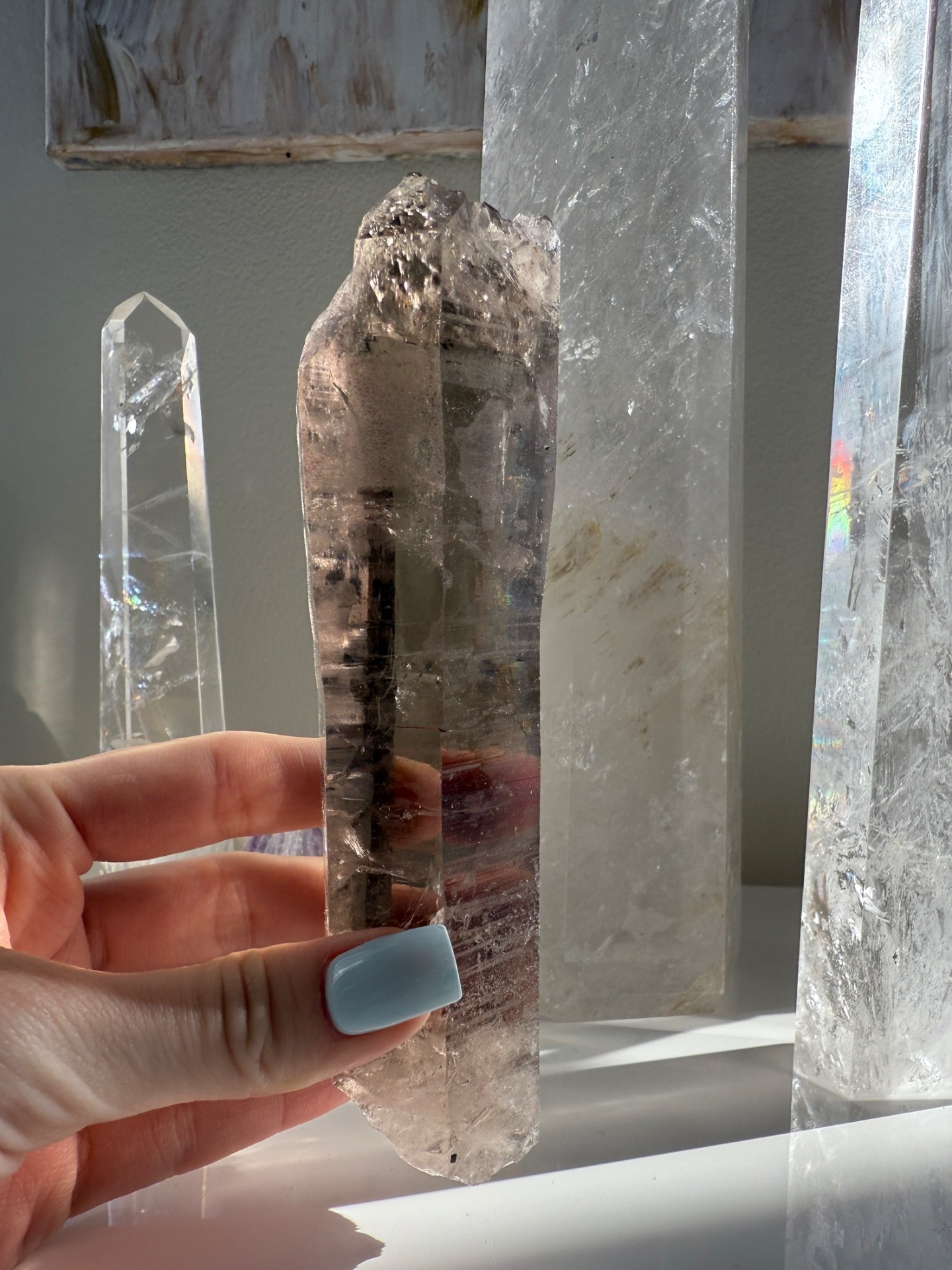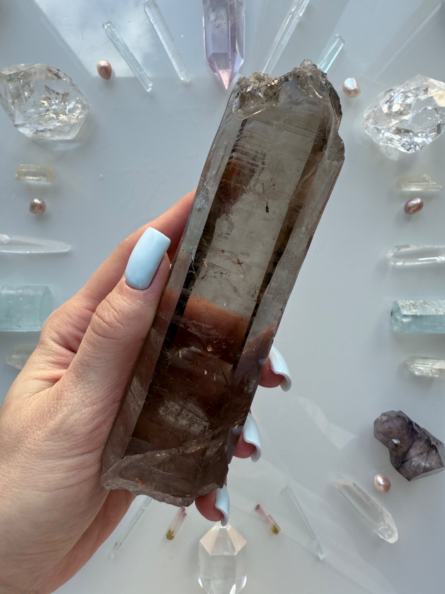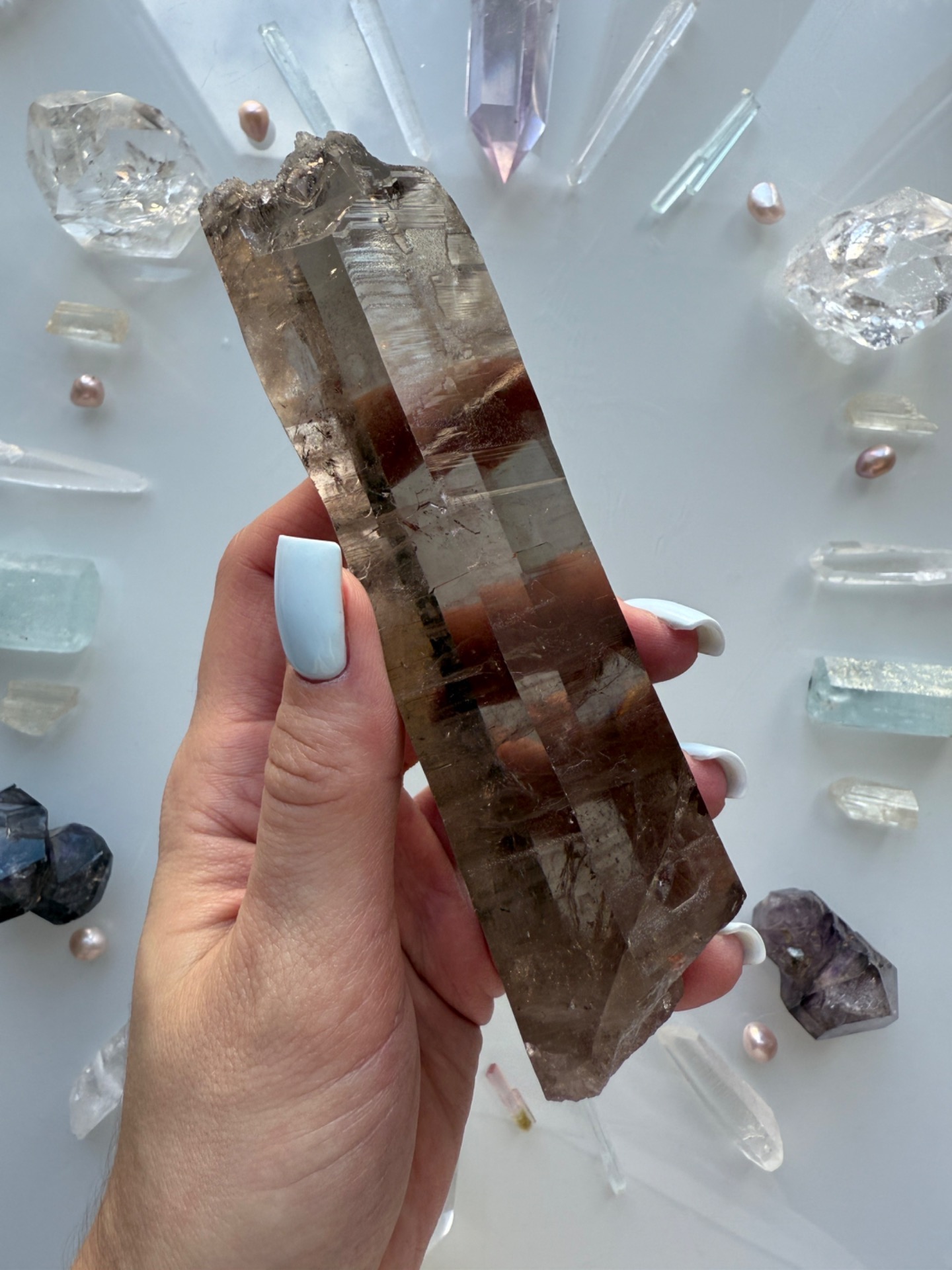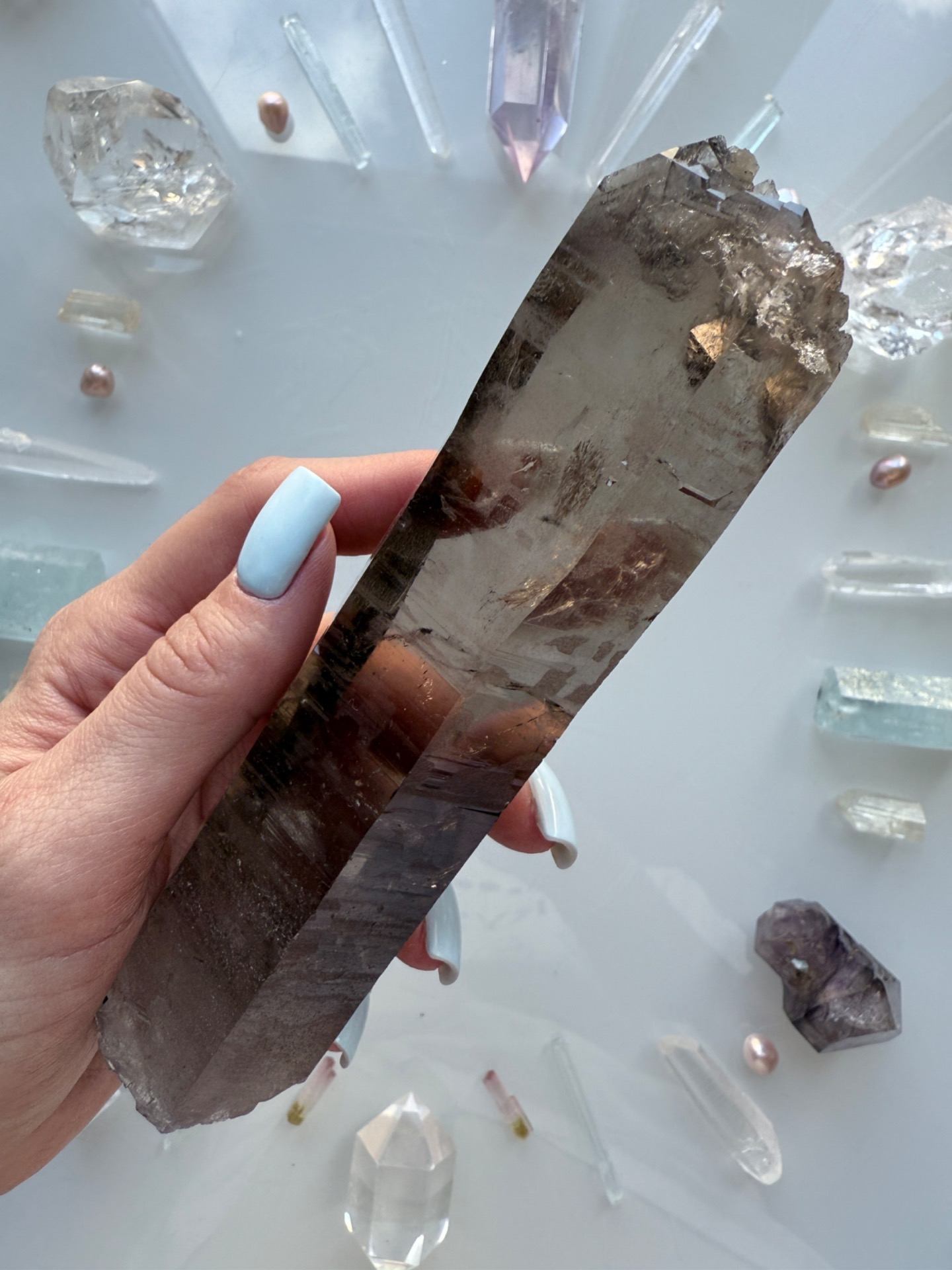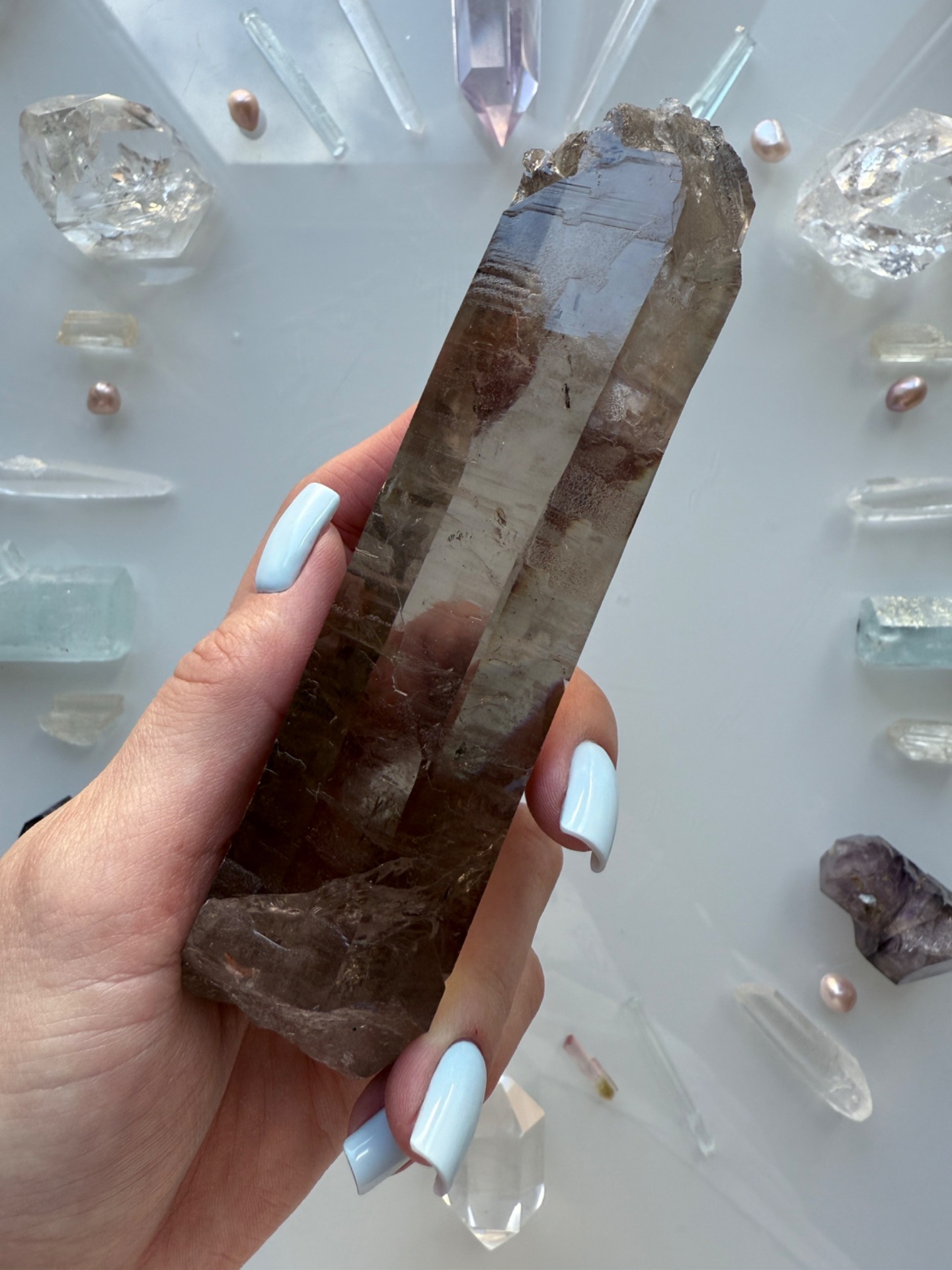 Nádherná surová lemurská záhněda jako hůlka do ruky. Krásná zářící a prostupující, přitom hluboká. Její špička je netradičně ukončena. Má tam otevřený prostor a samoléčitelsky malé špičky....Krystal je zahojený, není tedy odlomený, ale takto přírodně vznikl.