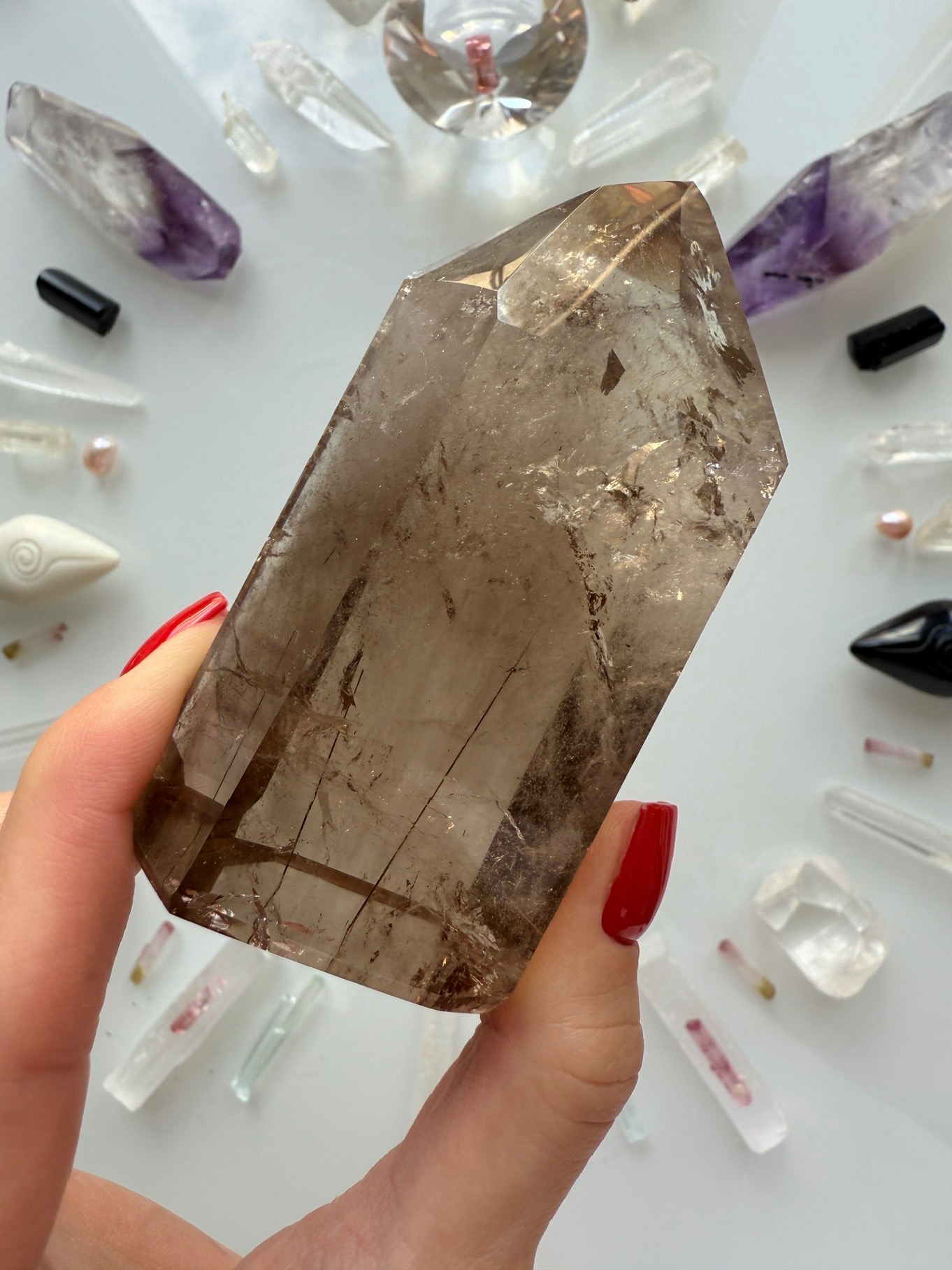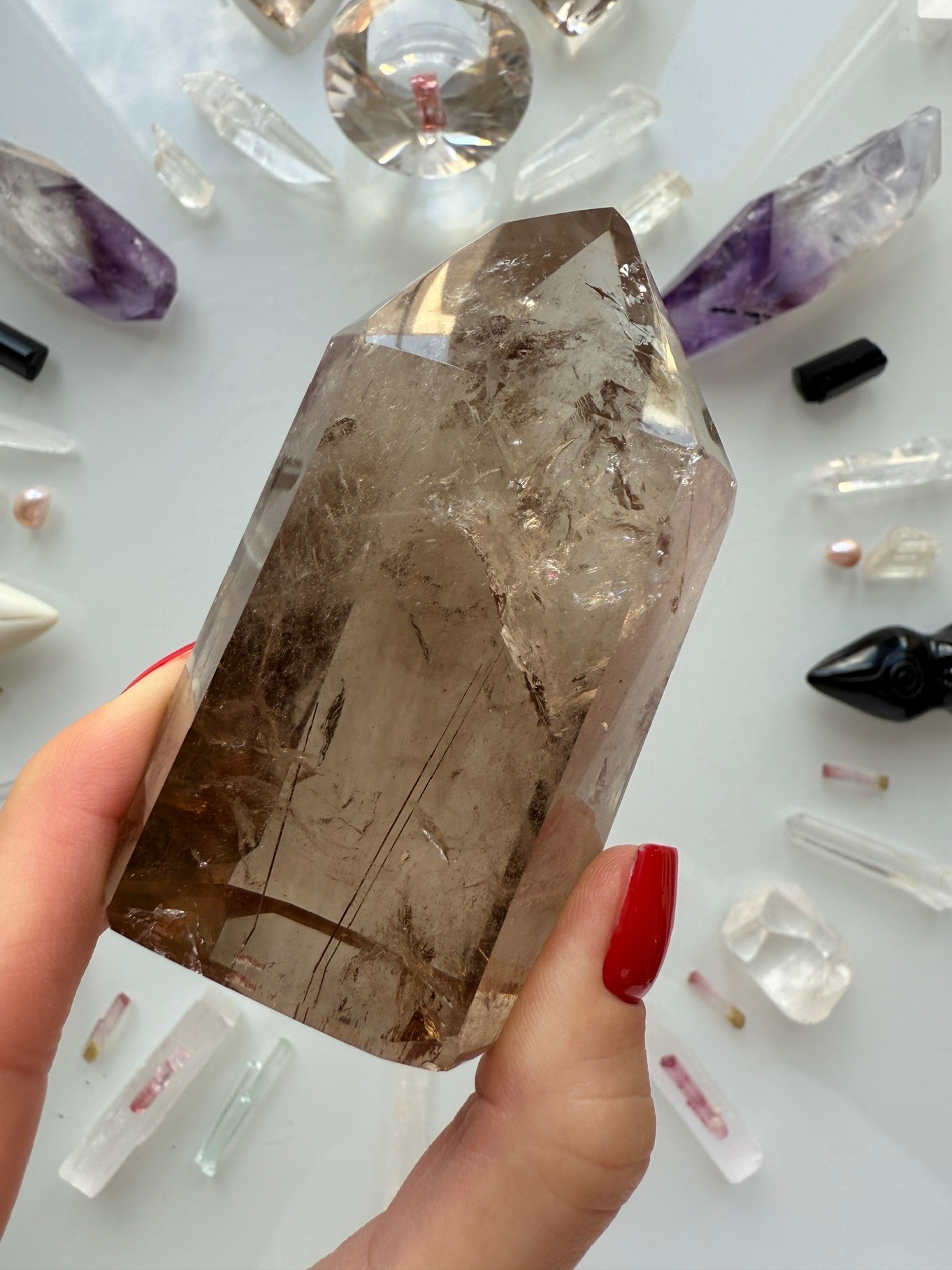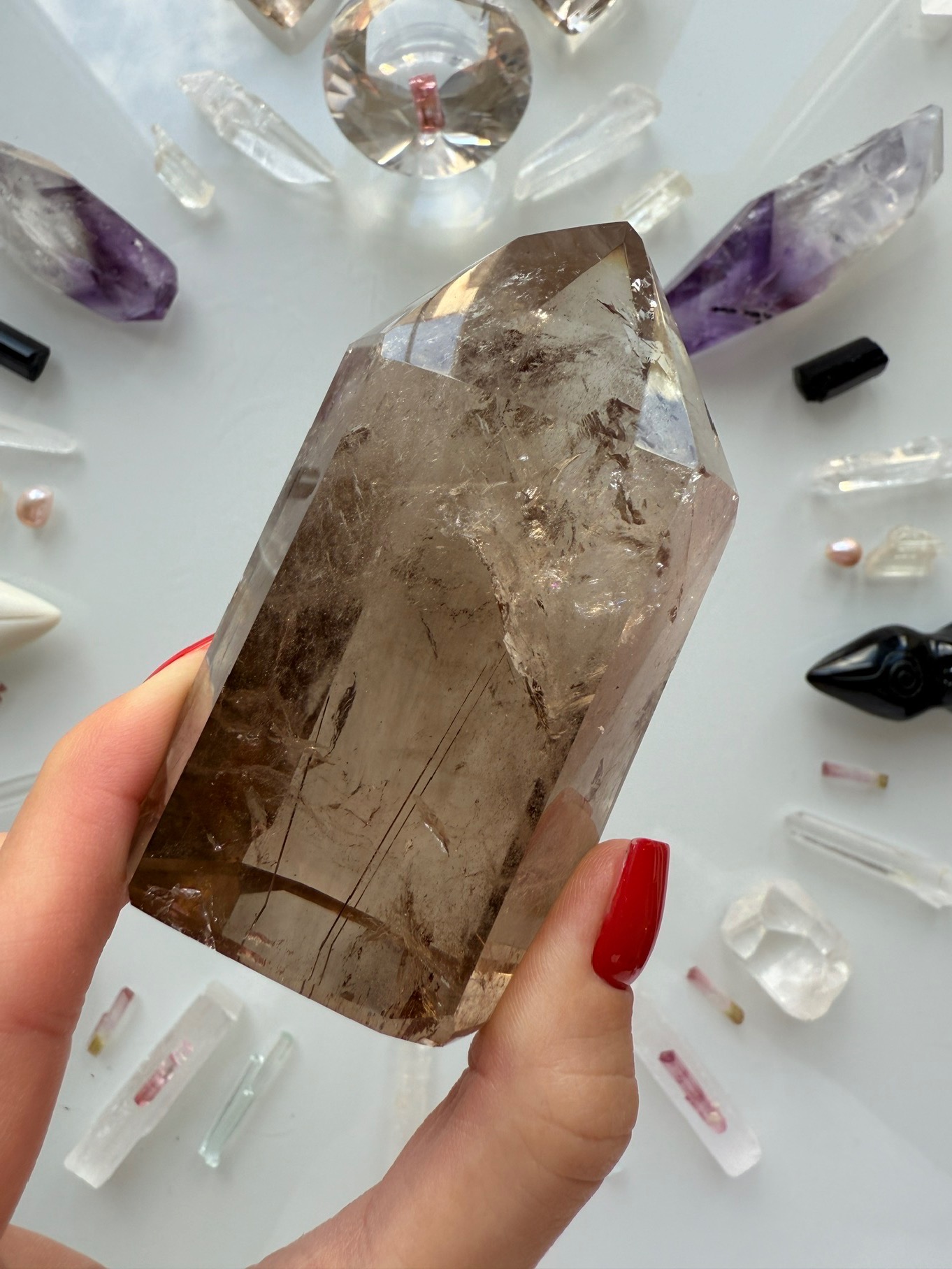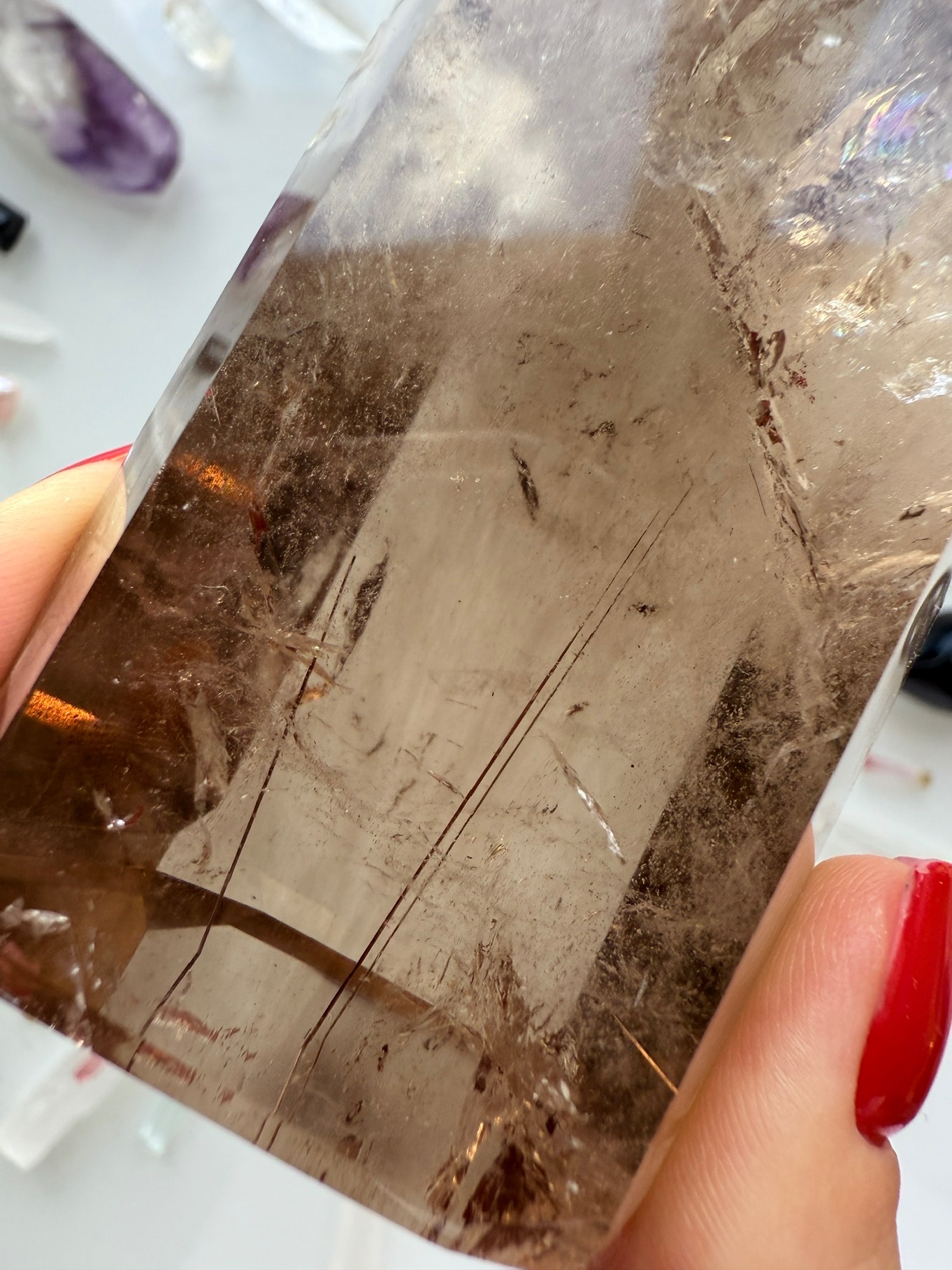 Nádherná špice záhnědy, kterou prochází rutil. Jedná se o silnou kombinaci, kde prostupuje energie rutilu a zesiluje tok záhnědy.