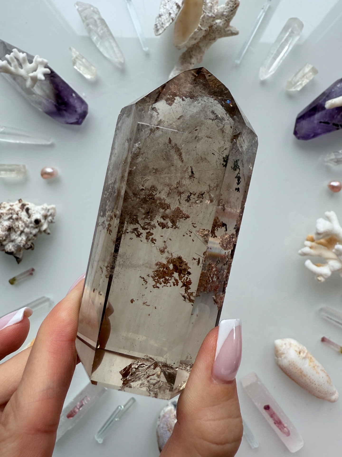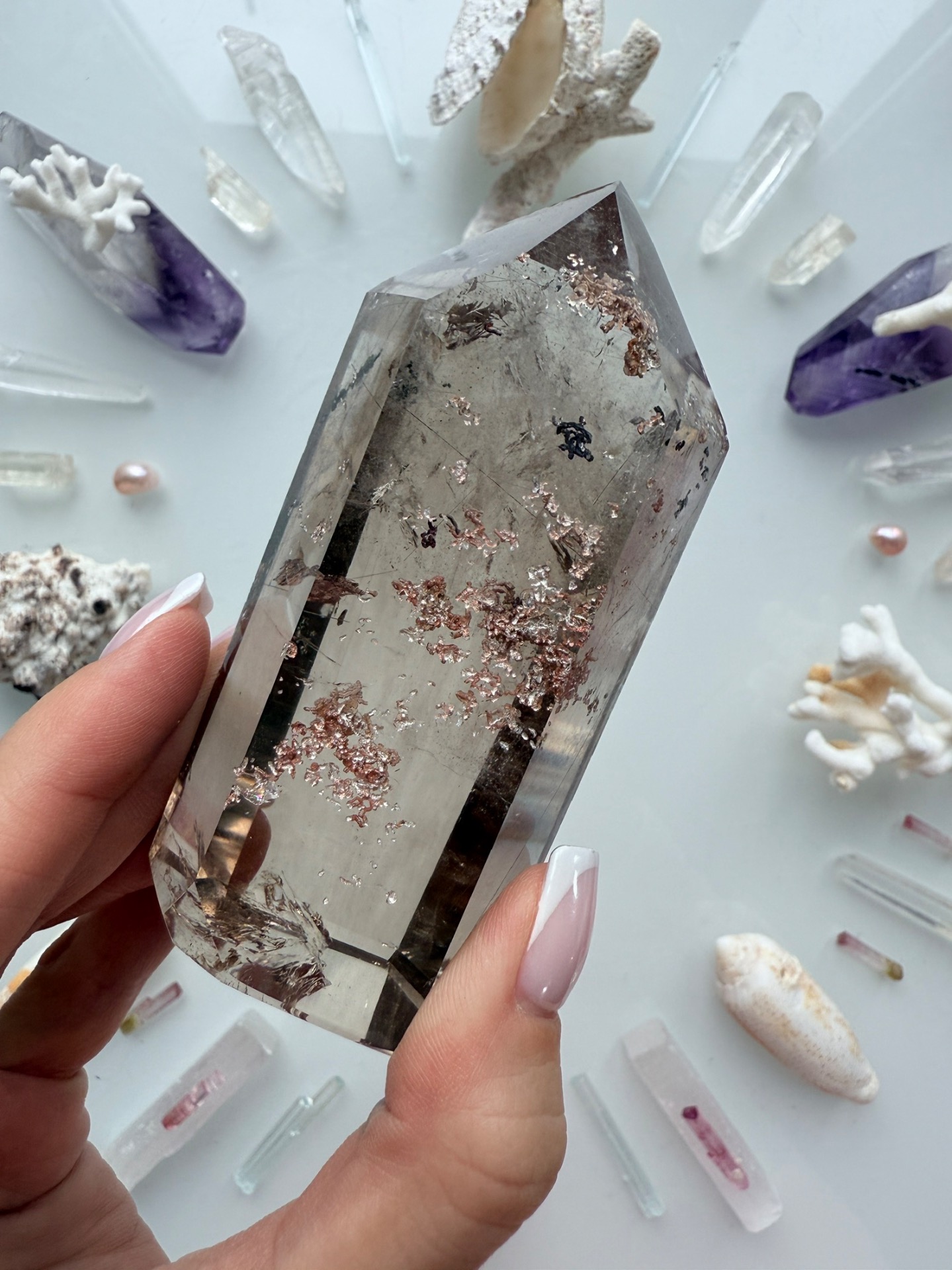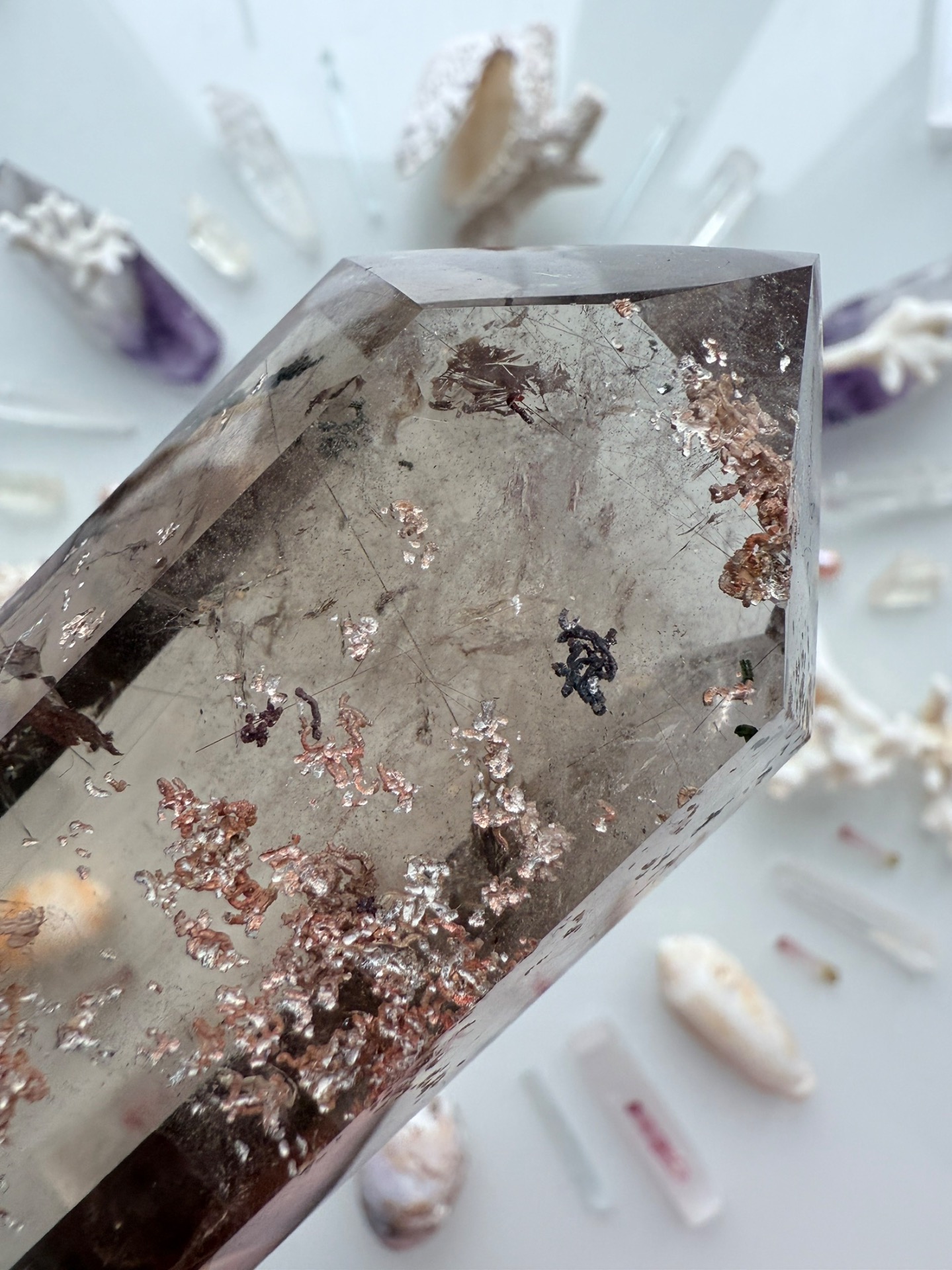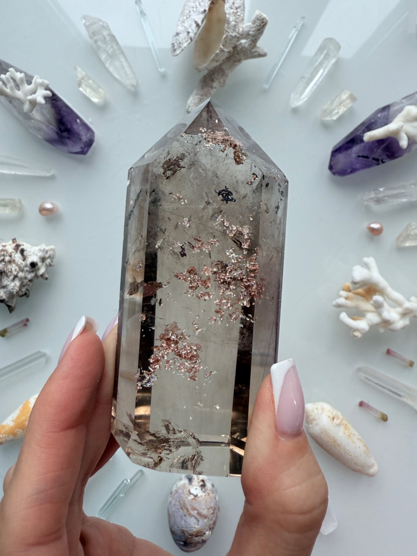 A Uprostřed této geometrie stojí majestátný posvátný krystal oceánské záhnědy, která je spojená s živoucí pamětí vody a také se vzpomínkami a posláním velryb.