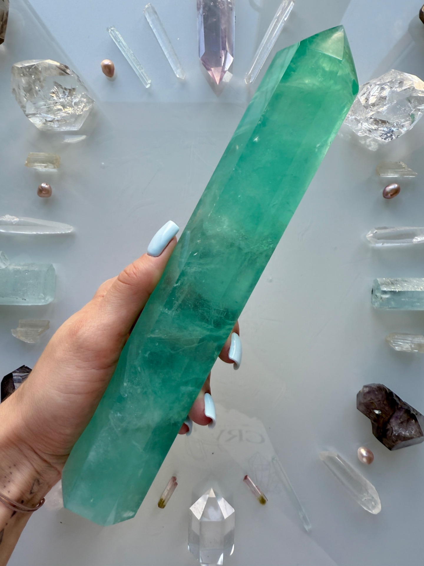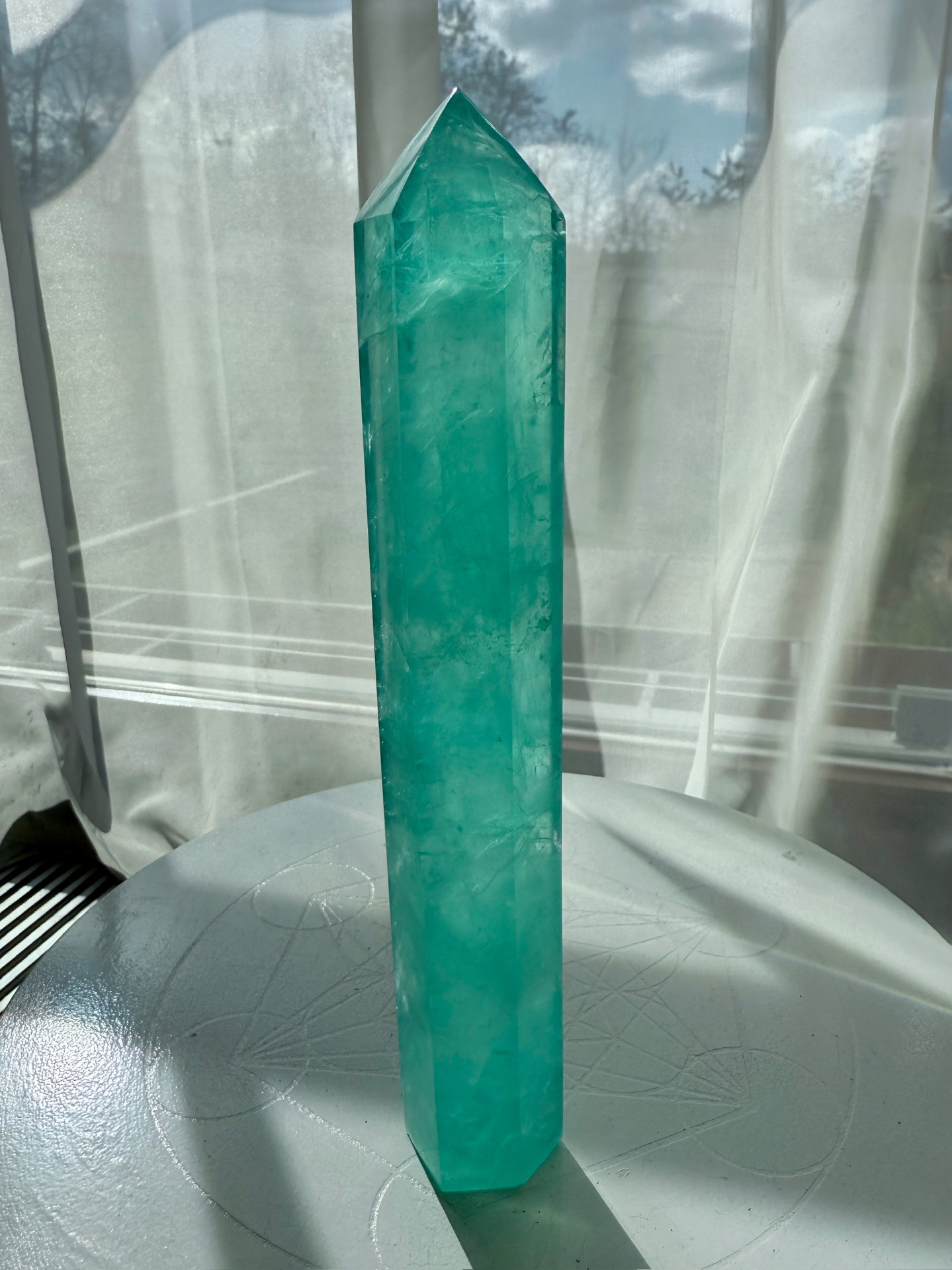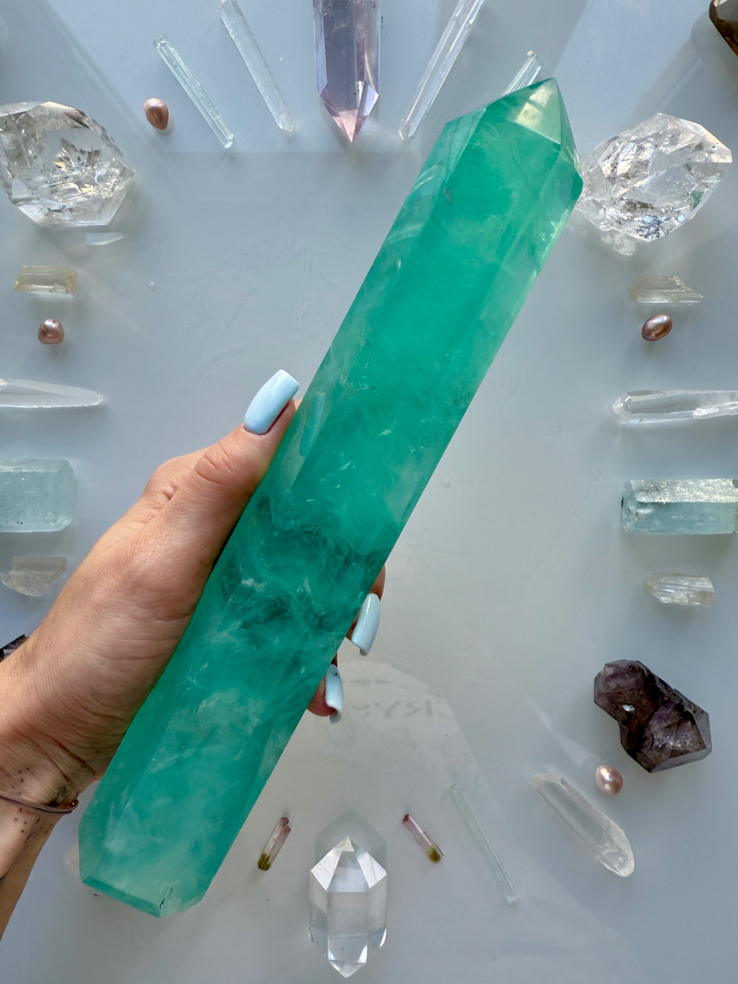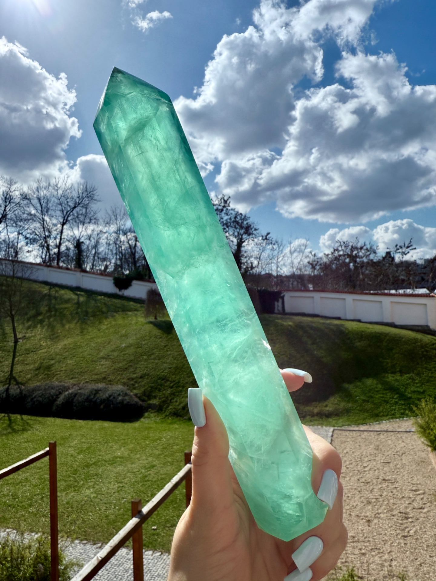 Nádherný zelený fluorit plný vysokovibračních léčivých energií. Taková to větší špice se hodí do prostoru nebo má větší dosah.